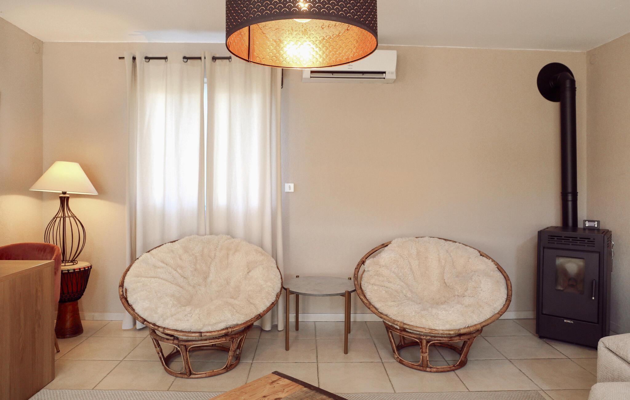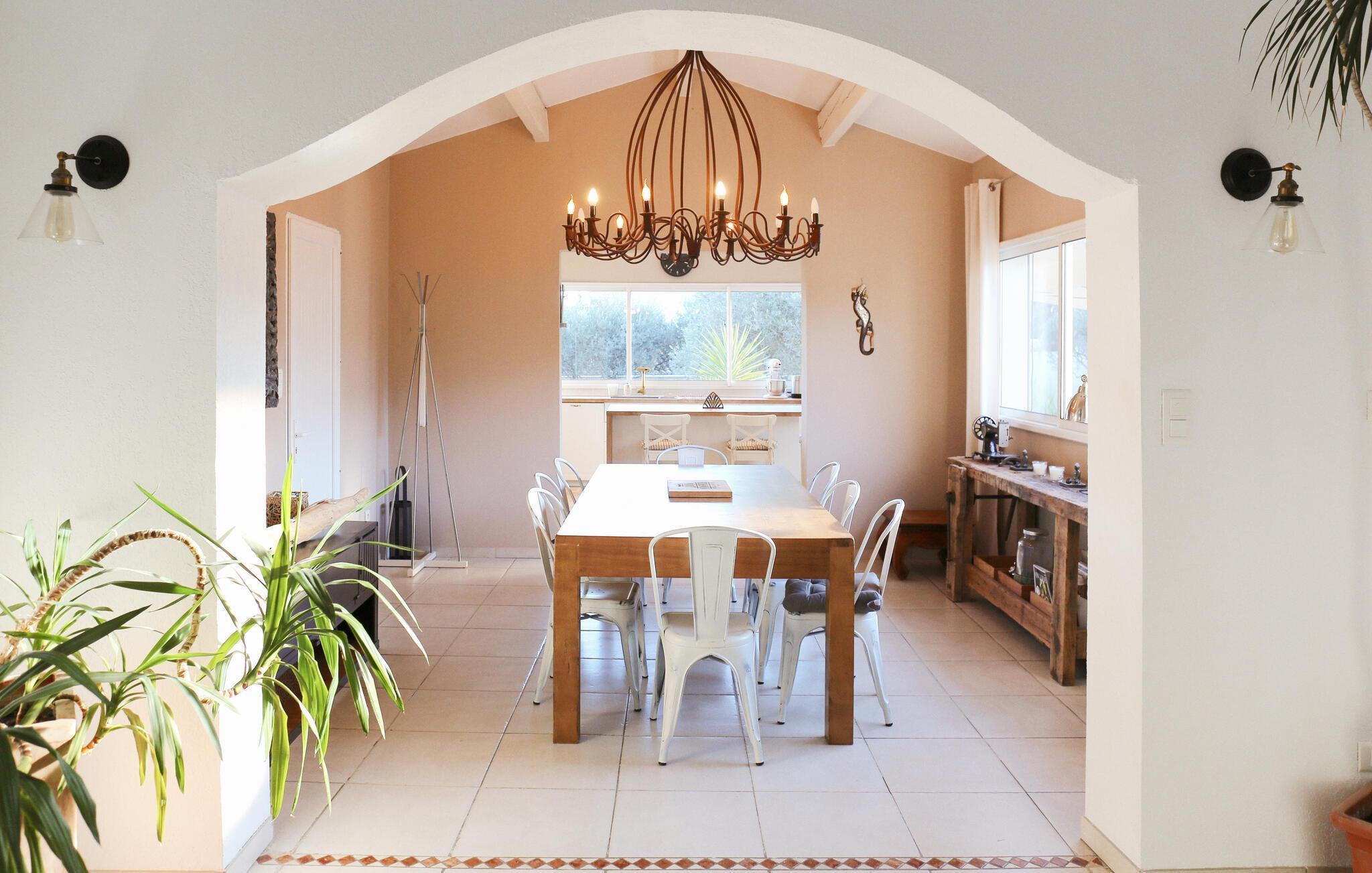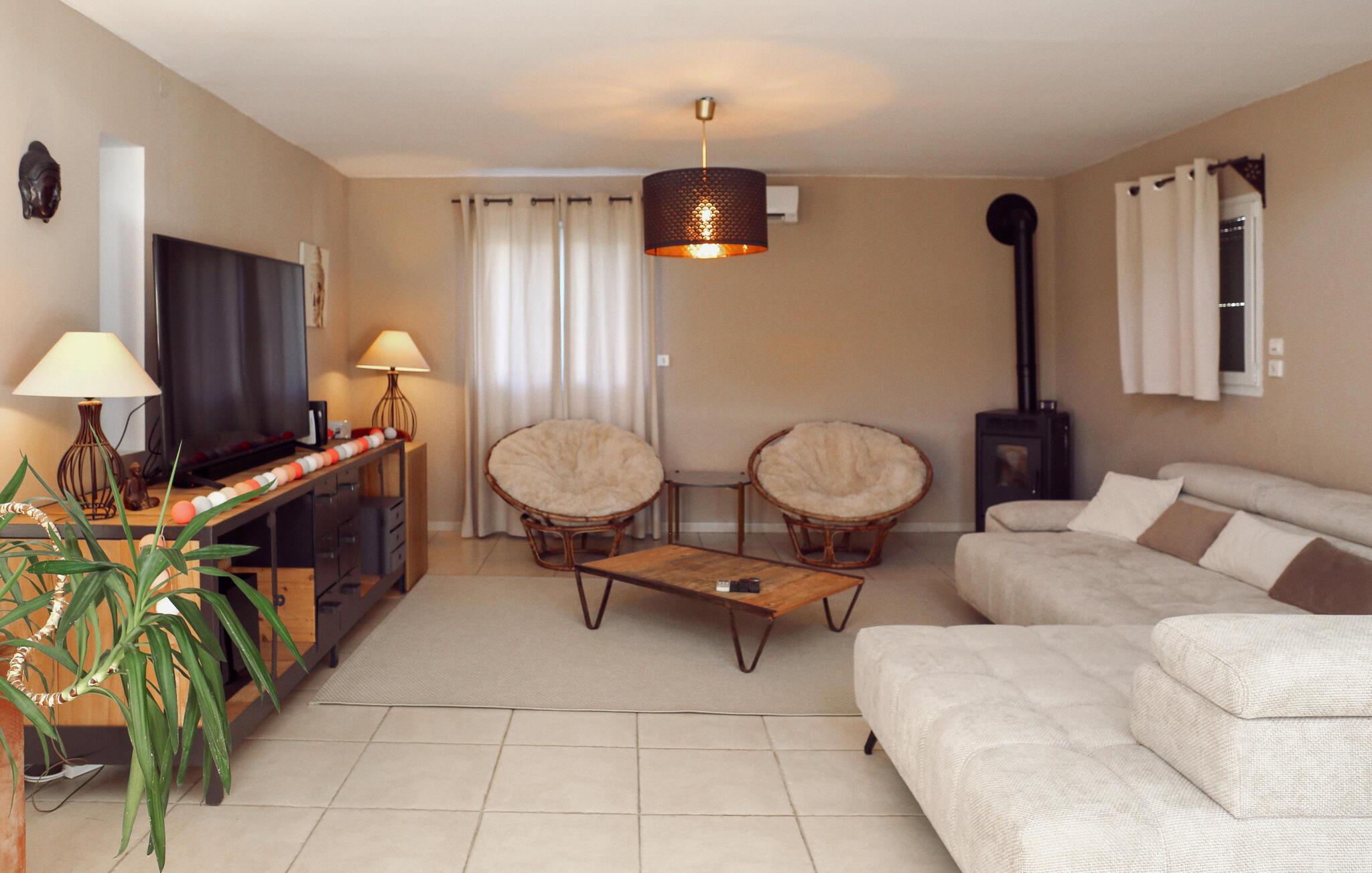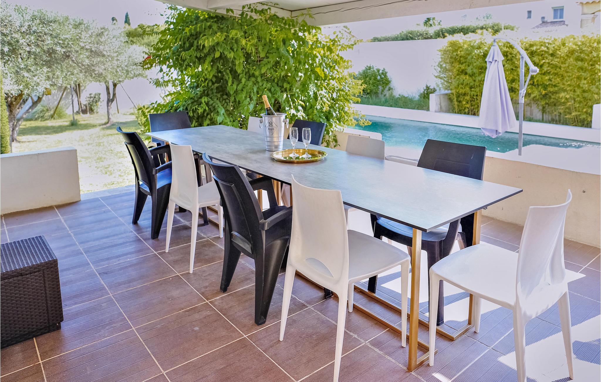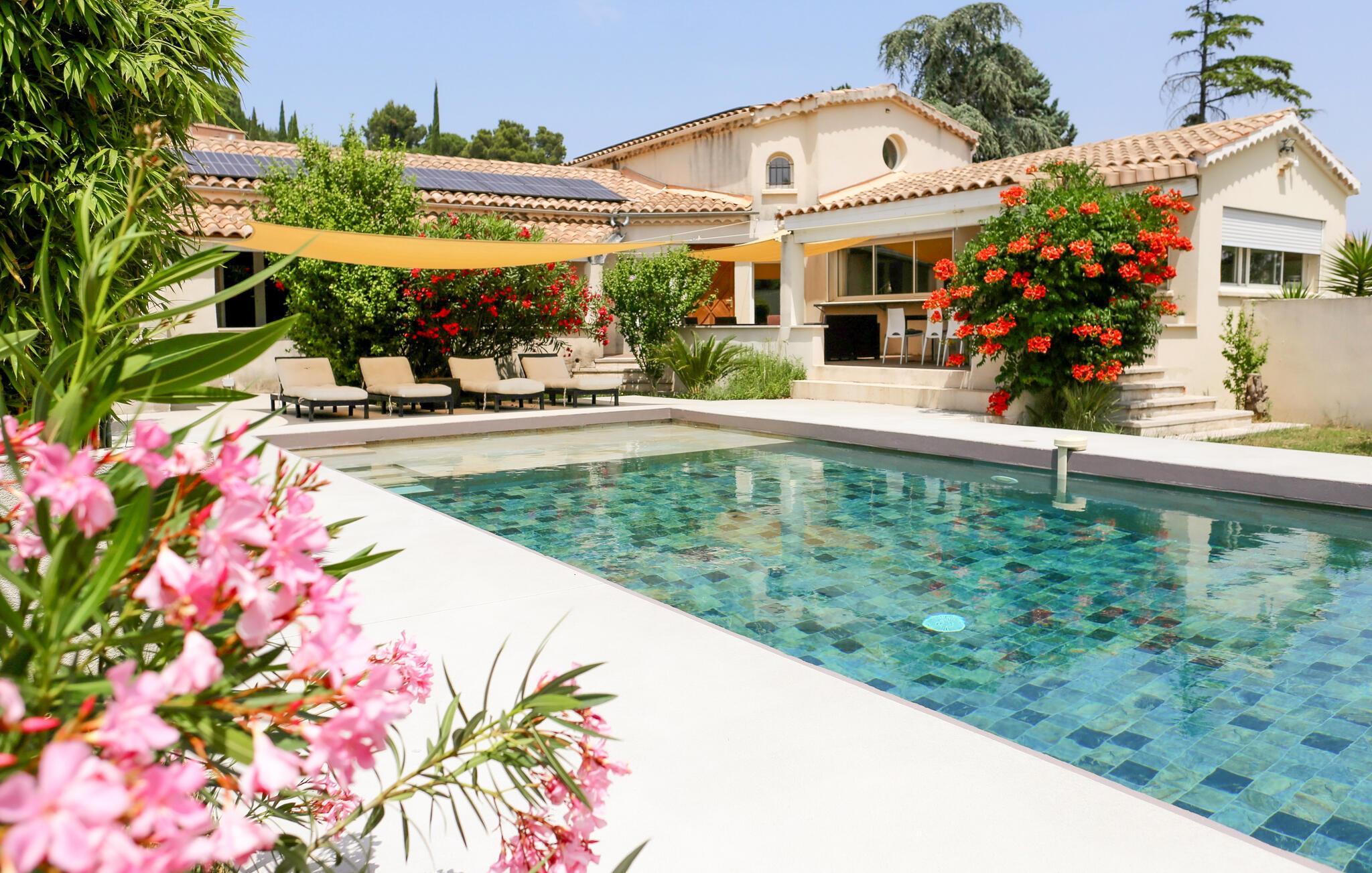 Dieses zeitgenössische Ferienhaus in Rochefort-du-Gard steht in einem 1.600 m² großen Garten mit Blumen und Olivenbäumen. Freuen Sie sich auf einen eigenen Pool umgeben von einer weitläufigen Terrasse. Diese ländliche Lage verspricht Ihnen Ruhe und Erholung, zum Beispiel auf den zum Teil sonnigen, zum Teil schattigen Terrassen. Im Erdgeschoss erwarten Sie ein sehr großzügig geschnittener Wohnraum mit amerikanischer Küche, ein angenehmes Badezimmer sowie zwei Schlafzimmer und ein großer Eingangsbereich. Das dritte Schlafzimmer liegt in der oberen Etage und hat ein eigenes Bad. Das architektonische Erbe von Rochefort-du-Gard ist sehr schön. Erleben Sie u. a. die Gemeindekirche Le Castelas oder das Kloster Sanctuaire Notre-Dame-de-Grâce. Ganz in der Nähe liegt Ihnen die historische Stadt Avignon zu Füßen. Erleben Sie dort den ehemaligen Papstpalast sowie ihre kaputte Brücke, die abrupt in der Rhone endet, und nehmen Sie gegebenenfalls am internationalen Theaterfestival teil. Auch Villeneuve-lès-Avignon mit seiner charmanten Altstadt und der Kapelle Pénitents Gris ist einen Abstecher wert, und in Uzès mit der gemütlichen Place aux Herbes, seinen Arkaden und Märkten tauchen Sie ein in eine mittelalterliche Atmosphäre. Naturliebhaber finden ihr Glück in der Camargue mit ihrer einzigartigen Natur und ihren Stieren, Pferden und Flamingos. Eine tolle Ferienunterkunft für einen gelungenen Urlaub im Gard und Vaucluse.