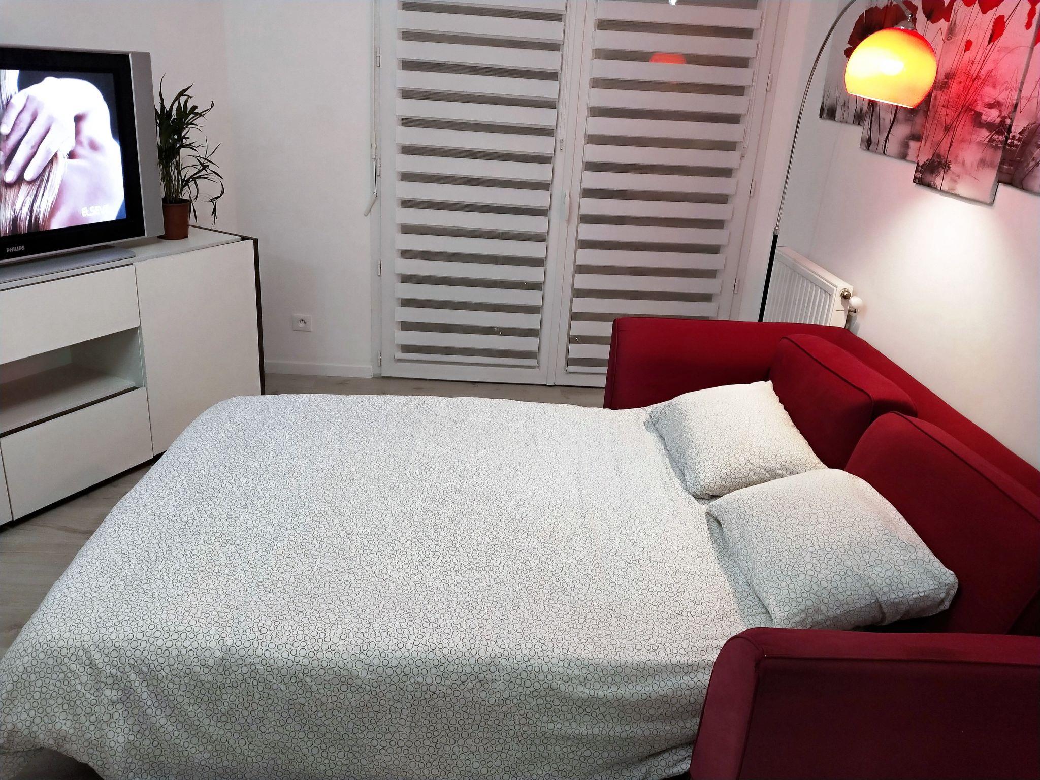 - Wohnzimmer : Ausziehbares Schlafsofa, Couchtisch, Flachbildfernseher, Zugang zur Terrasse.