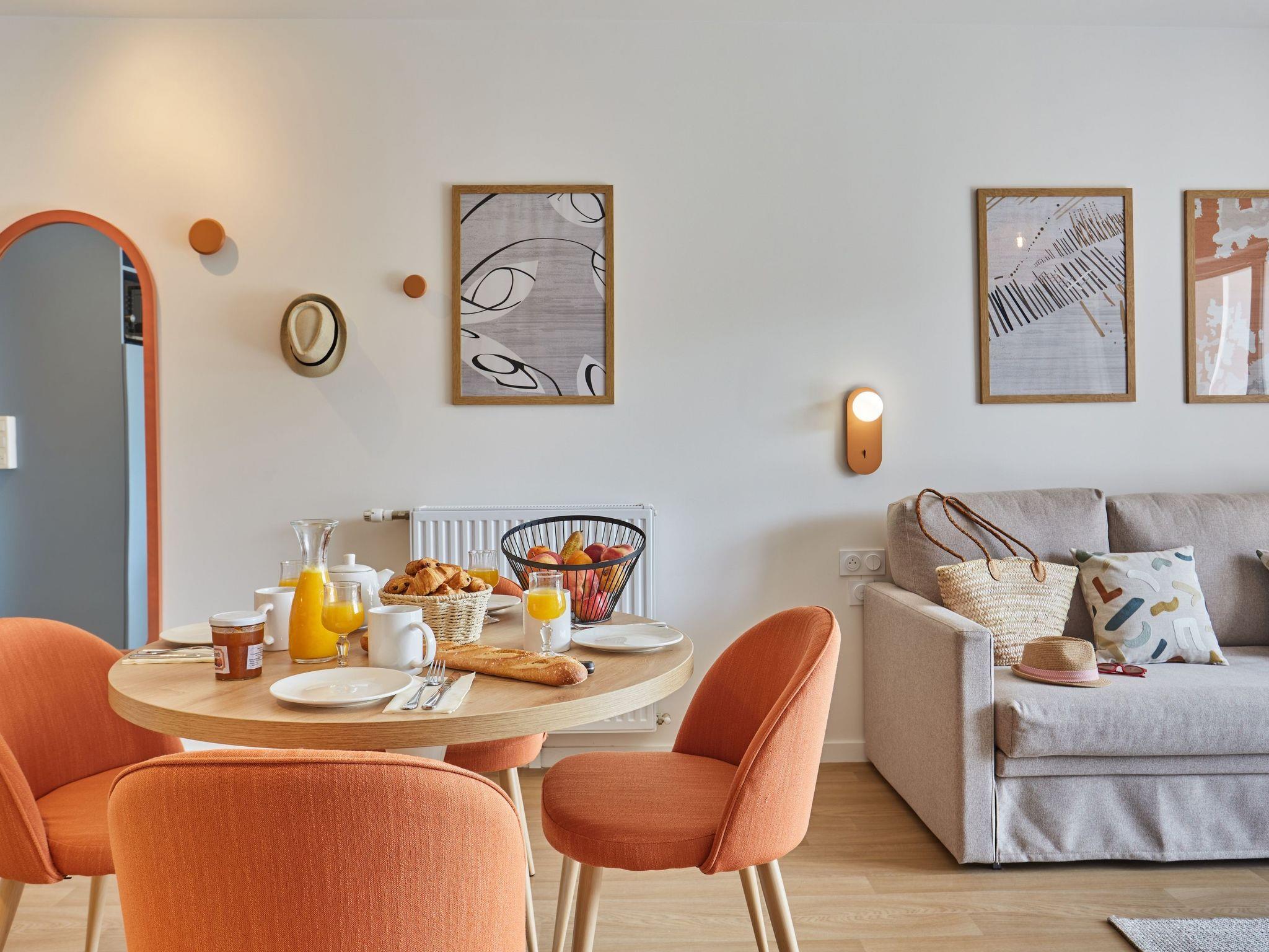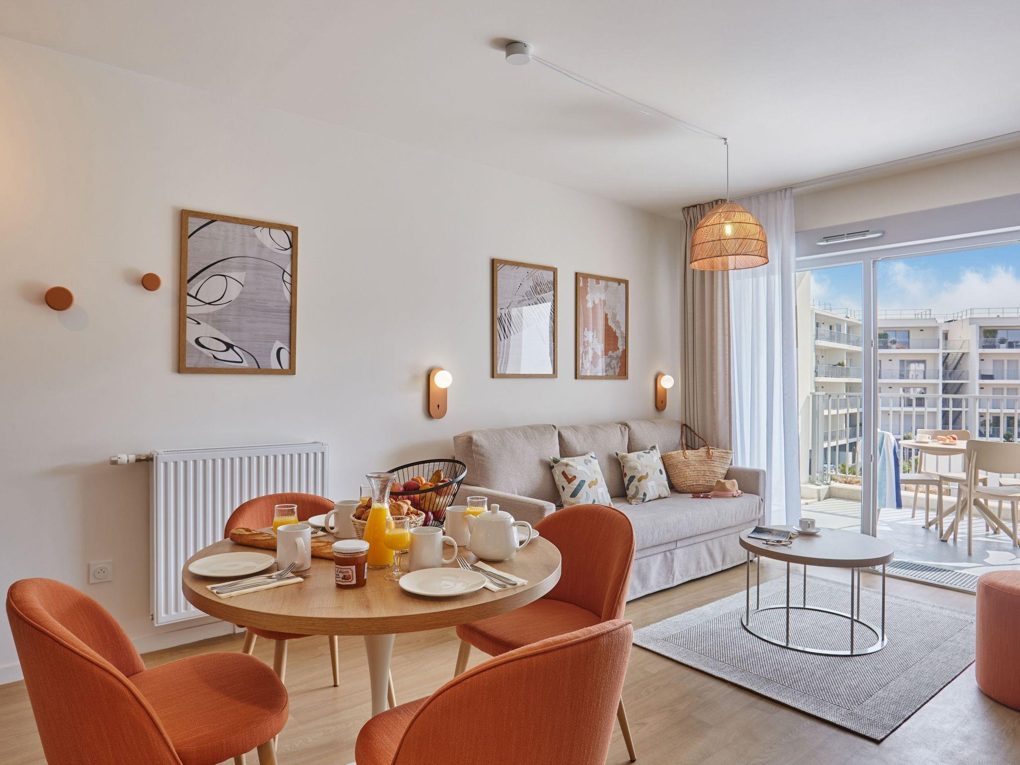 "Odalys Collection L'Orée du Parc", 2-Zimmer-Wohnung 35 m2. Modern eingerichtet: Wohn-/Schlafzimmer mit 2 Schlafmöglichkeiten, Esstisch und TV. 1 Zimmer mit 1 franz. Bett (1 x 160 cm, Länge 200 cm). Kleine, offene Küche (Geschirrspüler, 4 Glaskeramikplatten, Toaster, Wasserkocher, elektrische Kaffeemaschine, Kapseln für die Kaffeemaschine (Capsules), Kombinationsmikrowelle). Sep. WC, Bad oder Dusche. E-Heizung. Balkon oder Terrasse. Terrassenmöbel. Zur Verfügung: Kinderhochstuhl, Babybett (extra). Internet (WLAN, gratis). Parkplatz (extra, überdacht). Bitte beachten: Nichtraucher-Unterkunft. Maximal 1 Haustier/Hund erlaubt. Rauchmelder, Feuerlöscher.