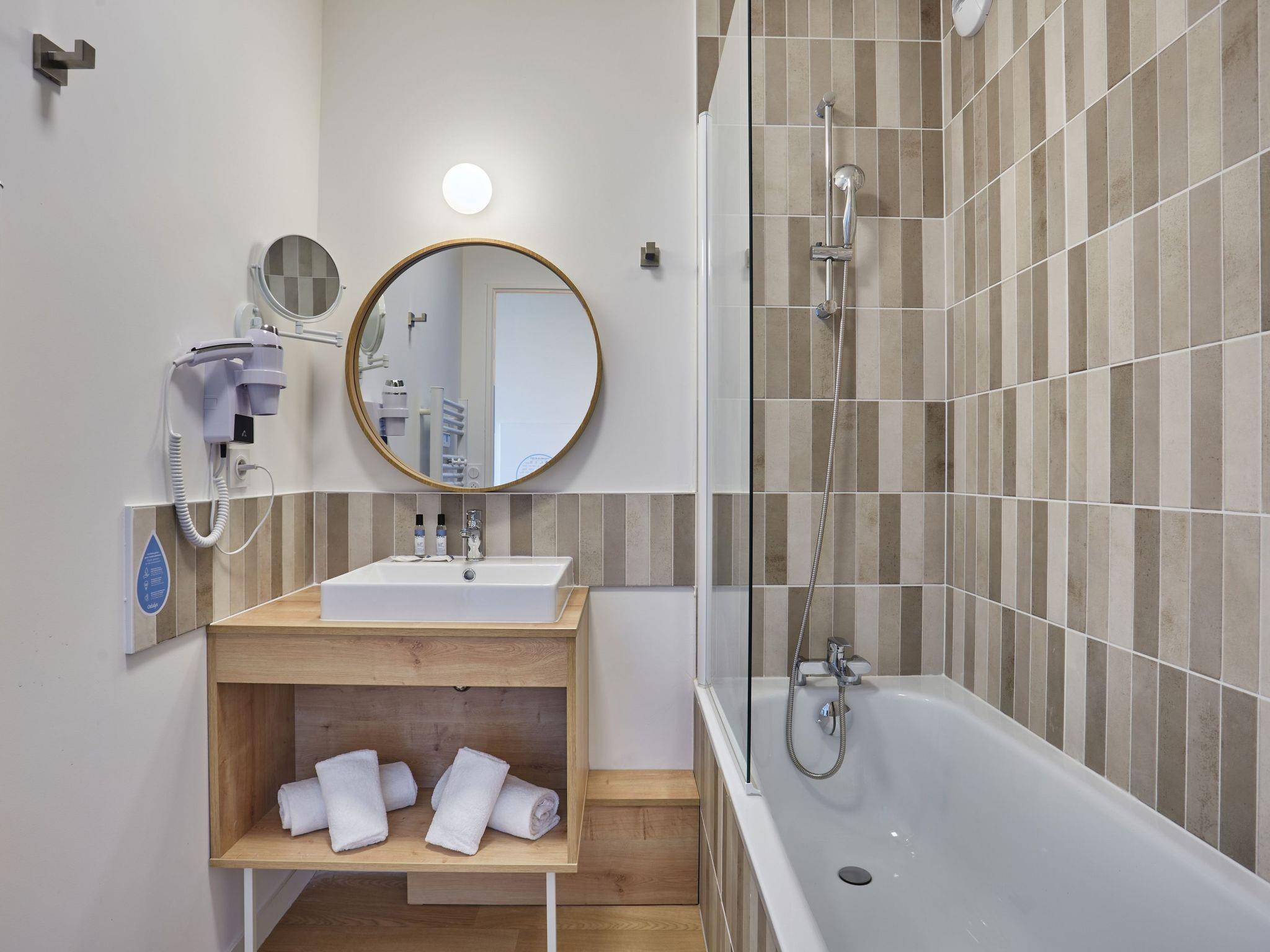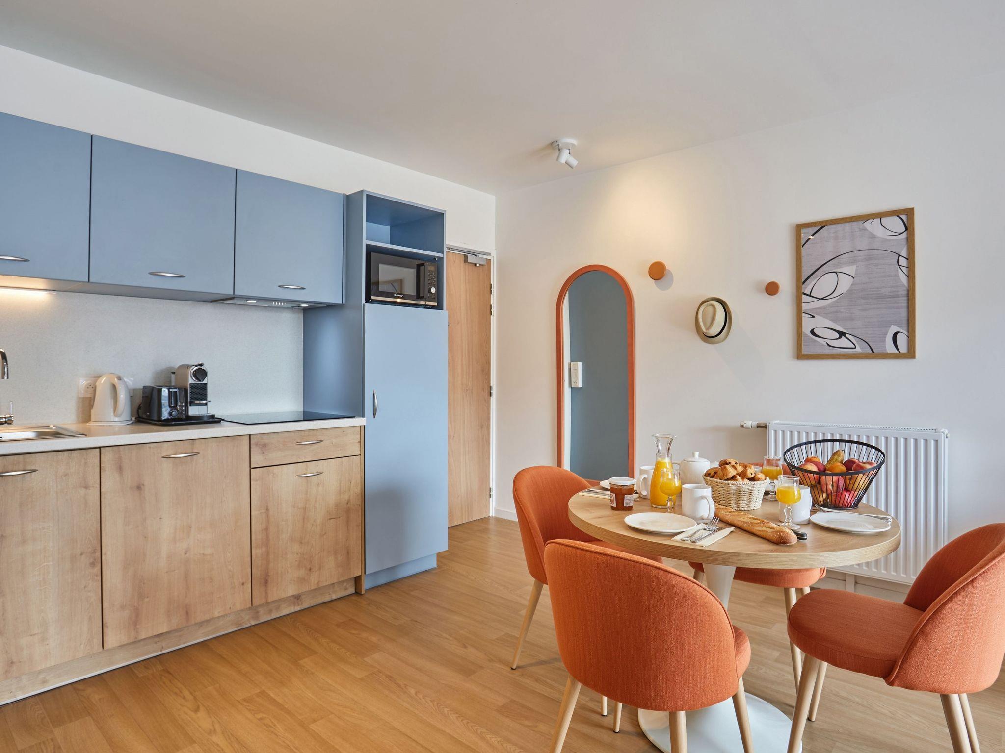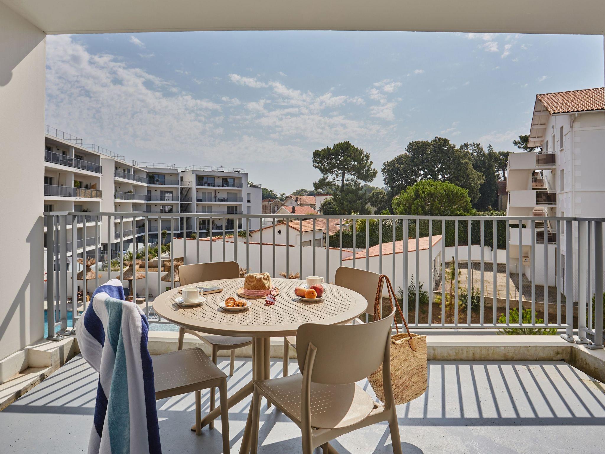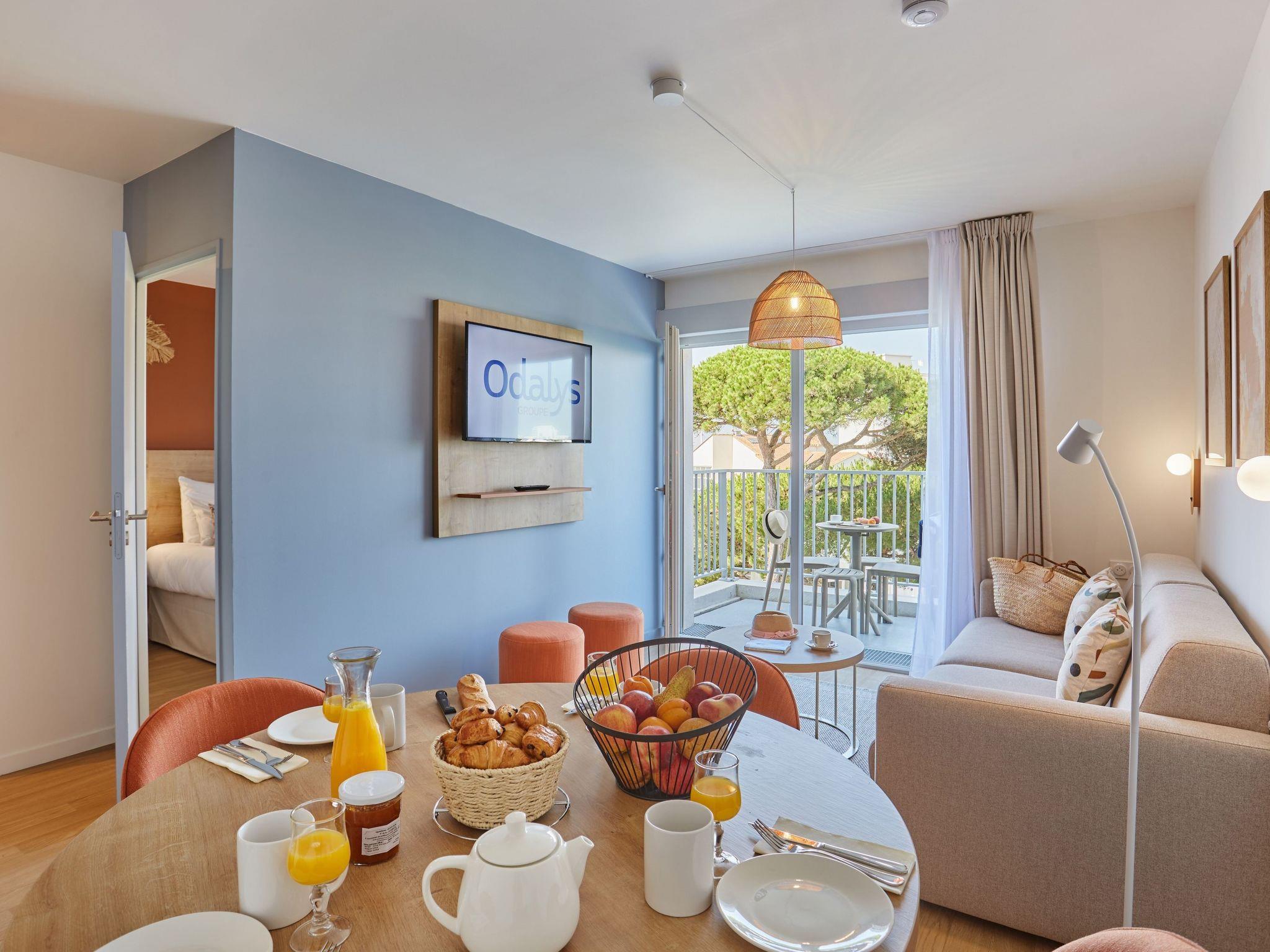 "Odalys Collection L'Orée du Parc", 3-Zimmer-Wohnung 45 m2. Modern eingerichtet: Wohn-/Schlafzimmer mit 1 Doppeldiwanbett, Esstisch und TV. 1 Zimmer mit 1 franz. Bett (1 x 160 cm, Länge 200 cm). 1 Zimmer mit 2 Schlafmöglichkeiten. Kleine, offene Küche (Geschirrspüler, 4 Glaskeramikplatten, Toaster, Wasserkocher, elektrische Kaffeemaschine, Kapseln für die Kaffeemaschine (Capsule), Kombinationsmikrowelle). Sep. WC, Bad oder Dusche. E-Heizung. Balkon oder Terrasse. Terrassenmöbel. Zur Verfügung: Kinderhochstuhl, Babybett (extra), Haartrockner. Internet (WLAN, gratis). Parkplatz (extra). Bitte beachten: Nichtraucher-Unterkunft. Maximal 1 Haustier/Hund erlaubt. Rauchmelder, Feuerlöscher.
