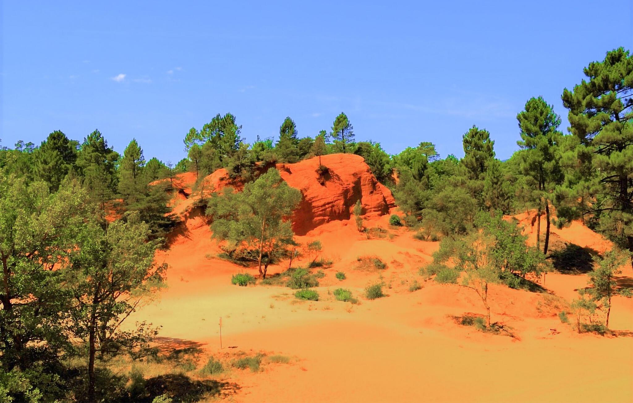 Erkunden Sie das charmante Dorf Rustrel und spazieren Sie durch die ruhigen Gassen mit ihren typisch provenzalischen Häusern. Besuchen Sie den berühmten „Colorado Provençal“ und bestaunen Sie die beeindruckenden Ockerfelsen in leuchtenden Rot-, Orange- und Gelbtönen. Wandern Sie auf gut ausgeschilderten Wegen durch diese einzigartige Landschaft und genießen Sie die weiten Ausblicke.