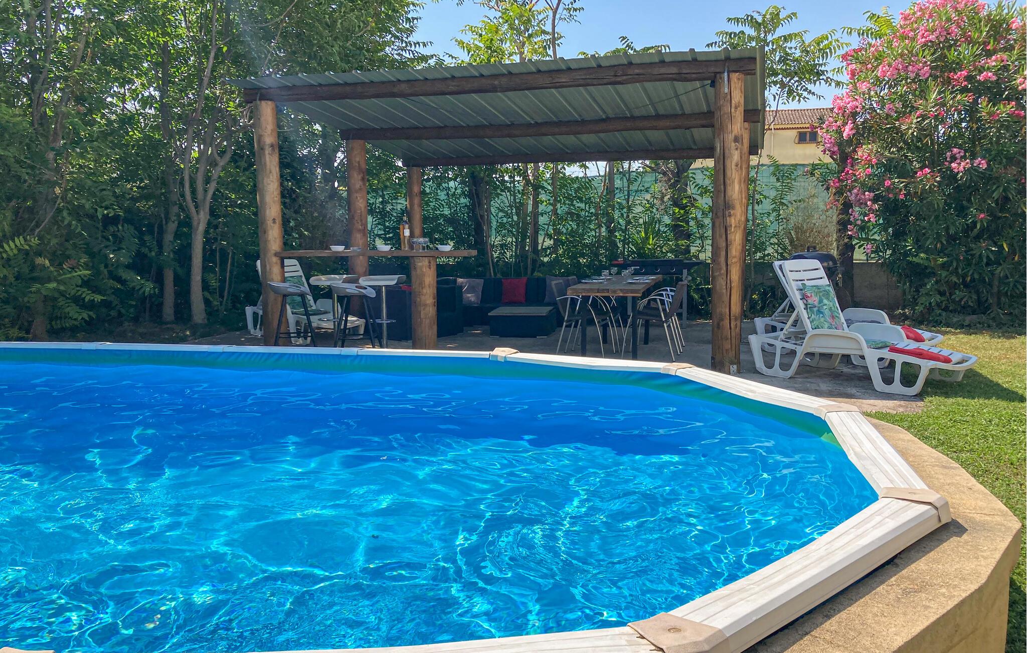 Genießen Sie die Sonne auf der angenehmen Terrasse und kühlen Sie sich anschließend im Aufstellpool ab. Abends werden Sie sicherlich viel Freunde am Grill haben. Der sehr helle Innenbereich überzeugt durch eine komfortable und gepflegte Einrichtung und ist ein schöner Ort zum Relaxen.