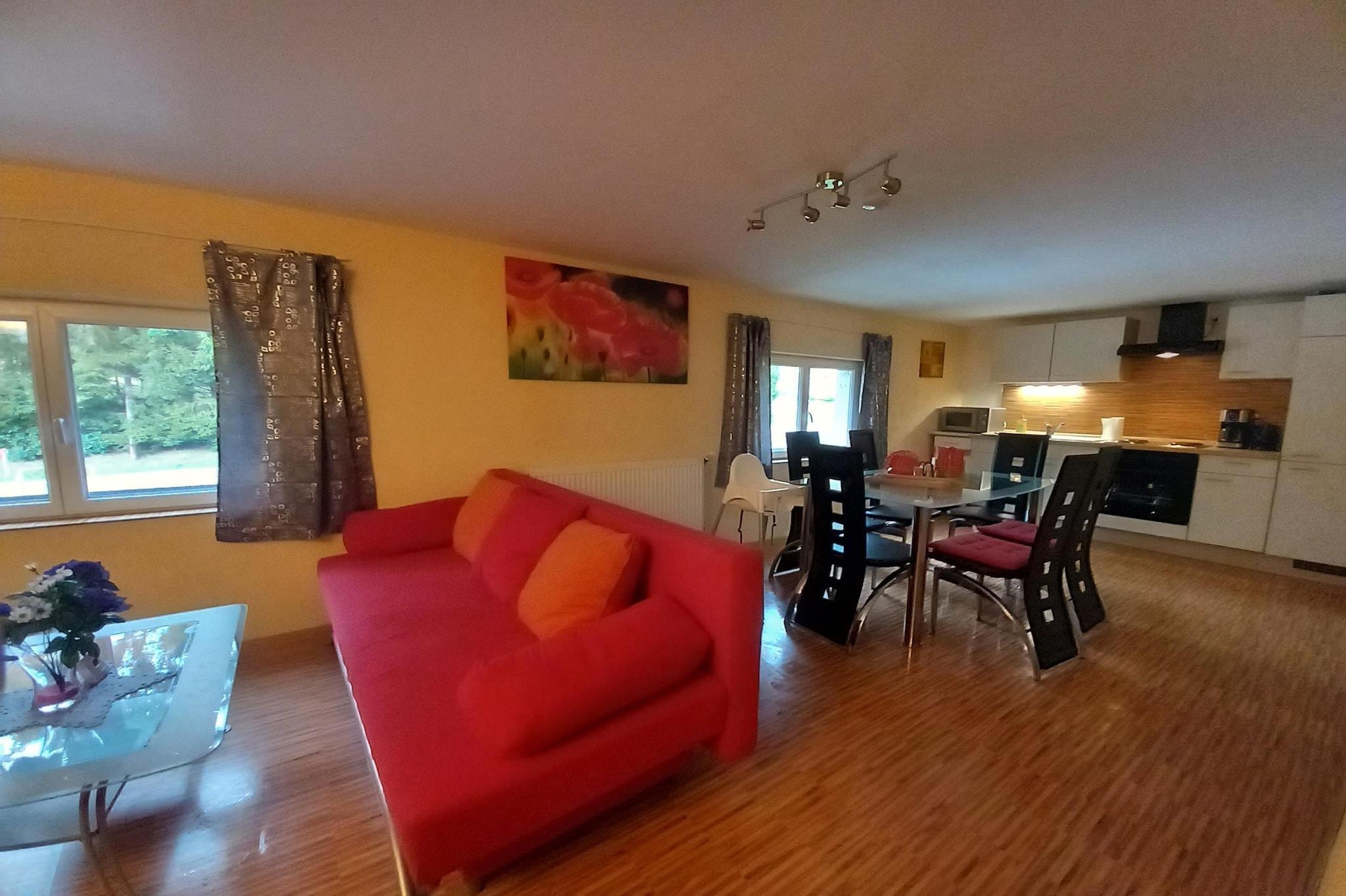 Mitten in der Natur in Turquestein-Blancrupt, nur 7 km von Saint-Quirin entfernt, bietet diese geräumige, 120 m² große Ferienwohnung einen ruhigen Rückzugsort in der Region Elsass-Vogesen-Lothringen. Sie befindet sich im ersten Stock eines Privathauses und verfügt über einen eigenen Eingang, einen umzäunten Garten und einen eigenen Parkplatz. Im Innenbereich erwarten Sie zwei helle Schlafzimmer, ein großer Wohn-Essbereich mit voll ausgestatteter Küche sowie ein Badezimmer mit Dusche und Waschmaschine. Eine breite Treppe mit Geländer und Treppenschutz sorgt für die Sicherheit kleiner Kinder. Bettwäsche wird gestellt. Das 65 Hektar große Grundstück grenzt an Wald und Berge und verfügt über zwei Teiche und einen Bach, die sich ideal für Spaziergänge und zum Spielen in der Natur eignen. Familien und Hunde sind herzlich willkommen. Der 400 m² große Vorgarten verfügt über eine Terrasse, während der hintere Garten sich zu einer weitläufigen Grünfläche öffnet. Für Unterhaltung ist im 50 m² großen Freizeitraum mit Billard, Darts und Bar sowie Tischtennis und Boccia vor Ort gesorgt. Zu den nahegelegenen Badeseen gehören Saint-Quirin (7 km), Abreschviller (12 km) und Étang du Stock (Langatte, 30 km). Ob Sie wandern, entspannen oder mit Ihren Lieben spielen - dieses Haus bietet einen gemütlichen und aktiven Rückzugsort in der Natur.