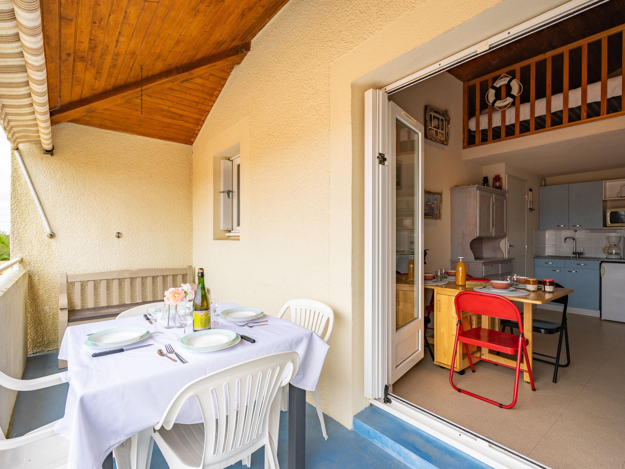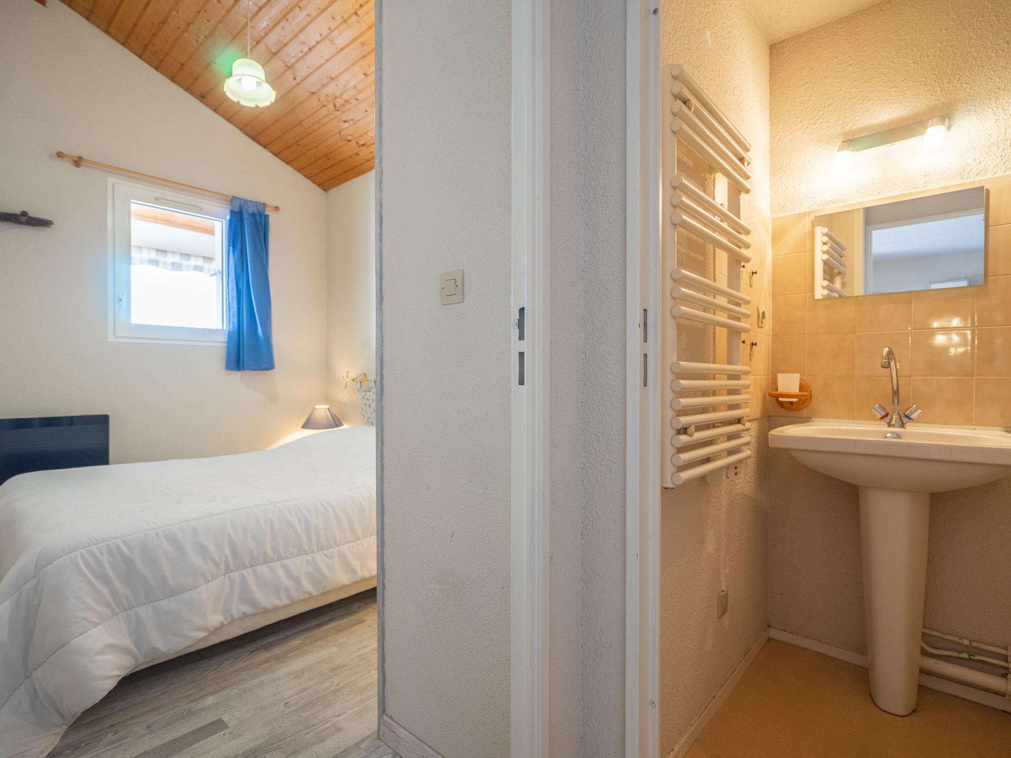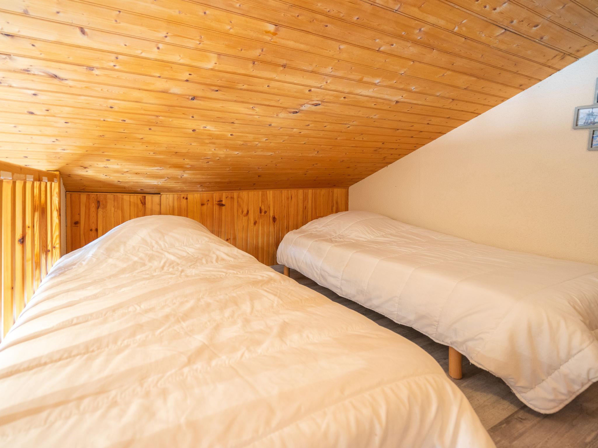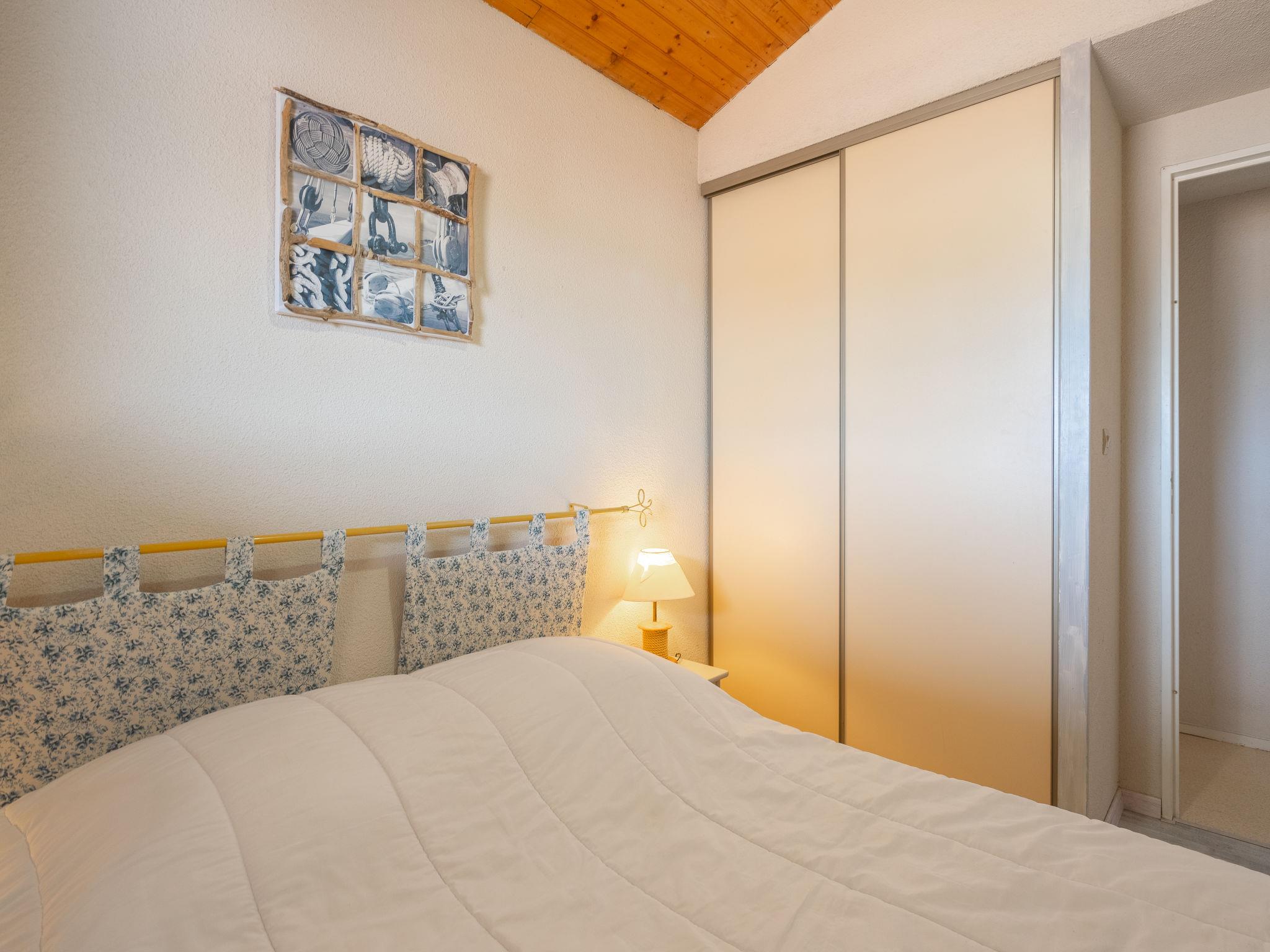 2-Zimmer-Maisonette-Wohnung 32 m2 im 2. Stock. Wohn-/Esszimmer mit TV (Flachbildschirm). Ausgang zur Terrasse. 1 Zimmer mit 1 franz. Bett (1 x 140 cm, Länge 190 cm). Kochnische (2 Kochplatten, Mikrowelle, elektrische Kaffeemaschine). Dusche, sep. WC. E-Heizung. Obergeschoss: abgeschrägte, offene Galerie mit 2 Betten (80 cm, Länge 190 cm). Terrasse 9 m2. Terrassenmöbel. Sicht auf das Schwimmbad. Zur Verfügung: Internet (WLAN, extra). Bitte beachten: Rauchmelder. Anstelle eines abgeschlossenen Schlafzimmers befinden sich manche Schlafplätze in einem offenen Bereich (Galerie, Nische etc.).