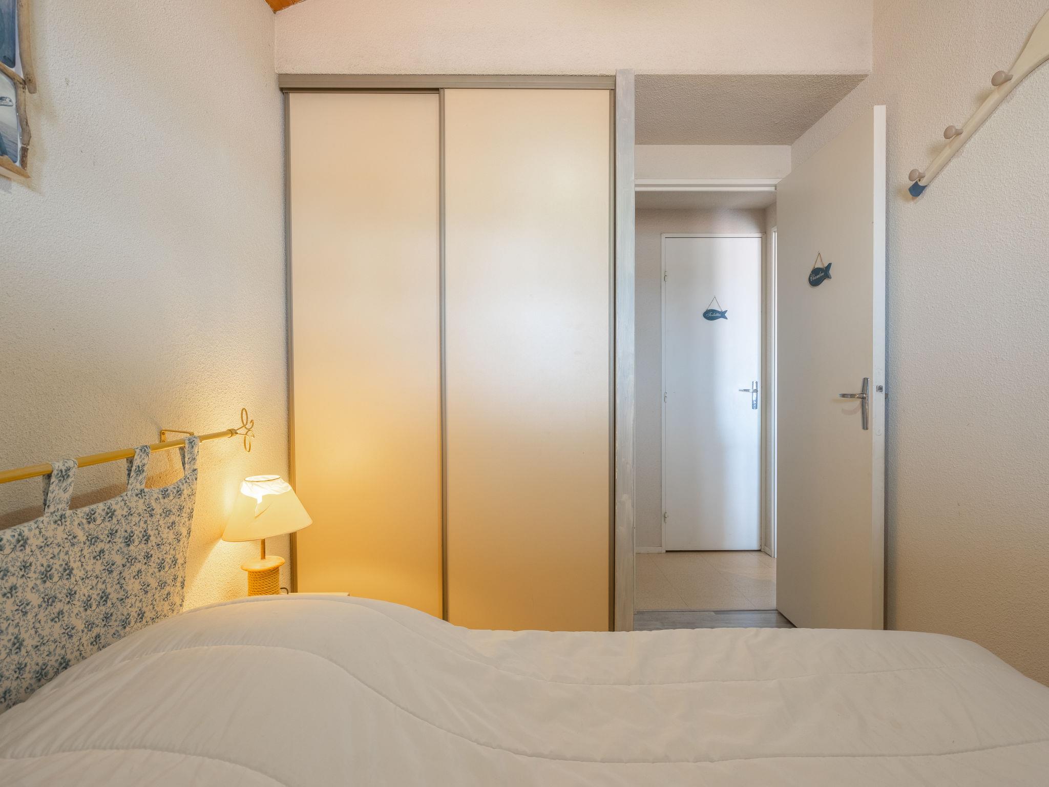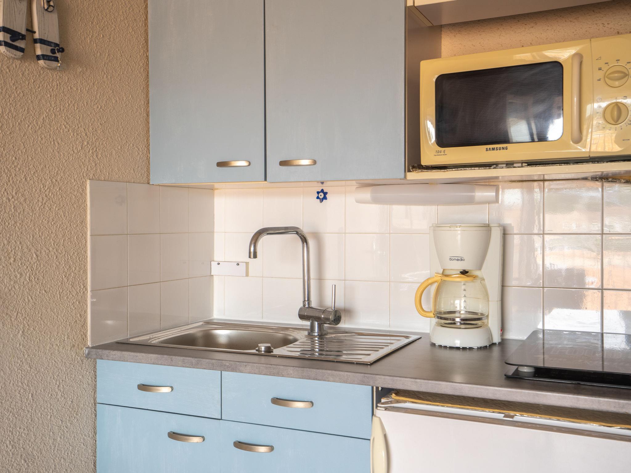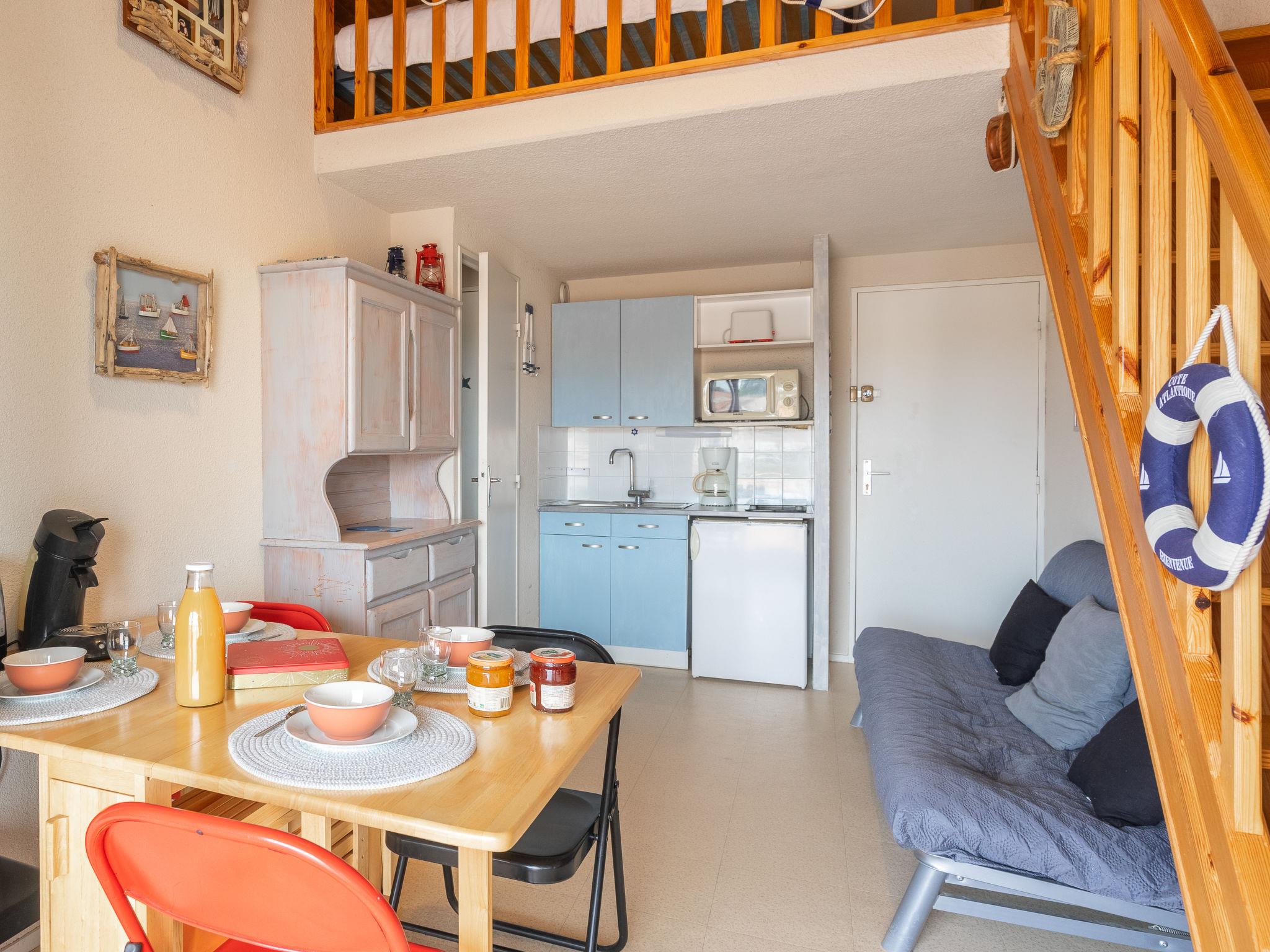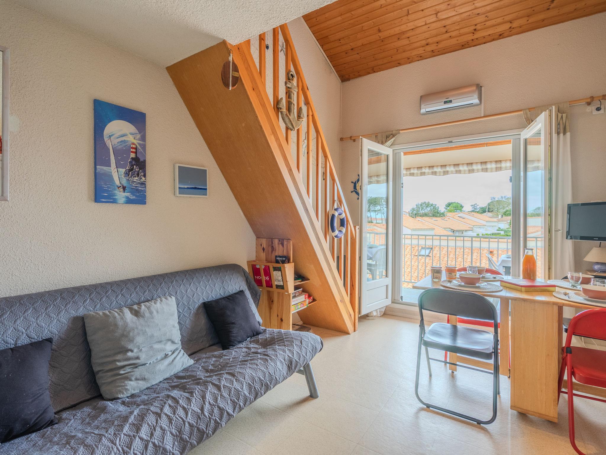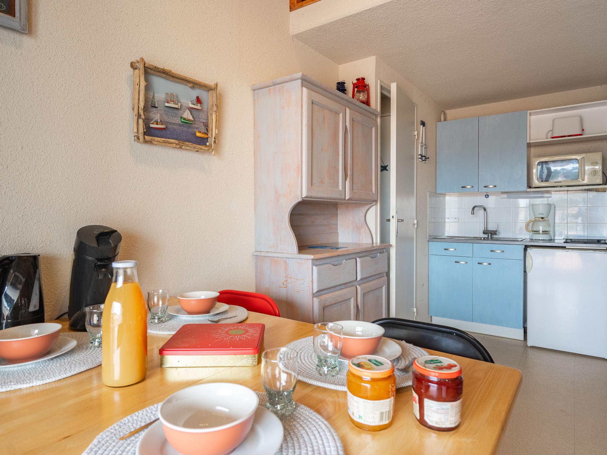 2-Zimmer-Maisonette-Wohnung 32 m2 im 2. Stock. Wohn-/Esszimmer mit TV (Flachbildschirm). Ausgang zur Terrasse. 1 Zimmer mit 1 franz. Bett (1 x 140 cm, Länge 190 cm). Kochnische (2 Kochplatten, Mikrowelle, elektrische Kaffeemaschine). Dusche, sep. WC. E-Heizung. Obergeschoss: abgeschrägte, offene Galerie mit 2 Betten (80 cm, Länge 190 cm). Terrasse 9 m2. Terrassenmöbel. Sicht auf das Schwimmbad. Zur Verfügung: Internet (WLAN, extra). Bitte beachten: Rauchmelder. Anstelle eines abgeschlossenen Schlafzimmers befinden sich manche Schlafplätze in einem offenen Bereich (Galerie, Nische etc.).