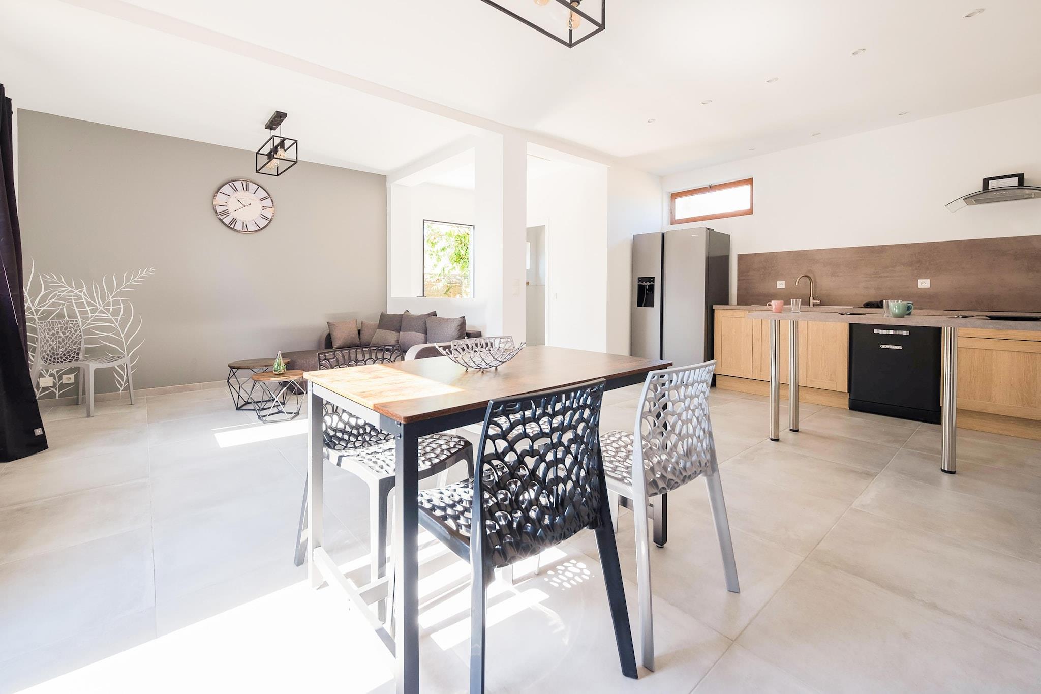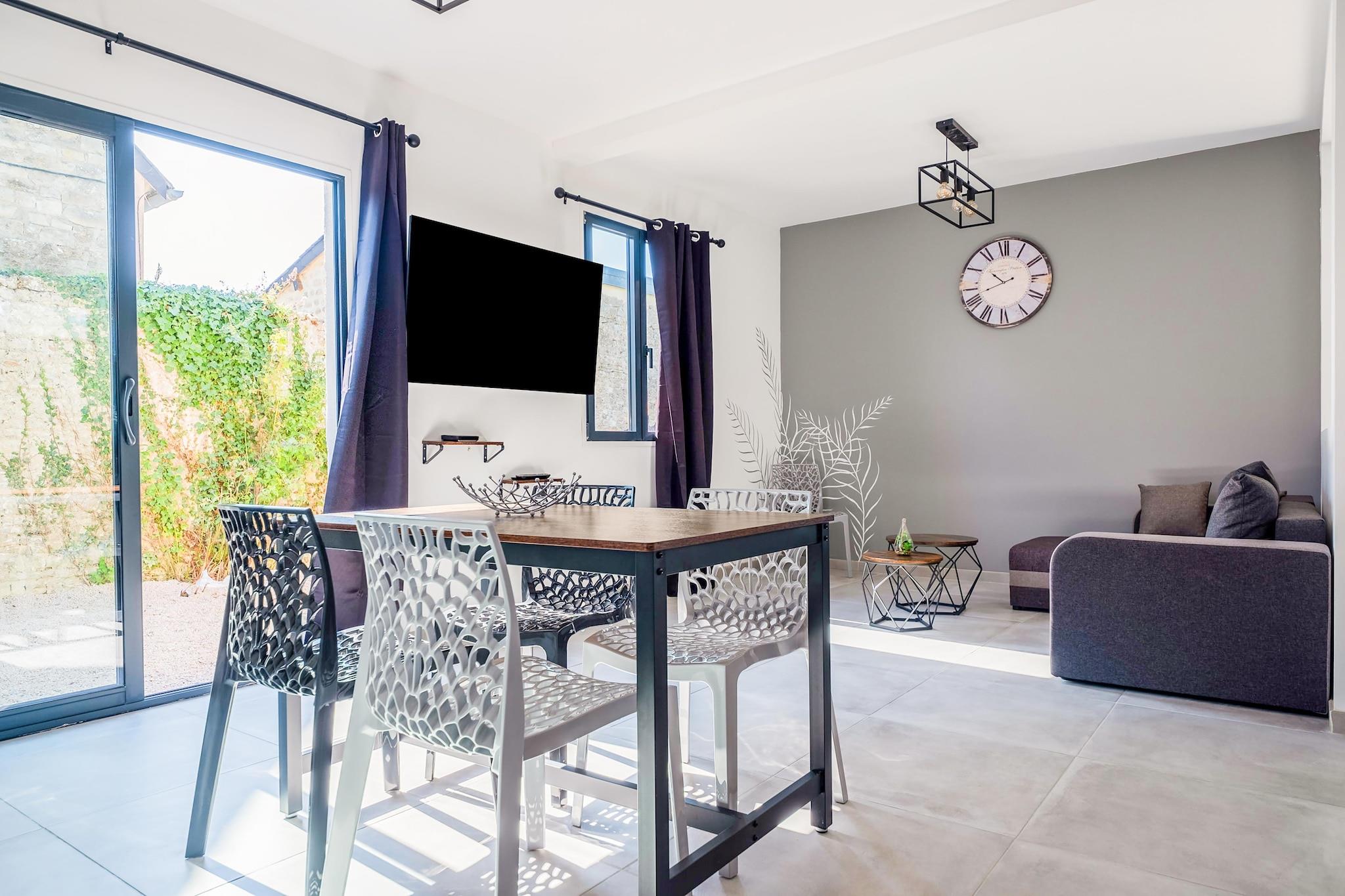 Dieses charmante Ferienhaus für 6 Personen in Vierville-sur-Mer bietet modernes Interieur und einen großen Garten mit Grillplatz - ideal für gesellige Sommerabende mit Drinks. Nur einen kurzen Spaziergang vom Omaha Beach entfernt, lädt es zum Sonnenbaden, für Spaziergänge am Meer und zum Erkunden der wunderschönen Küste der Normandie ein. Restaurants mit zahlreichen lokalen Spezialitäten sind nur 2 km entfernt. Vom offenen Wohnzimmer aus gelangt man in die voll ausgestattete Küche, in der Sie köstliche Mahlzeiten zubereiten und mit Freunden oder der Familie am Esstisch genießen können. Lassen Sie Ihren Tag bei einem entspannten Drink auf der Terrasse ausklingen und genießen Sie die ruhige Atmosphäre. Die Schlafzimmer sind durchdacht gestaltet und sorgen für erholsamen Schlaf. Parkplätze vor Ort sorgen für zusätzlichen Komfort. Adresse: 5 rue des Rauchers, 14710 Vierville-sur-Mer, Normandie Eine perfekte Mischung aus Komfort, Stil und der Nähe zum berühmten Strand der Normandie.
