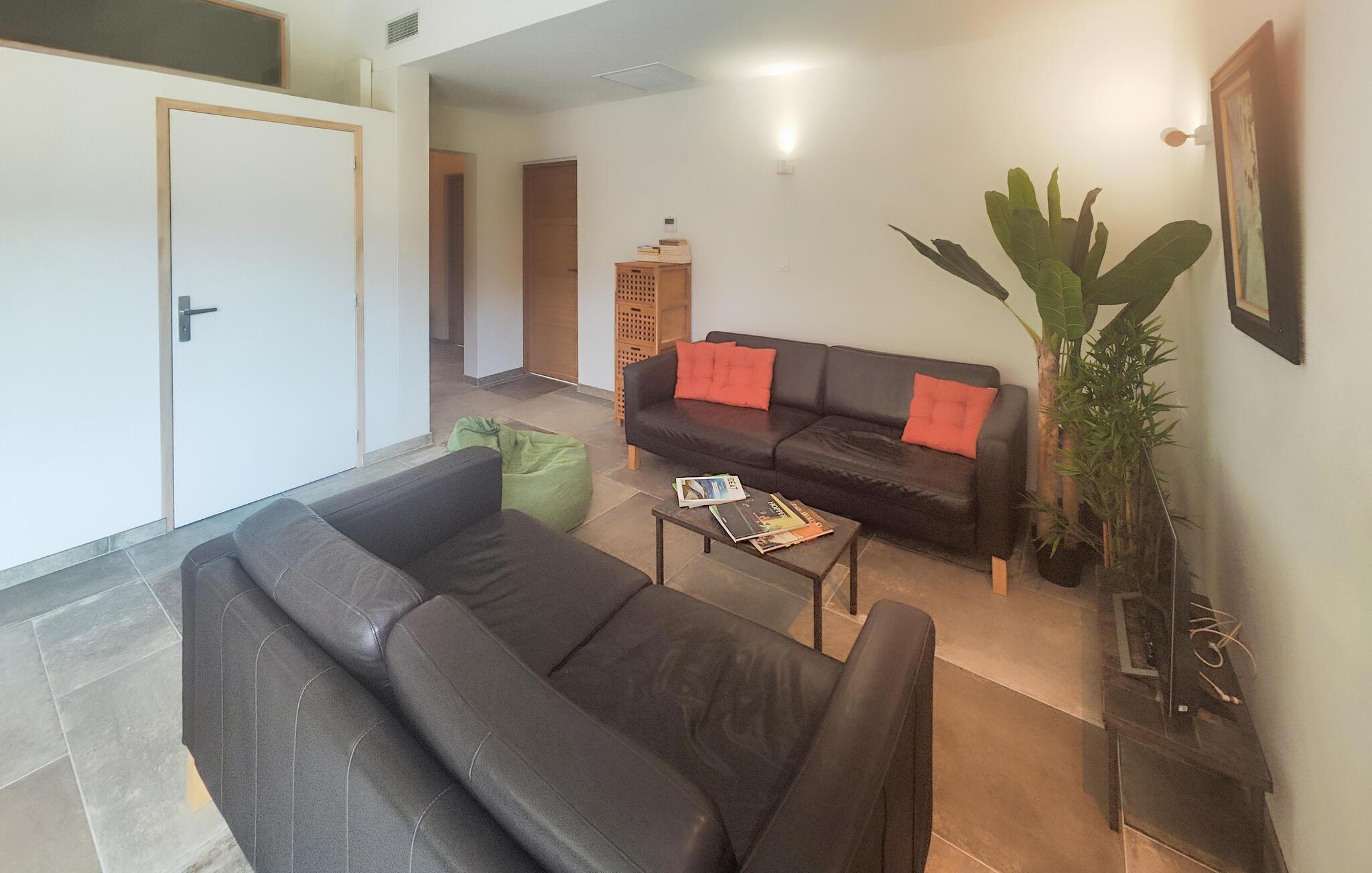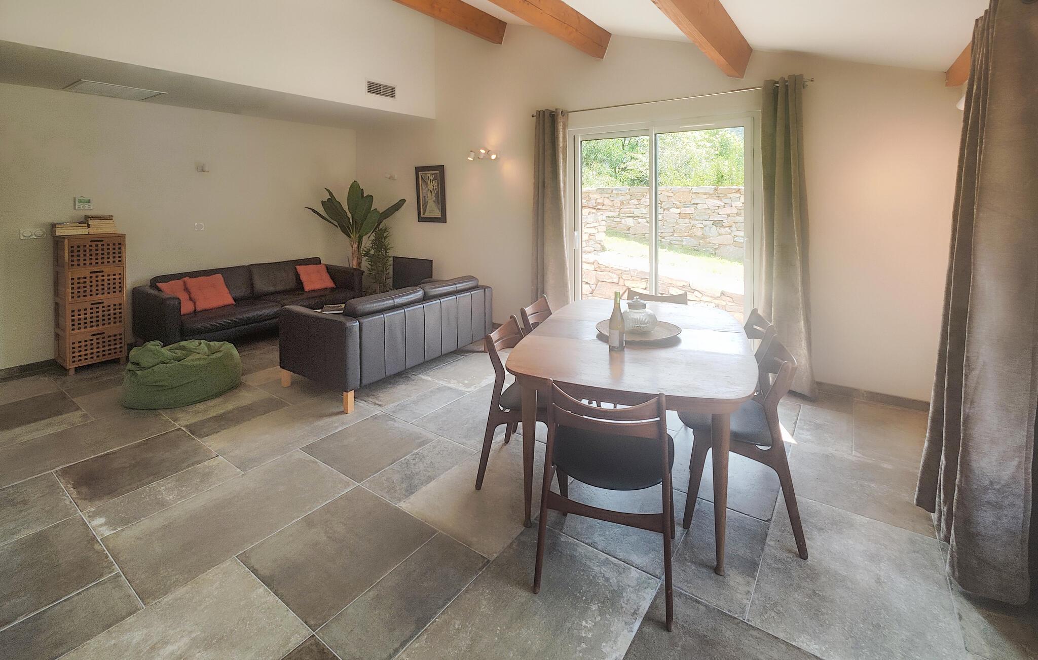 Draußen erwarten Sie eine großzügige Steinterrasse, ein erfrischender Pool und schattige Rückzugsorte mit Panoramablick. Spielen Sie eine Runde Boule, grillen Sie an der rustikalen Feuerstelle oder lassen Sie den Tag auf einer Sonnenliege ausklingen.