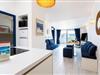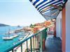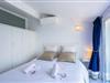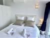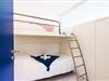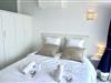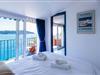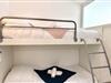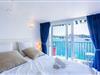 Ein Schlafzimmer mit einem 160-cm-Bett mit Balkon und Meerblick. Ein zweites Schlafzimmer mit einem Etagenbett.