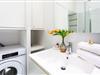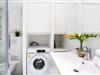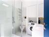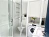 Ein Badezimmer mit Dusche, Toilette und Waschmaschine.