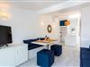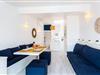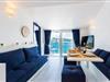 Ein Wohnzimmer mit Essbereich, 2 Sofas und einem Fernseher, die alle auf einen Meerblick-Balkon führen.