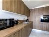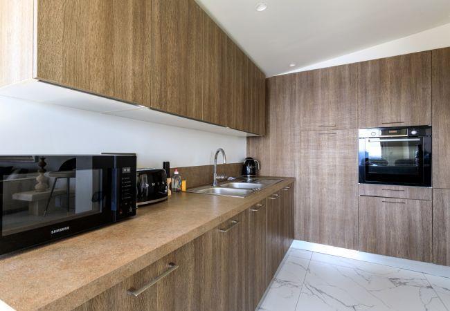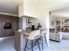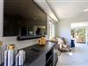 Moderne voll ausgestattete Küche im offenen Grundriss, die zur Terrasse mit einer Plancha führt