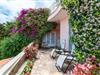 Private Terrasse mit schönen Blumen und einem Essbereich