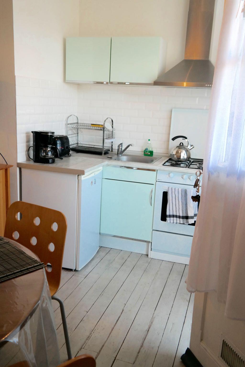 Im Inneren besteht die Wohnung aus einem einladenden Schlafzimmer mit einem bequemen Doppelbett (140 cm x 200 cm), das für ruhige Nächte sorgt. Das Badezimmer ist mit einer Dusche und einer Toilette ausgestattet und verspricht Zweckmäßigkeit und Privatsphäre. Der Küchenbereich ist mit einem Gasherd mit 4 Kochstellen und Backofen, einer Mikrowelle, zwei Arten von Kaffeemaschinen (Nespresso und Filterkaffee) sowie allen notwendigen Utensilien perfekt für die Zubereitung von Mahlzeiten ausgestattet. Für entspannte Momente lädt eine Sitzecke mit Schlafsofa und einem kleinen Salontisch zum gemütlichen Beisammensein ein.