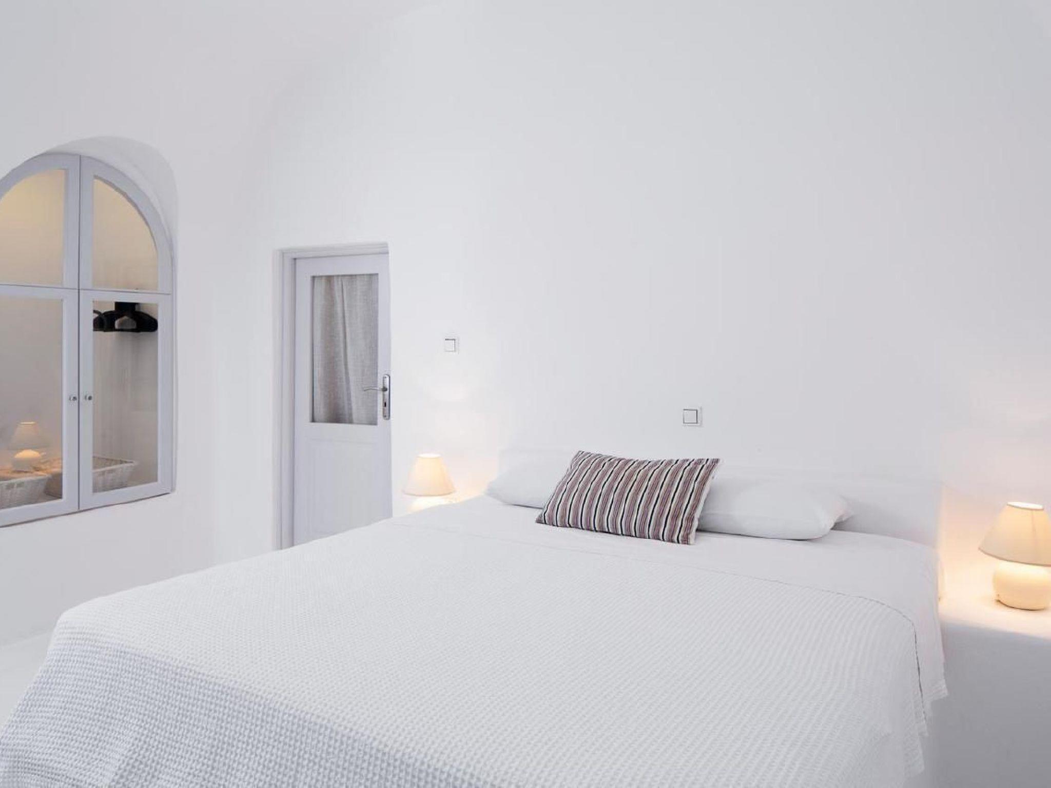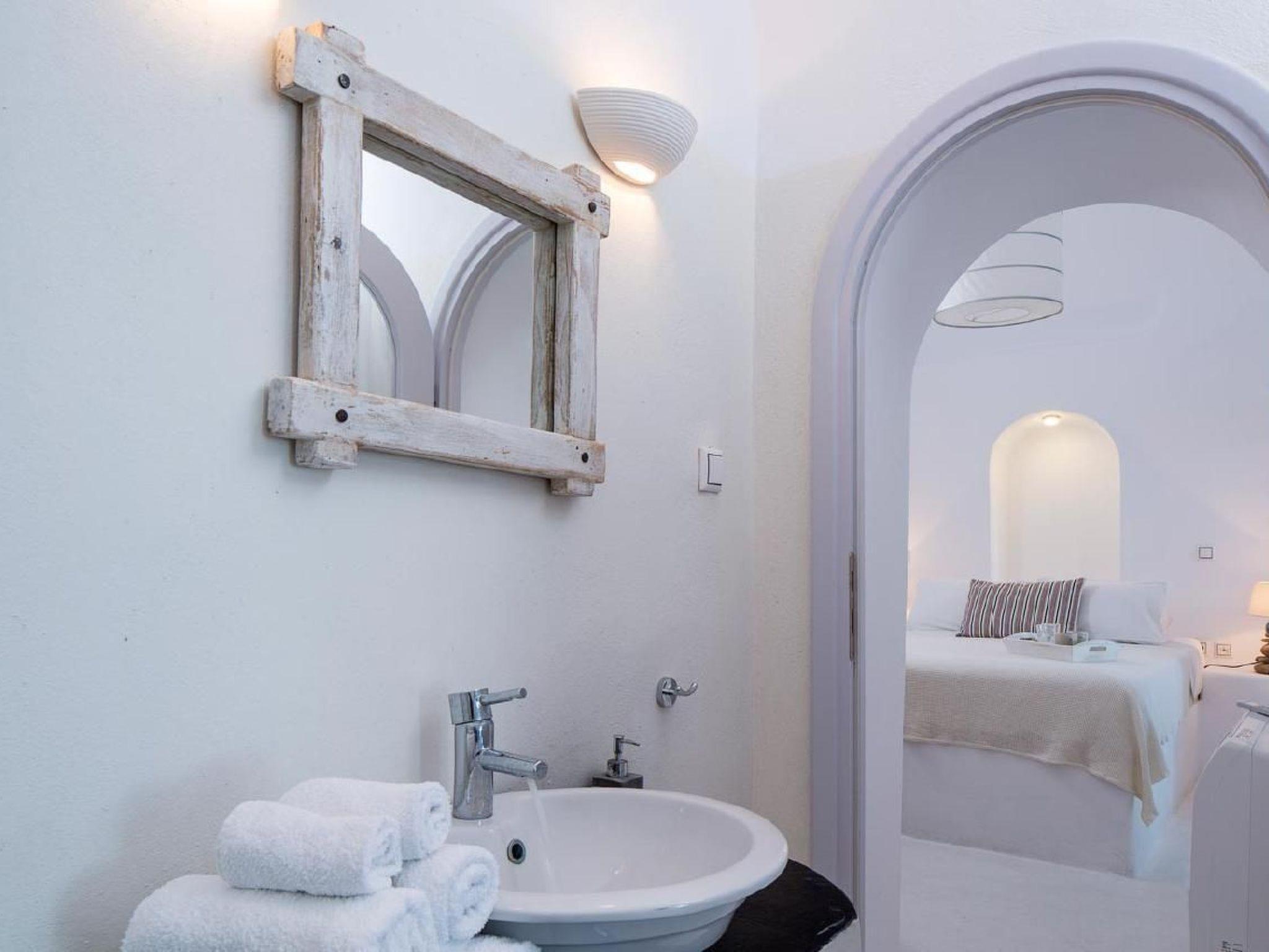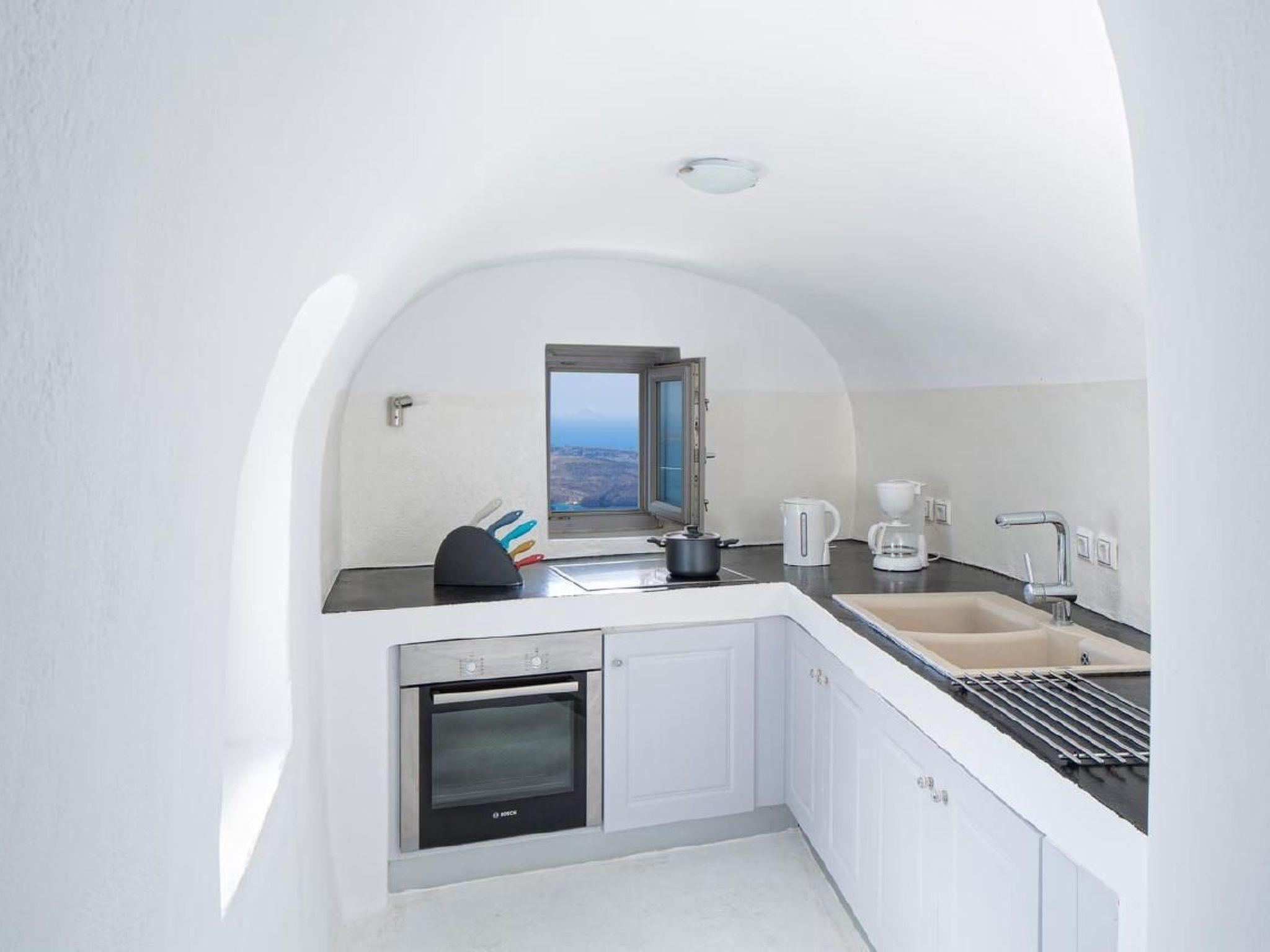 Betreten Sie die untere Etage des Höhlenhauses - wenn Sie Ihre Augen von der Aussicht abwenden können! - Das Haus ist in frischem Weiß gehalten, wobei der Übergang vom Wohnbereich zum Schlafzimmer eine ruhige und freundliche Atmosphäre schafft. Diese Villa verfügt über ein geräumiges Schlafzimmer mit Doppelbett und ein wunderschönes eigenes Badezimmer mit Waschbecken für sich und andere. Idealerweise ist es eine Villa für zwei Personen, aber es gibt noch einen zusätzlichen Schlafplatz für weitere Gäste auf der Bankettcouch, die von einem zweiten Badezimmer direkt neben dem Wohnzimmer bedient wird. Für diejenigen, die gerne kochen, ist die Küche das Highlight dieser Villa - ein ungehinderter Blick auf die Caldera von der Herdplatte aus. Eine private, sonnenüberflutete Terrasse mit atemberaubender Aussicht und ein Außen-Jacuzzi mit Tauchbecken runden das Bild ab.