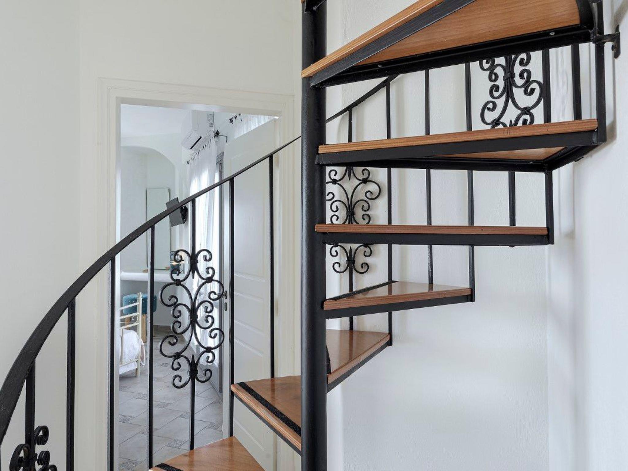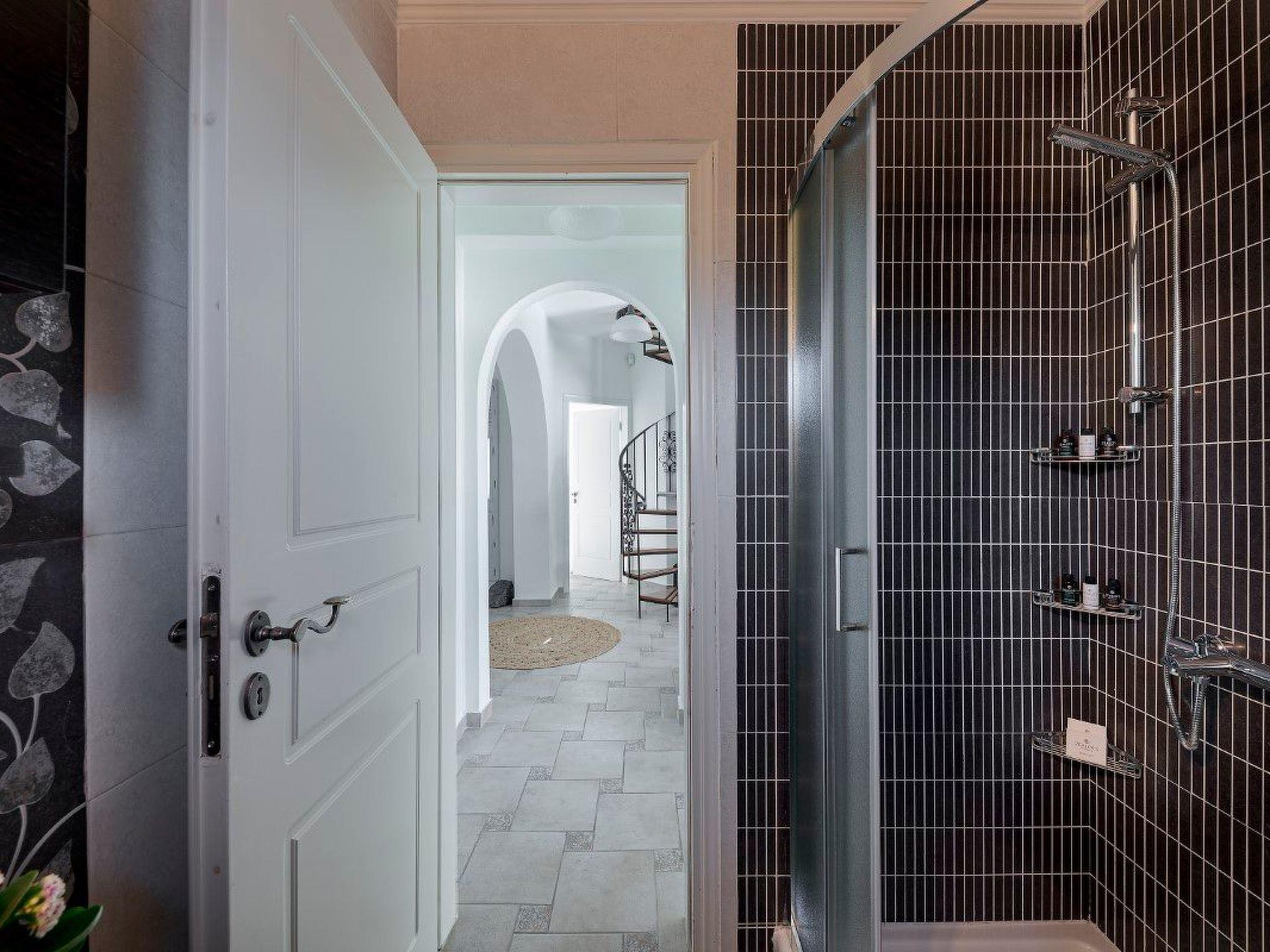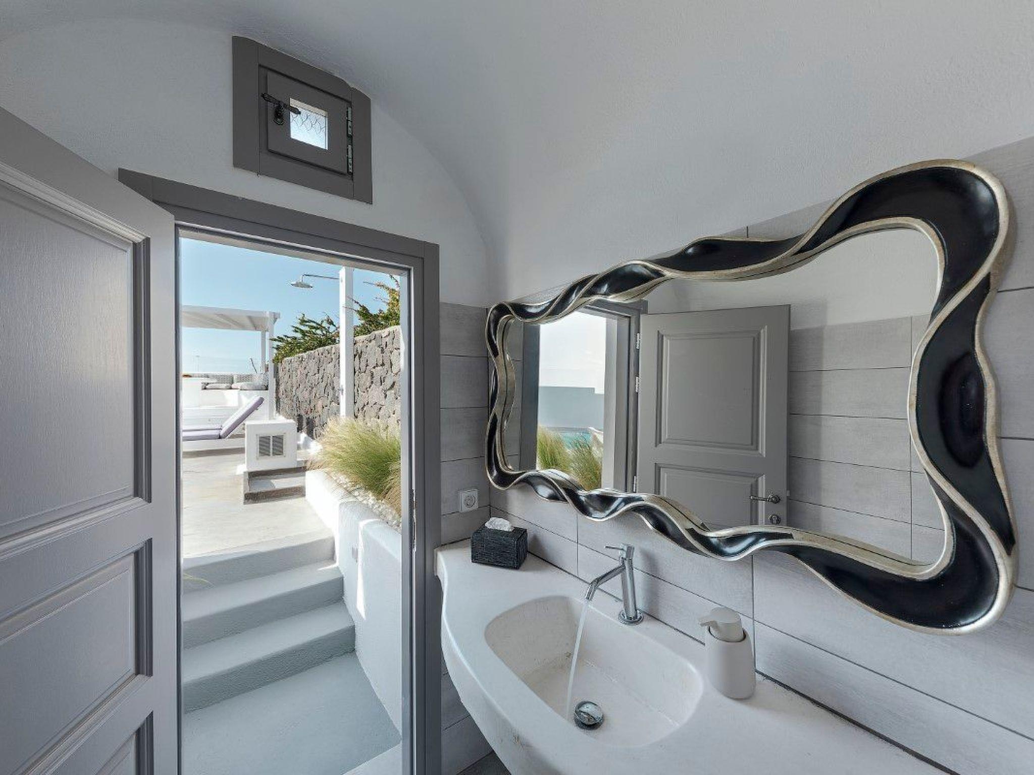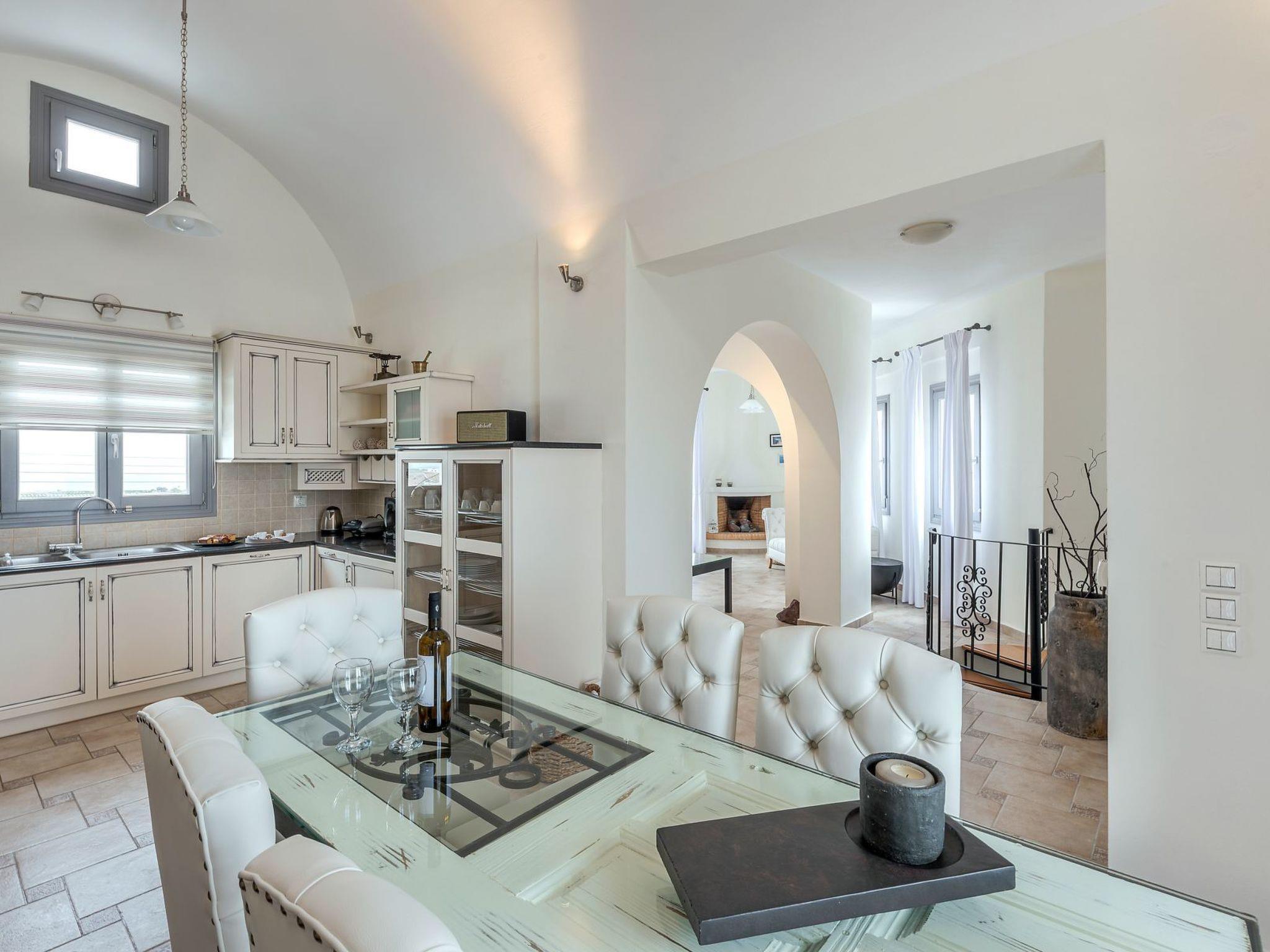 Im Obergeschoss befinden sich ein Wohnzimmer mit Kamin, eine voll ausgestattete Küche, ein Esszimmer, ein Flachbildfernseher, eine Klimaanlage, ein WC und ein Balkon mit einem Essbereich im Freien mit Blick auf die Caldera, den Vulkan und den Swimmingpool. Ein weiterer kleiner Balkon befindet sich an der Fassade der Villa mit Blick auf die Weinberge von Santorin.