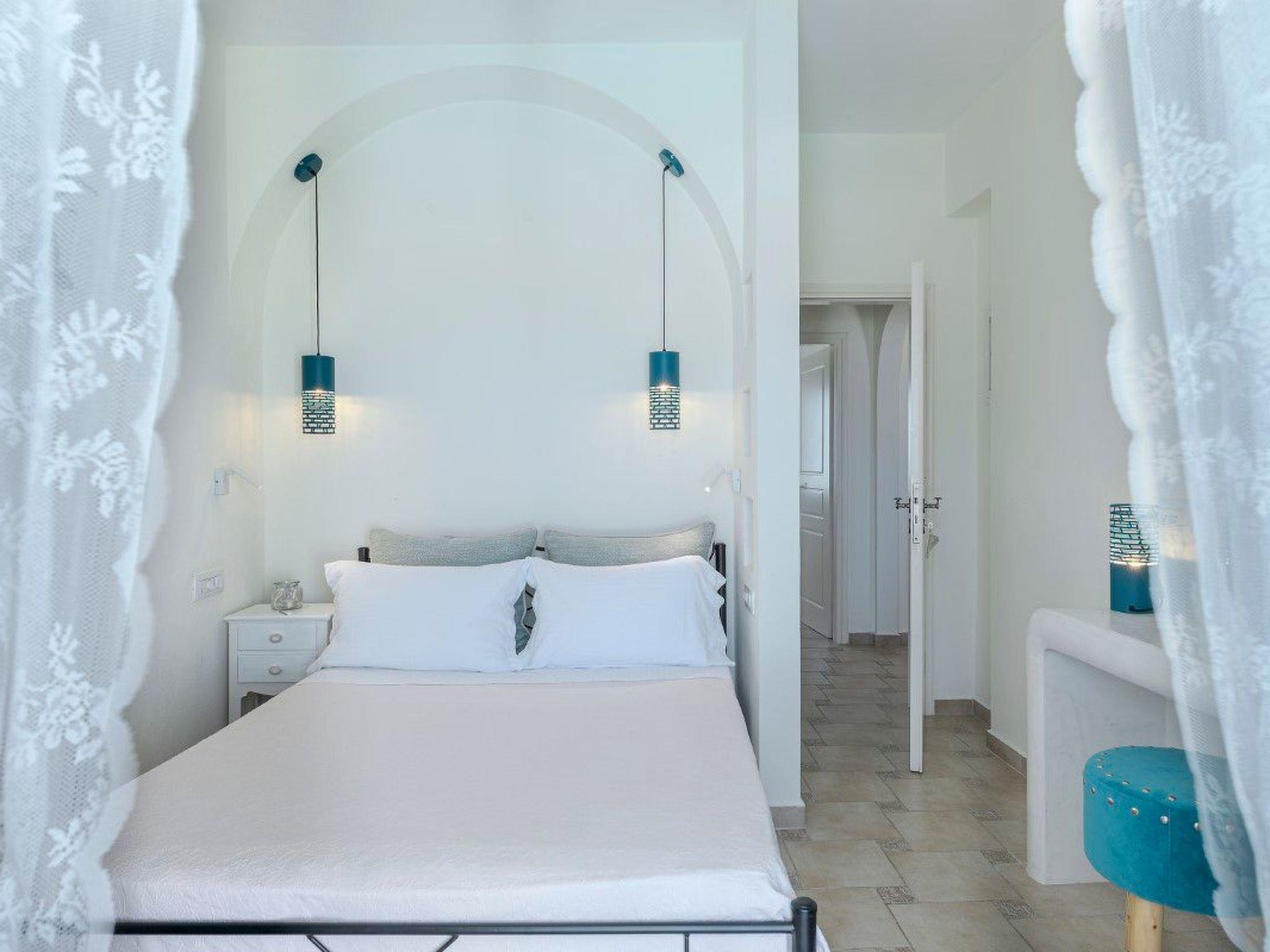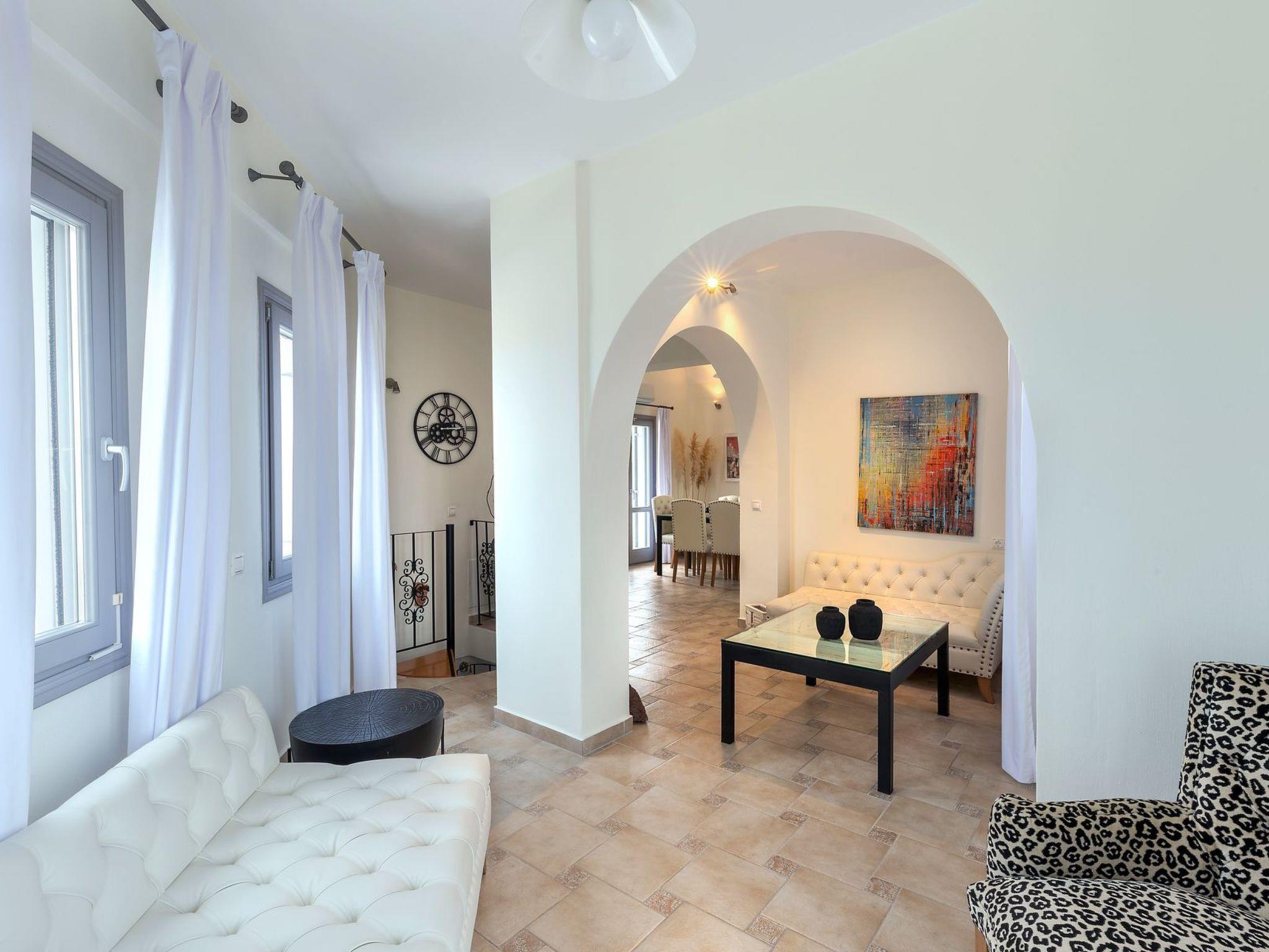 Es handelt sich um eine Selbstversorger-Villa mit einer Wohnfläche von 111 m². Sie ist auf zwei Ebenen gebaut, in voller Übereinstimmung mit der modernen kykladischen Architektur, und kann bis zu 6 Gäste beherbergen. Sie verfügt über einen privaten Pool mit Jacuzzi, eine Außendusche am Pool, ein Außen-WC, eine geräumige Terrasse mit hochwertigen Sonnenliegen, eine überdachte Pergola mit Gartenmöbeln, einen privaten Parkplatz und einen Garten von ca. 680 m².