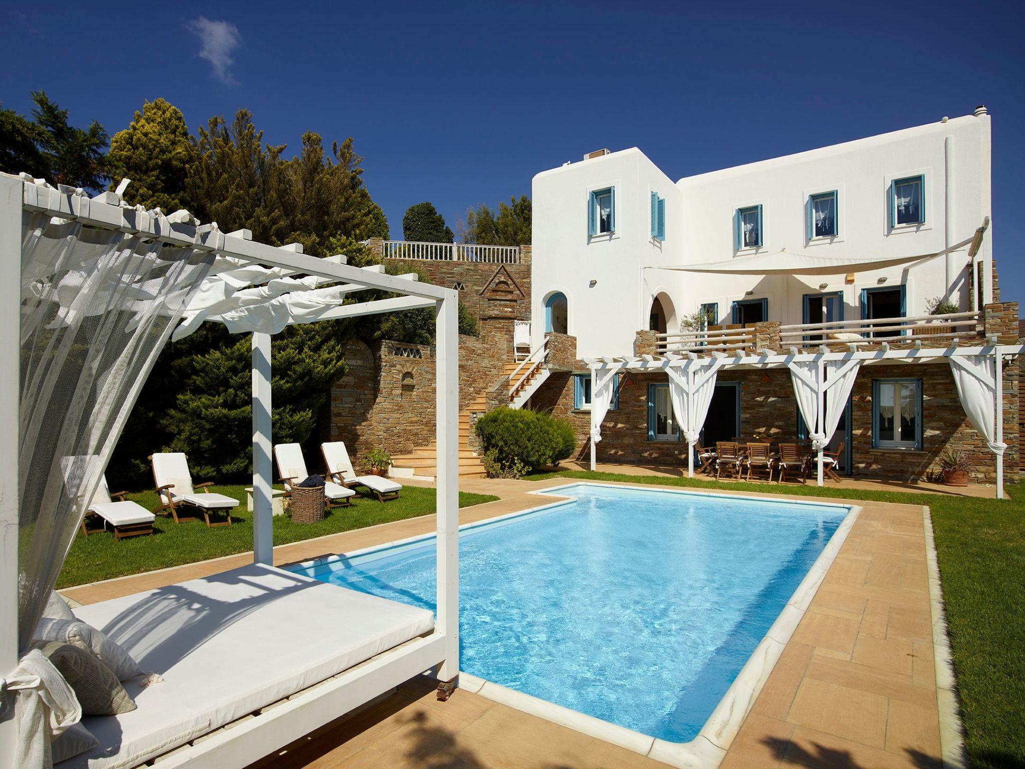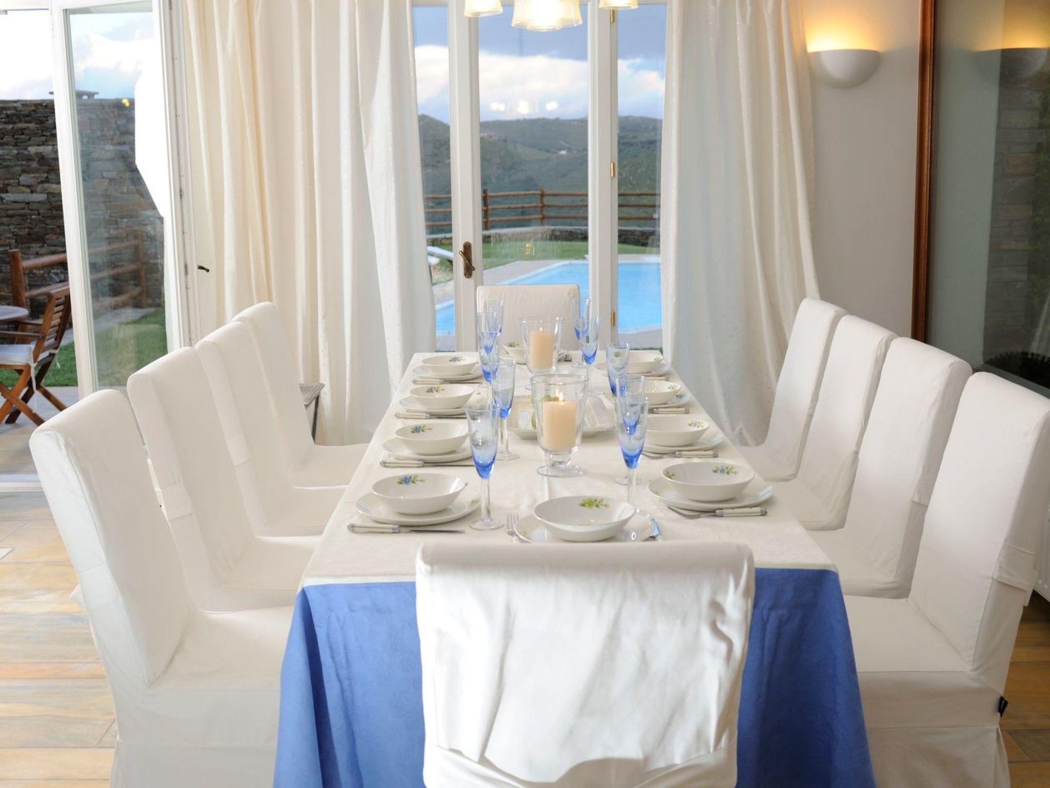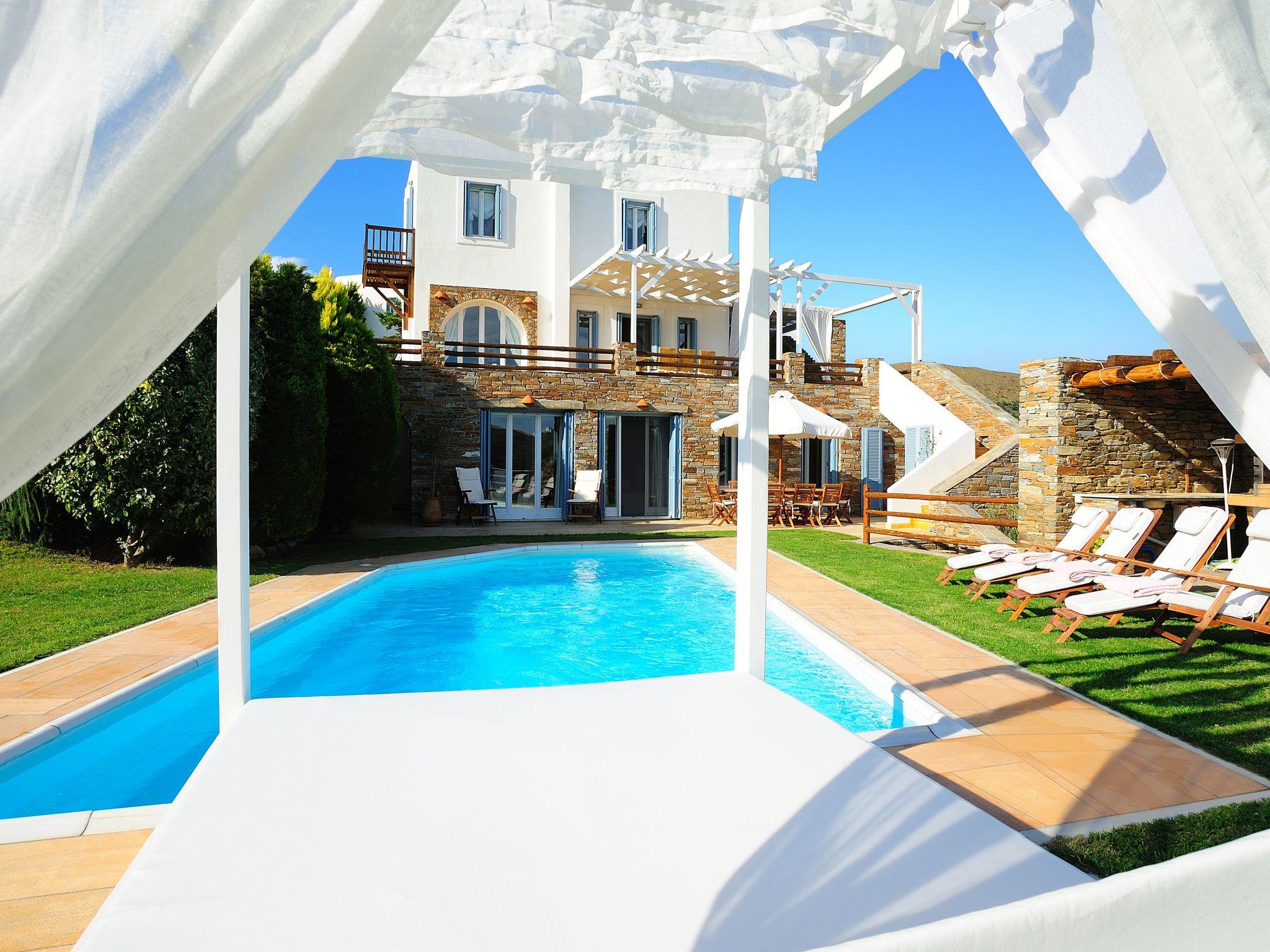 Unsere Villa befindet sich in der Region Kato Fellos, nur 5 Minuten mit dem Auto (oder 15 Minuten zu Fuß) von einem herrlichen Sandstrand und 5 km von der Hafenstadt Gavrio in Andros entfernt. Es ist auf einem Hügel gebaut und bietet einen wunderschönen Blick auf das Ägäische Meer und die grüne Natur der Insel. Die Lage ist ruhig, entlang einer wenig befahrenen Straße, perfekt für totale Entspannung.