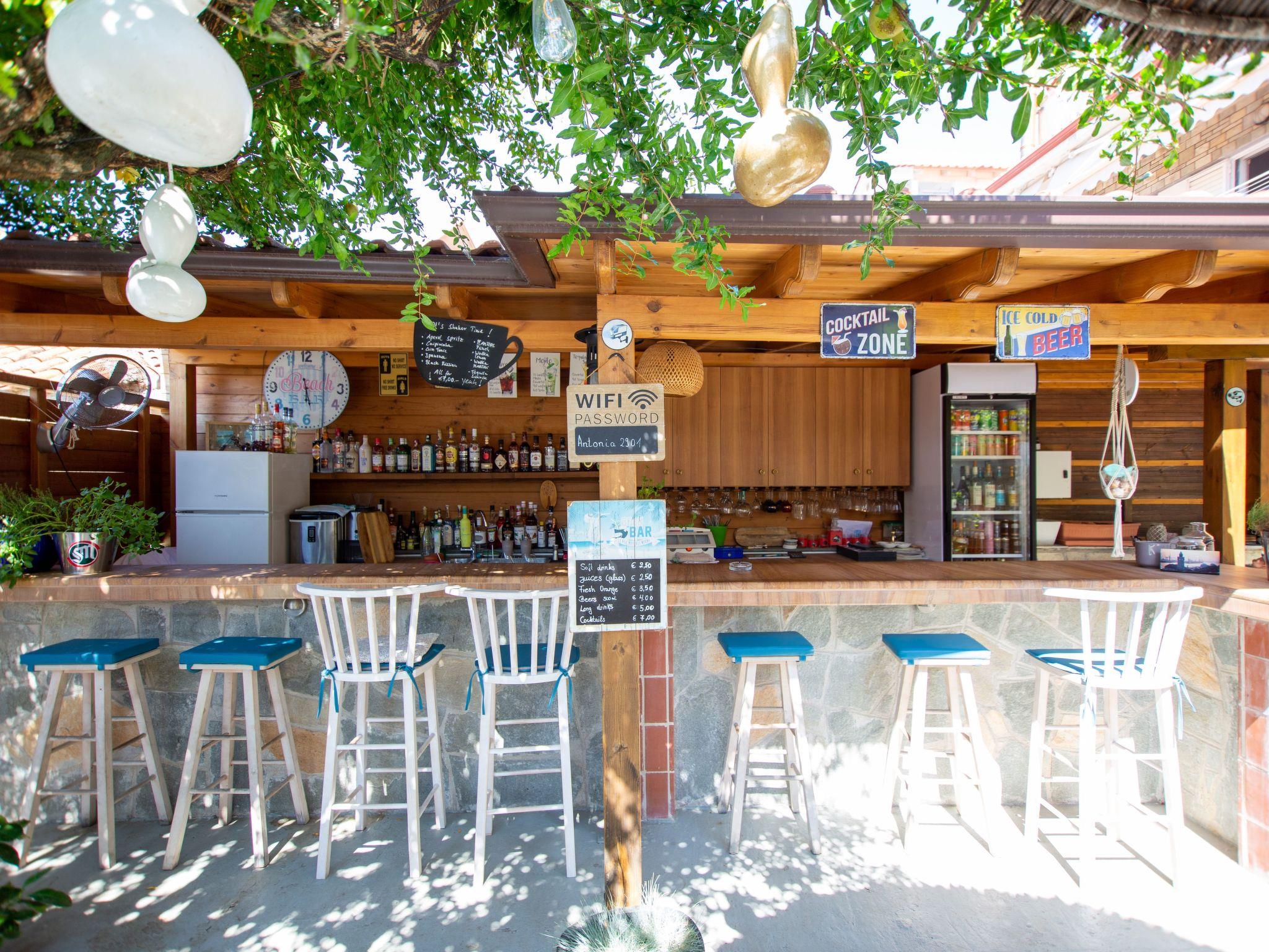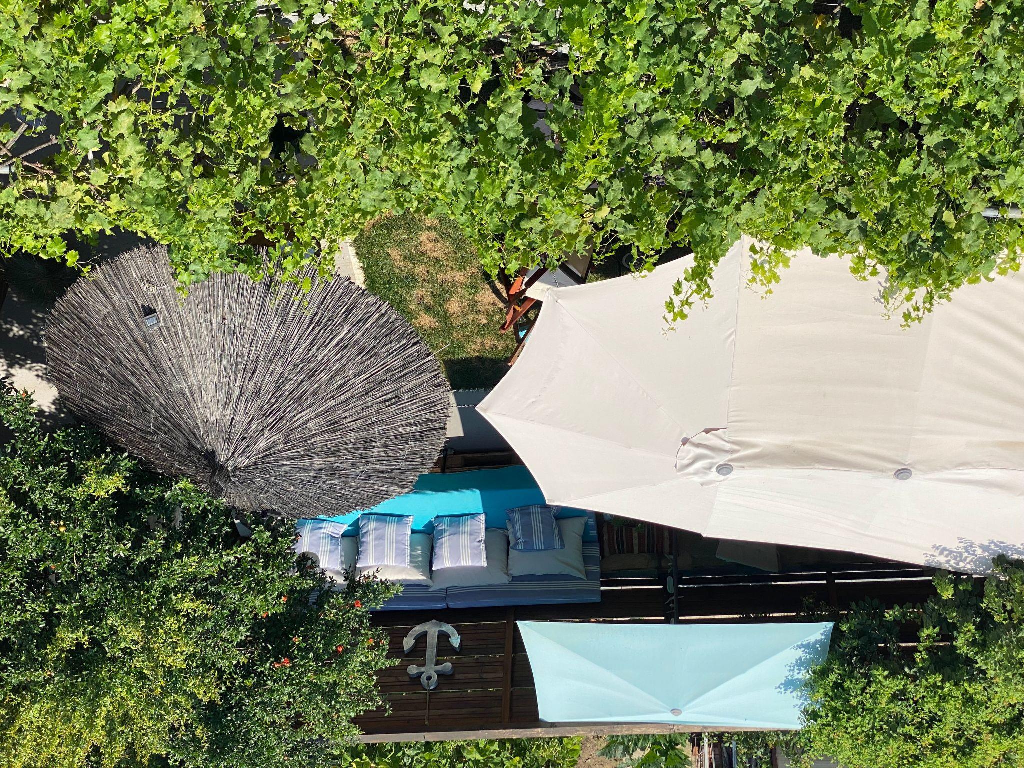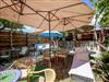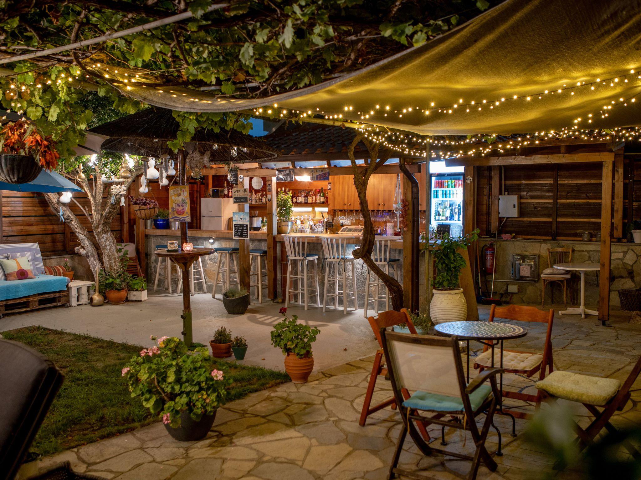 Im blumenüberfluteten Innenhof befinden sich eine Hausbar mit einer gemütlichen Sitzecke, eine Außendusche, ein Getränkeautomat mit kaltem Wasser, und eine kleine Rasenfläche zum Spielen und entspannen.