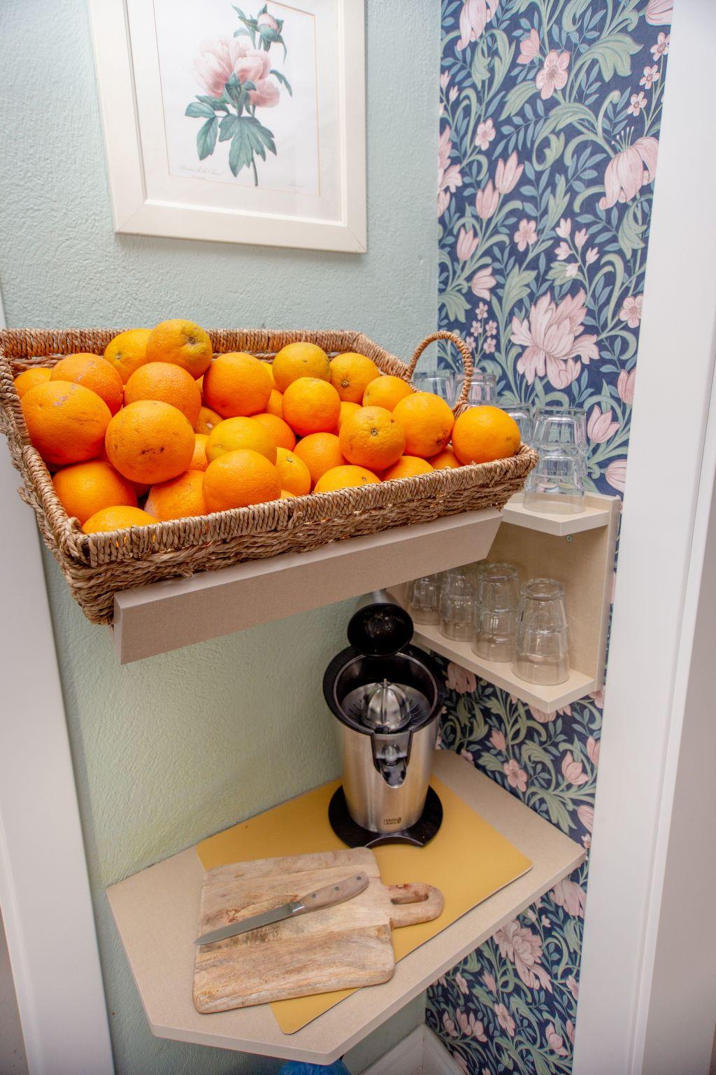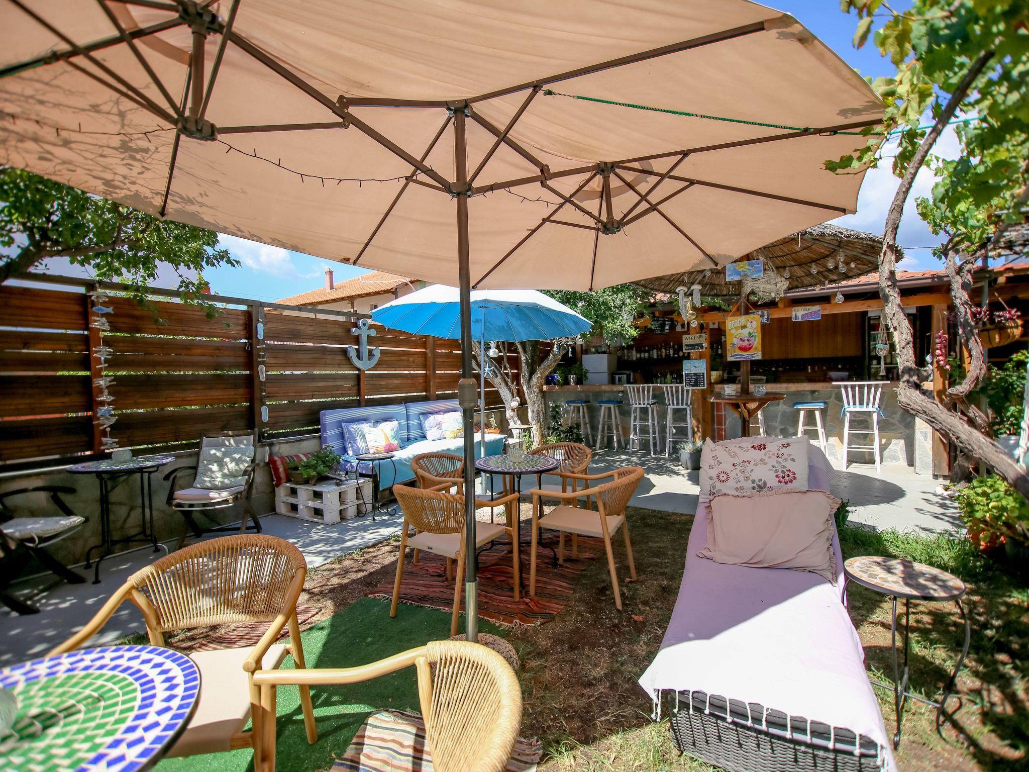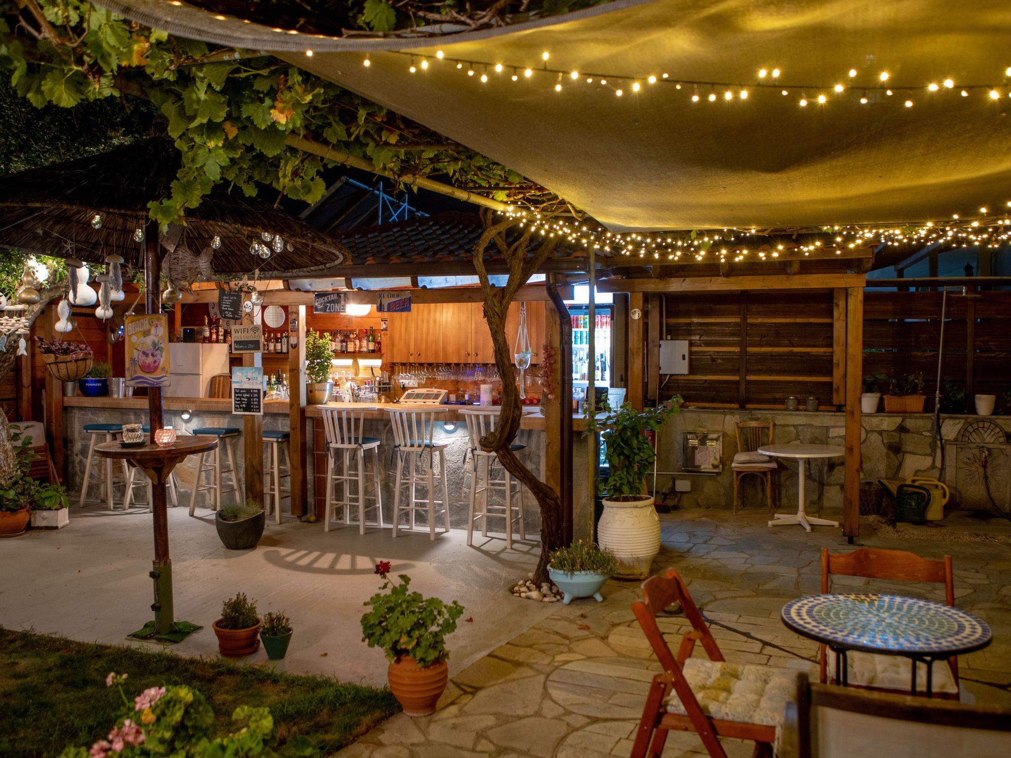 Im blumenüberfluteten Innenhof befinden sich eine Hausbar mit einer gemütlichen Sitzecke, eine Außendusche, ein Getränkeautomat mit kaltem Wasser, und eine kleine Rasenfläche zum Spielen und entspannen.