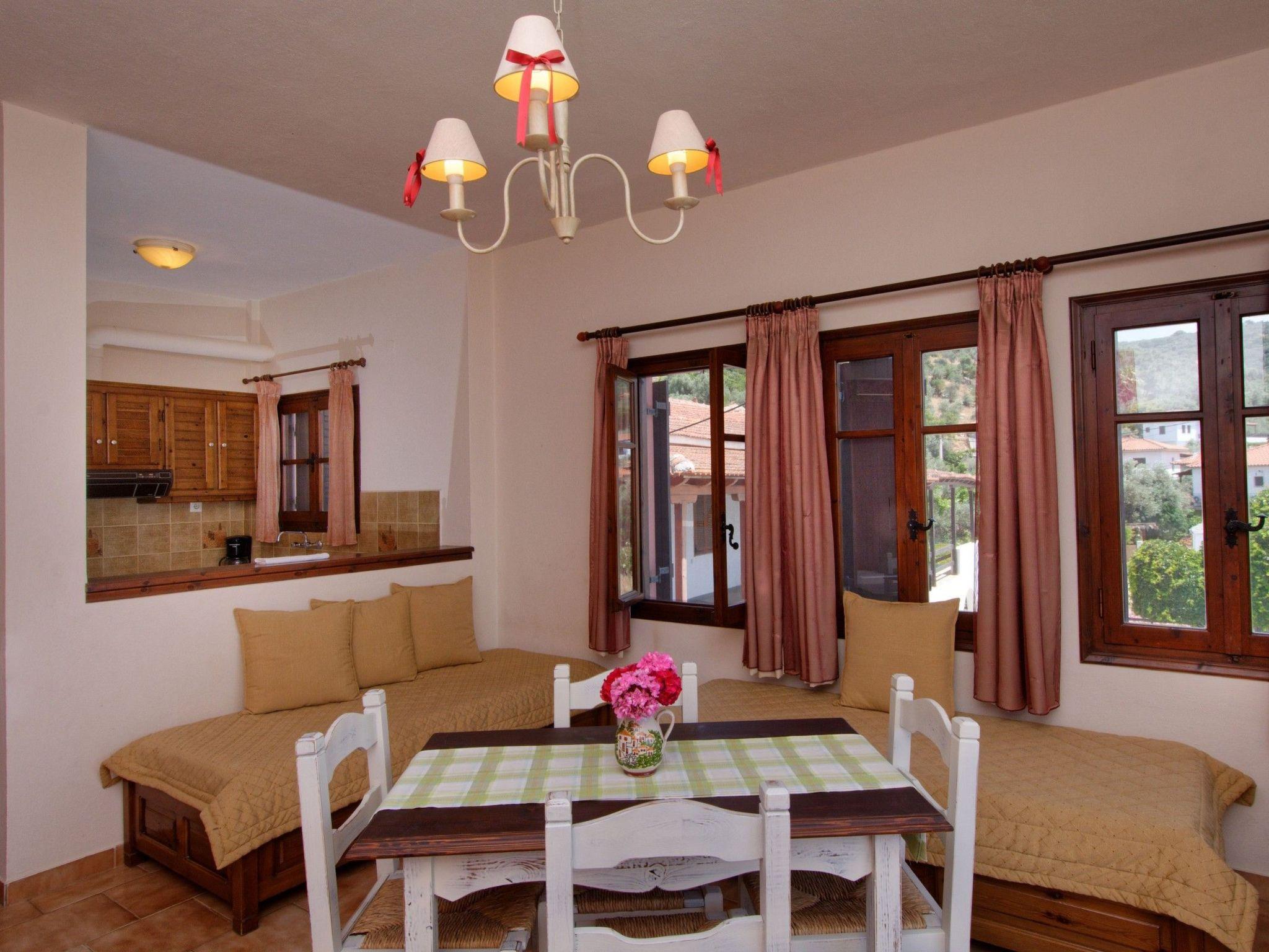 Jede Wohnung ist geschmackvoll und modern eingerichtet und verfügt über ein Schlafzimmer mit einem Doppelbett oder zwei Einzelbetten und ein Wohnschlafraum mit zwei weiteren Betten und eine Küchenecke, die durch eine Theke abgetrennt wird. Die Wohnungen verfügen weiterhin eine Du/WC, Klimaanlage, Flat TV, WiFi-Internet und Balkon mit Gartenmöbeln und Meerblick.
