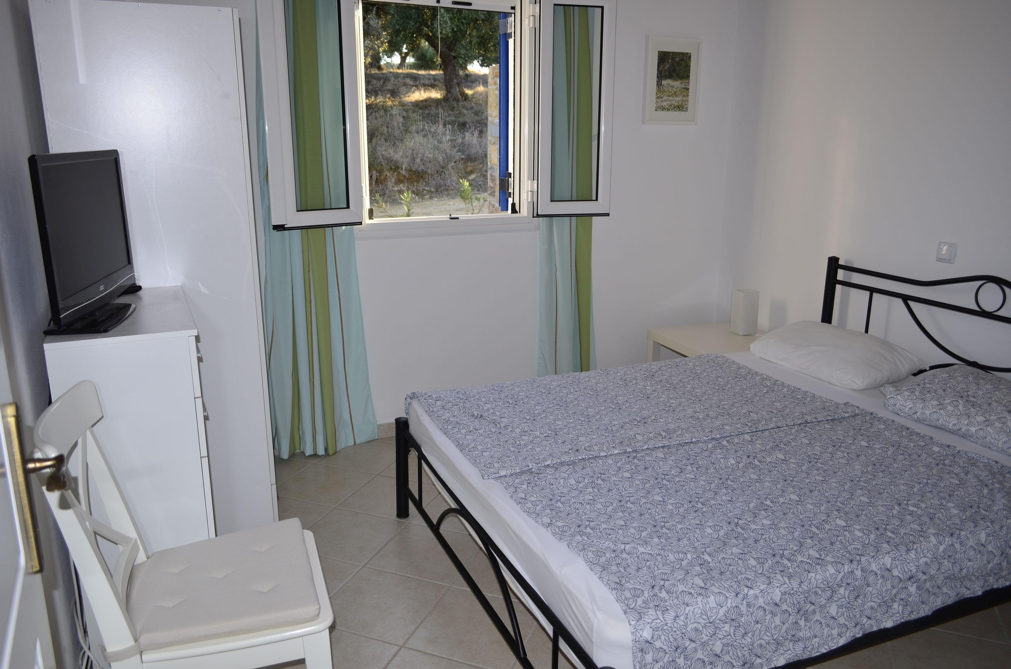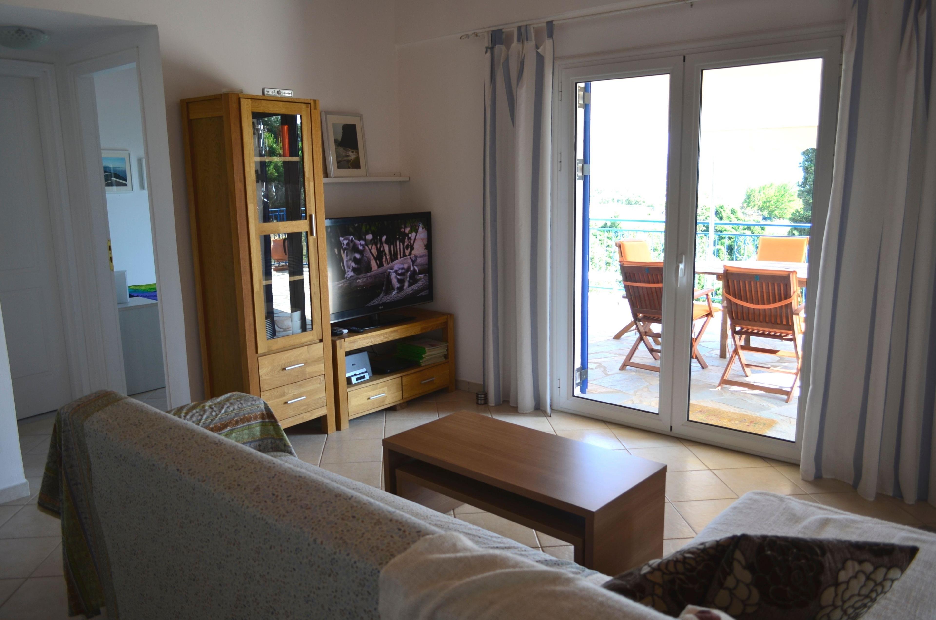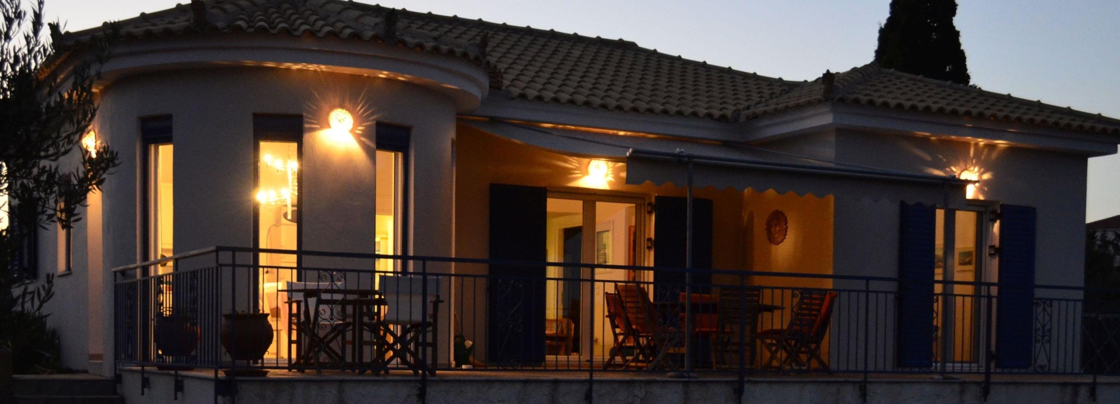 Helle hohe Räume mit Holzdecken gibt es in der Villa Pilias. 3 Schlafzimmer mit Doppelbetten, 2 komplette Bäder mit Duschen, im Hauptbad ist ein Doppelwaschbecken. In den drei Schlafzimmern bringt bei Hitze eine Aircondition Kälte. Zusätzlich kann die gesamte Villa über die Fußbodenheizung gekühlt werden. Im Winter sorgt eine Elektrotherme oder ein Holzofen im Wohnessraum, der mit Wassertaschen an die Fußbodenheizung angeschlossen ist, für Wärme im ganzen Haus. Mittelpunkt ist die große Wohnküche mit Essecke in einem Erker und einer Schlafcouch vor dem Full-HD-Fernseher, der alle frei zugänglichen Programme empfängt. Ein kleinerer Full-HD-Fernseher gibt es noch in einem Schlafzimmer. Die Küche ist voll ausgestattet mit Geschirr, Geräten wie Backofen, Cerankochfeld, Spülmaschine, Mikrowelle und zusätzlich Küchenmaschine und für außen ein 500 Grad HIghtech Elektrogrill. Es gibt auch eine Waschmaschine für ausreichend vorhandenen Hand-, Bade- und Strandtücher. Im großen Bücherschrank stehen auch griechische Kochbücher und auch ein Wanderbuch mit 17 gut beschriebenen Wegen für das südliche Messenien. Und bei den freewalkers erfährt man etwas über kostenlose geführte Wanderungstermine im Frühjahr, Herbst und Winter. Auf der Terrasse ist eine riesige Markise als Sonnenschutz installiert, die im Winter reingedreht werden kann. Die Villa Pilias ist so ausgerichtet, dass sie im Herbst, Winter oder Frühjahr den kalten Nordwind auf der Terrasse abhält.