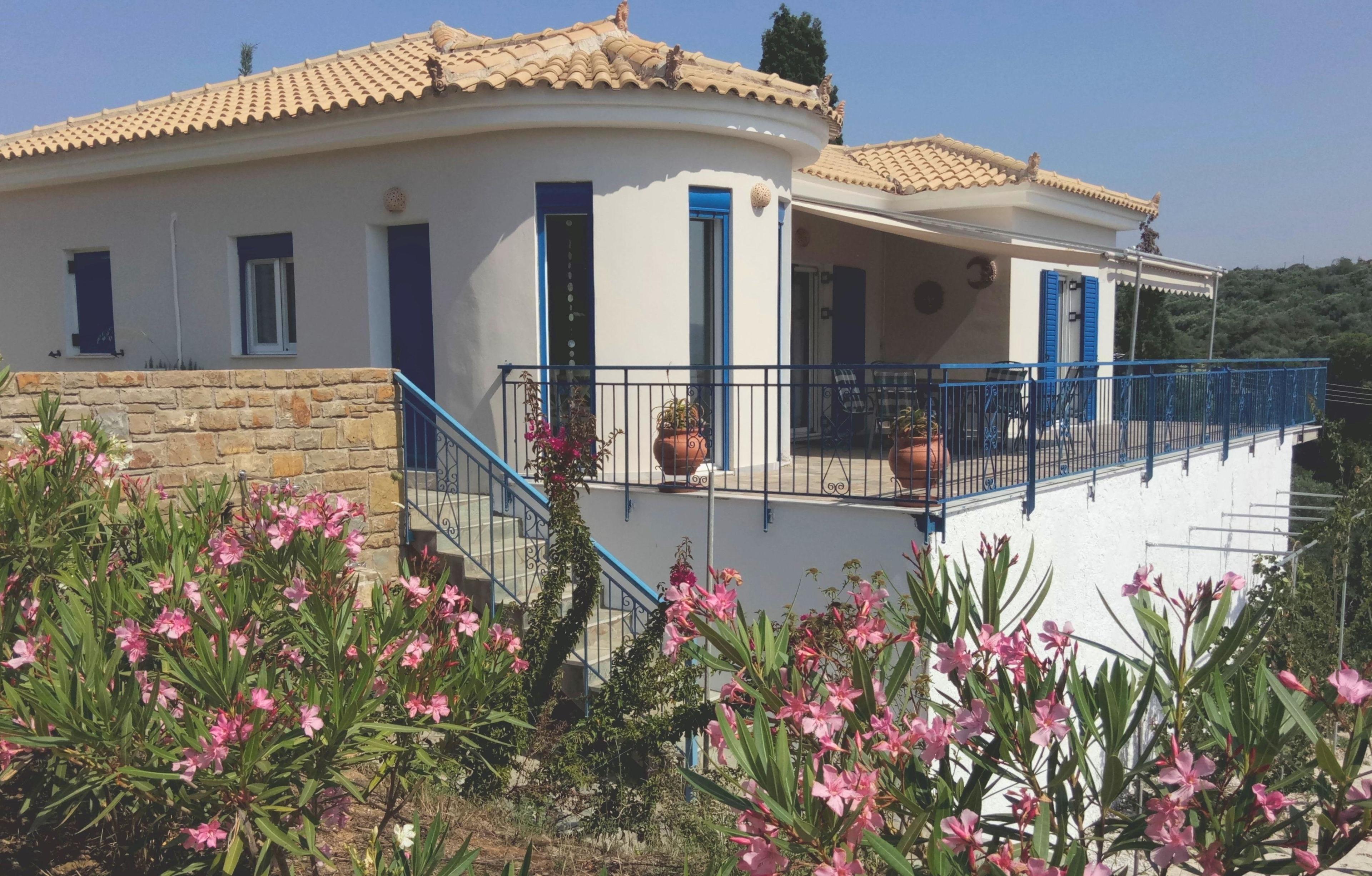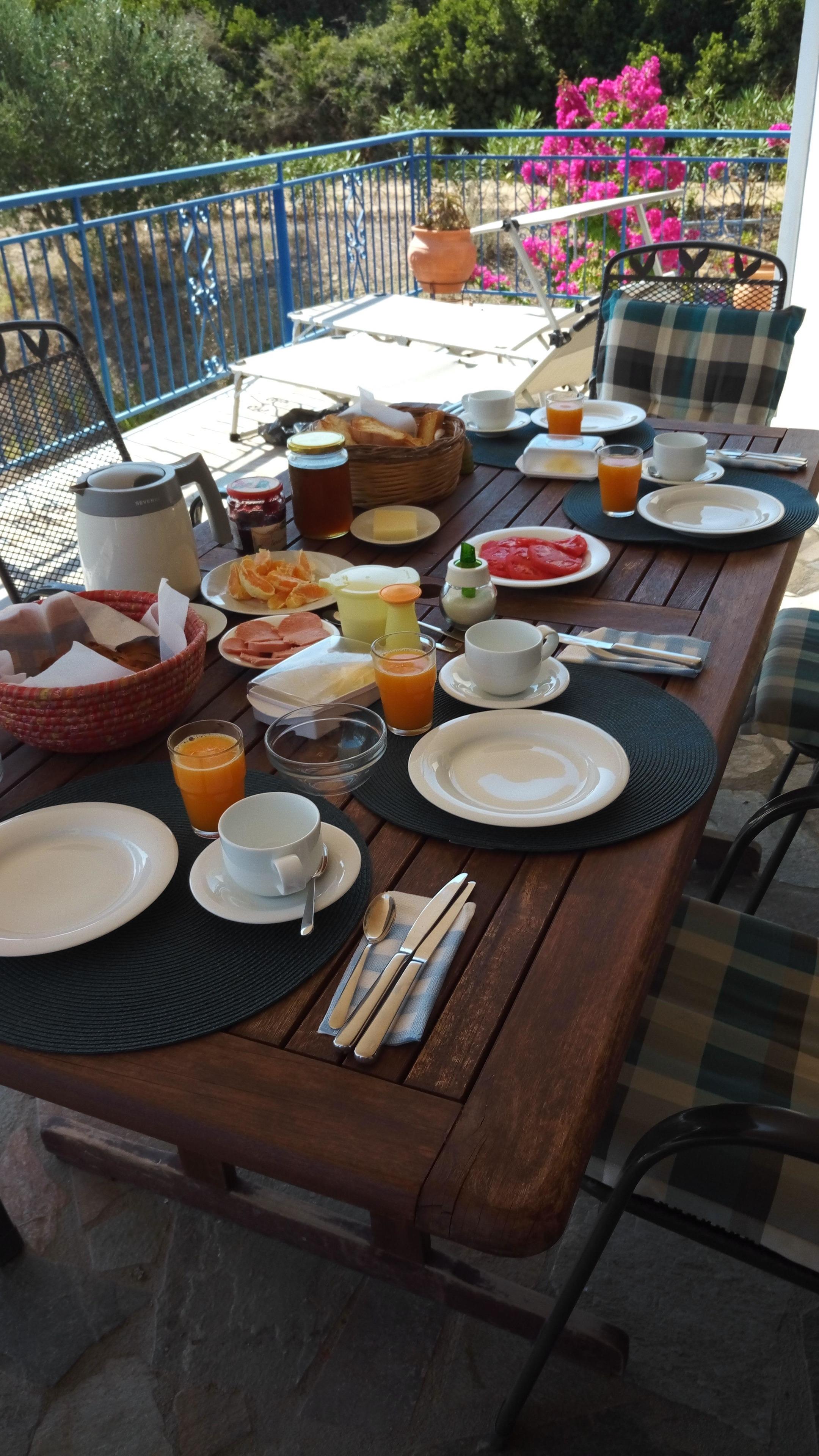 In dem großen mediterranen Garten wachsen Oliven, Apfelsinen, Zitronen, Mandarinen, Feigen und Granatäpfel. Der Garten ist im naturzustand, daher betreten auf eigene Gefahr. Die große Terrasse bietet einen Postkartenblick auf Berge und Meer und vor der Küche ist noch ein Außensitzplatz unter einem Olivenbaum, vom Weg getrennt durch Oleander. Darunter eine Außendusche zwischen Bourgonvilleablüten und Oleander als Sichtschutz. Hier gib es auch warmes Wasser von der griechischen Sonne aus dem Solarkollektor oder dem Elektroboiler.