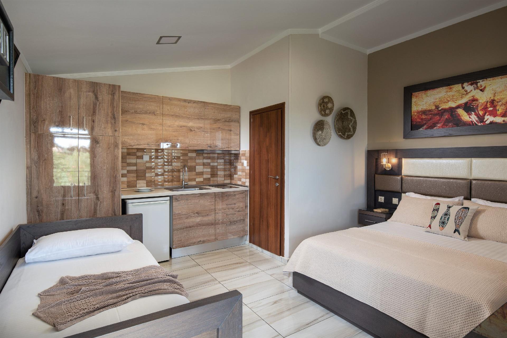 Modernes Studio in Strandnähe auf einem atemberaubenden, hellgrünen Grundstück in der Nähe der Meeresküste (nur 280 m zu Fuß entfernt) im Dorf Gerakini in der wunderschönen Chalkidiki. Das Studio verfügt über ein Schlafzimmer mit einem Doppelbett mit anatomischer Spezialmatratze und einem Einzelbett. Im gleichen Bereich gibt es eine ausgestattete Küchenzeile mit allen notwendigen Kochutensilien, einen Kühlschrank, elektrische Kochplatten zum Kochen, einen 22? LCD-Fernseher, Klimaanlage (A/C), Wi-Fi, Safe und ein Badezimmer. Schwimmbad, Kinderschwimmbad, Liegestühle, Sonnenschirme, Tische und Stühle rund um das Schwimmbad zur kostenlosen Nutzung. Pool-Snackbar, großer Garten, privater und gesicherter Parkplatz (kostenlos), Grillmöglichkeiten. Kostenloses Wi-Fi-Internet, Auto-, Motorrad- und Fahrradverleih, Taxiverleih, Fax- und Druckservice, Bügelbrett. Der nächstgelegene Sandstrand ist etwa 280 Meter entfernt. Der Strand ist leicht erreichbar. Das Stadtzentrum mit seinen Restaurants, Supermärkten und anderen Geschäften ist ca. 900 m entfernt.