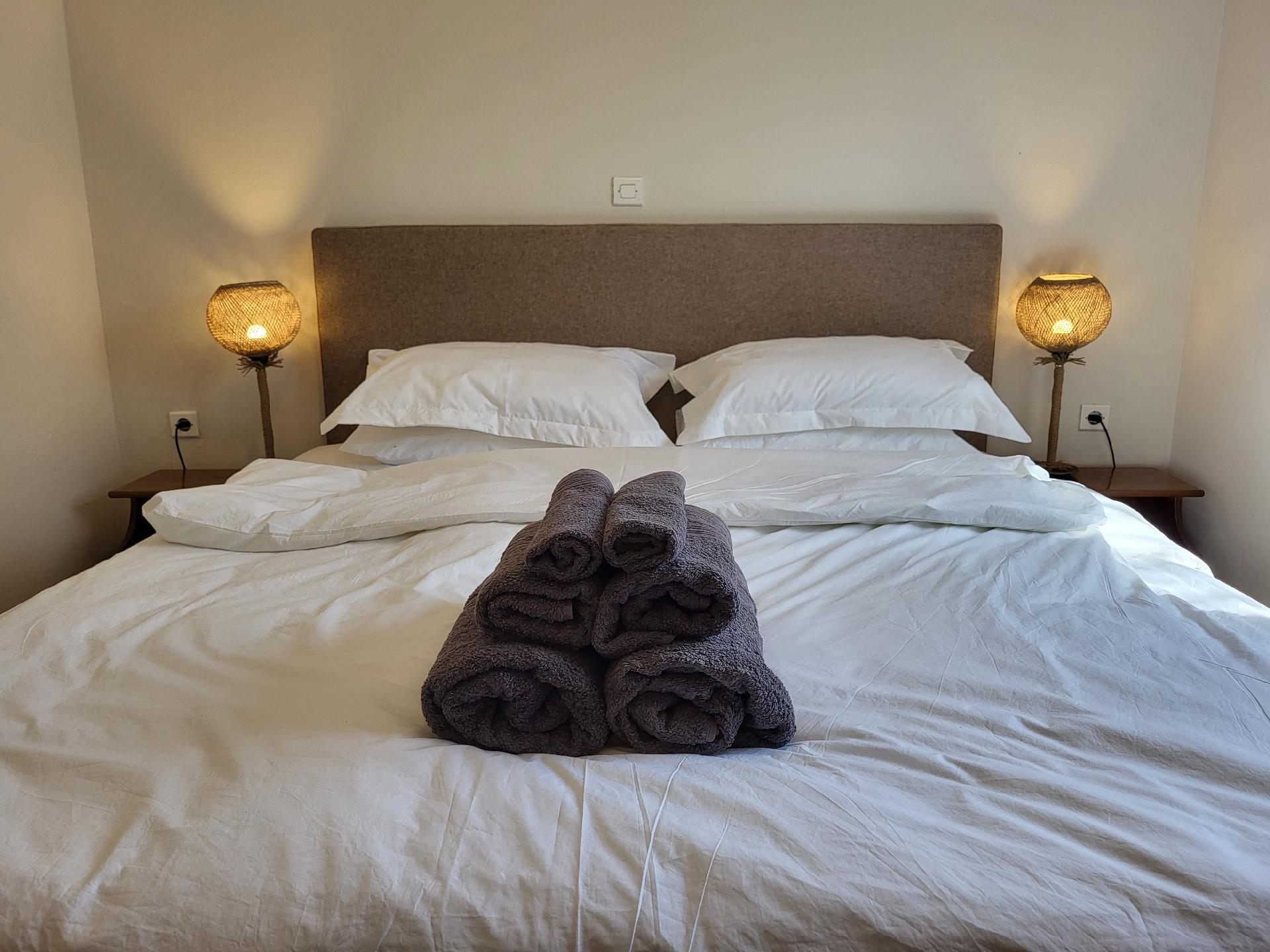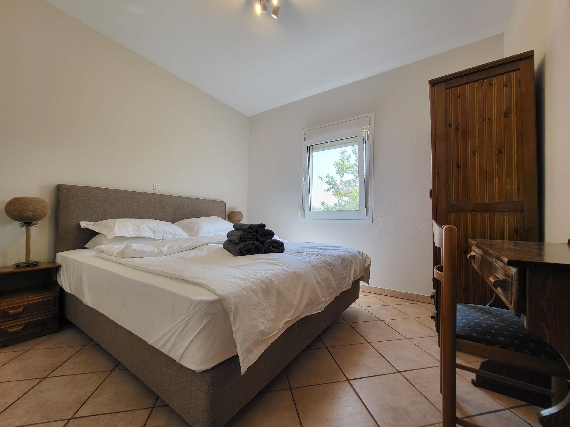 Die Wohnfläche von ca. 60 m² verteilt sich auf einen kombinierten Wohn- und Essbereich mit voll ausgestatteter Küchenzeile, zwei Schlafzimmer und ein angrenzendes Badezimmer mit Dusche, Waschbecken, Föhn und Toilette. Im hellen Wohn- und Esszimmer erwarten Sie eine bequeme Couch und ein Flachbildfernseher sowie eine gemütliche Essecke. Neben einem Zwei-Platten-Herd, einem Backofen, einem Kühlschrank mit Gefrierfach, einer Filter-Kaffeemaschine und einem Wasserkocher findet sich im Kochbereich eine Waschmaschine zur kostenfreien Nutzung. Das erste Schlafzimmer ist mit einem komfortablen Bett (1,80 m Breite) ausgestattet, während das zweite Schlafzimmer über zwei Einzelbetten (je 0,90 m Breite) verfügt. Bei Bedarf wird ein Babybett gratis bereitgestellt. Für ein angenehmes Raumklima sorgt Klimaanlage bzw. ein Ventilator. WLAN nutzen Sie in der gesamten Unterkunft kostenfrei.