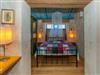 Das Hauptdoppelbettzimmer im Zwischengeschoss ist durch eine vergitterte Holztafel abgetrennt.