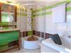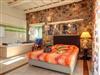 Schlafzimmer mit Doppelbett und eigenem Bad mit Whirlpool und Dusche.