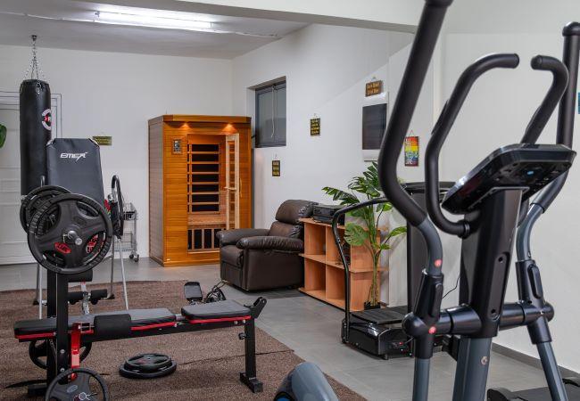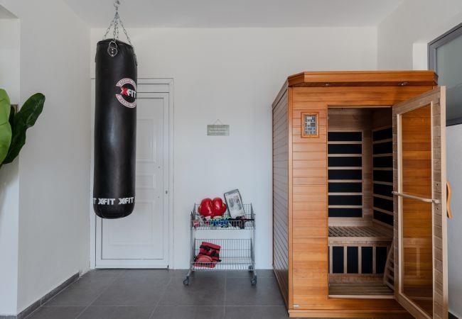 laden an warmen Tagen zum Erfrischen ein, während die umliegende Terrasse viel Platz bietet, um sich zu sonnen und zu entspannen. Für Gäste, die einen aktiven Urlaub bevorzugen, bietet die Villa zudem ein gut ausgestattetes Fitnessstudio und eine Sauna, was für eine ausgewogene Mischung aus Freizeit und Fitness sorgt. Kinder können im Gartenbereich verschiedene Spiele genießen, während die Erwachsenen am Abend den Grill nutzen und sich im Garten bei den Gartenmöbeln entspannen können. Der Pool kann auf Anfrage in den Monaten April, Mai sowie Oktober und November beheizt werden. Der Aufpreis für die Beheizung beträgt 100€ pro Tag.