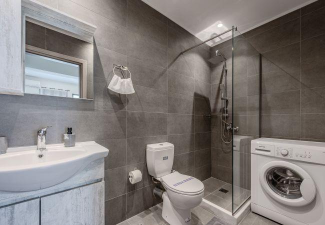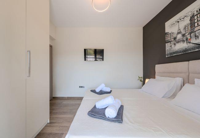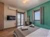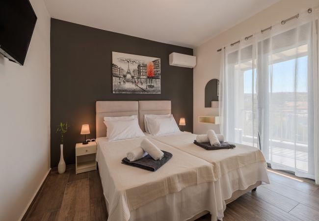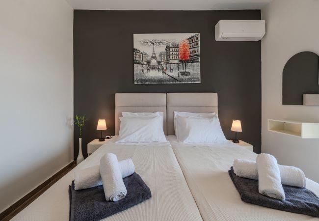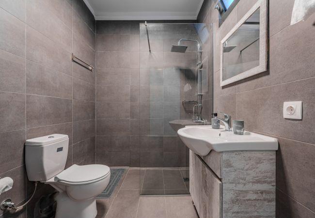 Eine elegante Innentreppe führt in das Obergeschoss, wo sich drei geschmackvoll eingerichtete Schlafzimmer befinden. Das Hauptschlafzimmer bietet ein komfortables Doppelbett, Klimaanlage und ein eigenes Bad mit Dusche und WC, das Privatsphäre und Luxus bietet. Die anderen beiden Schlafzimmer verfügen jeweils über zwei Einzelbetten – perfekt für Kinder oder Freunde. Diese Zimmer teilen sich ein geräumiges Badezimmer mit Dusche und WC. Alle Schlafzimmer haben private Balkone mit einem ruhigen Ausblick auf die Umgebung und sind mit Klimaanlagen ausgestattet, um in jeder Jahreszeit für Komfort zu sorgen.