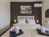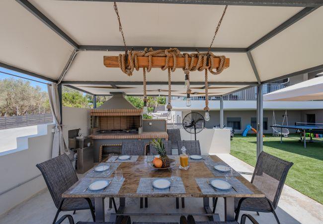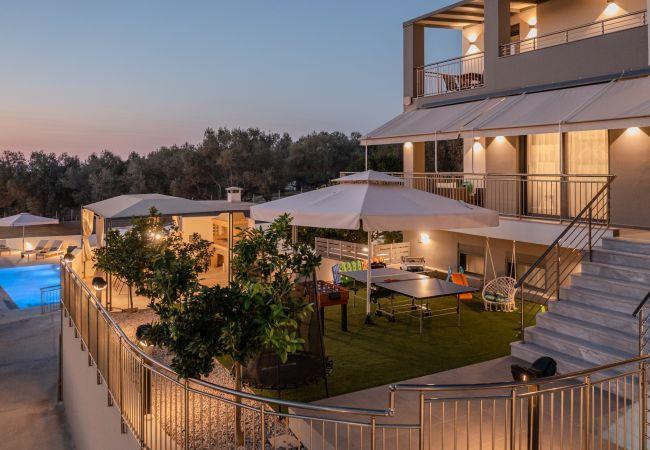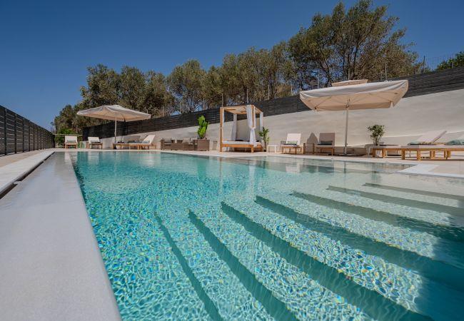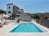 Auch der Außenbereich der Villa ist beeindruckend. Auf der Höhe des Pools gibt es zusätzliche Unterkünfte, darunter ein Studio mit zwei Einzelbetten und ein Ein-Zimmer-Apartment mit einem Doppelbett. Beide verfügen über eine kleine Küche für zusätzlichen Komfort. Der große Swimmingpool sowie ein separater Kinderpool (beide natürlich mit Salz gechlort)