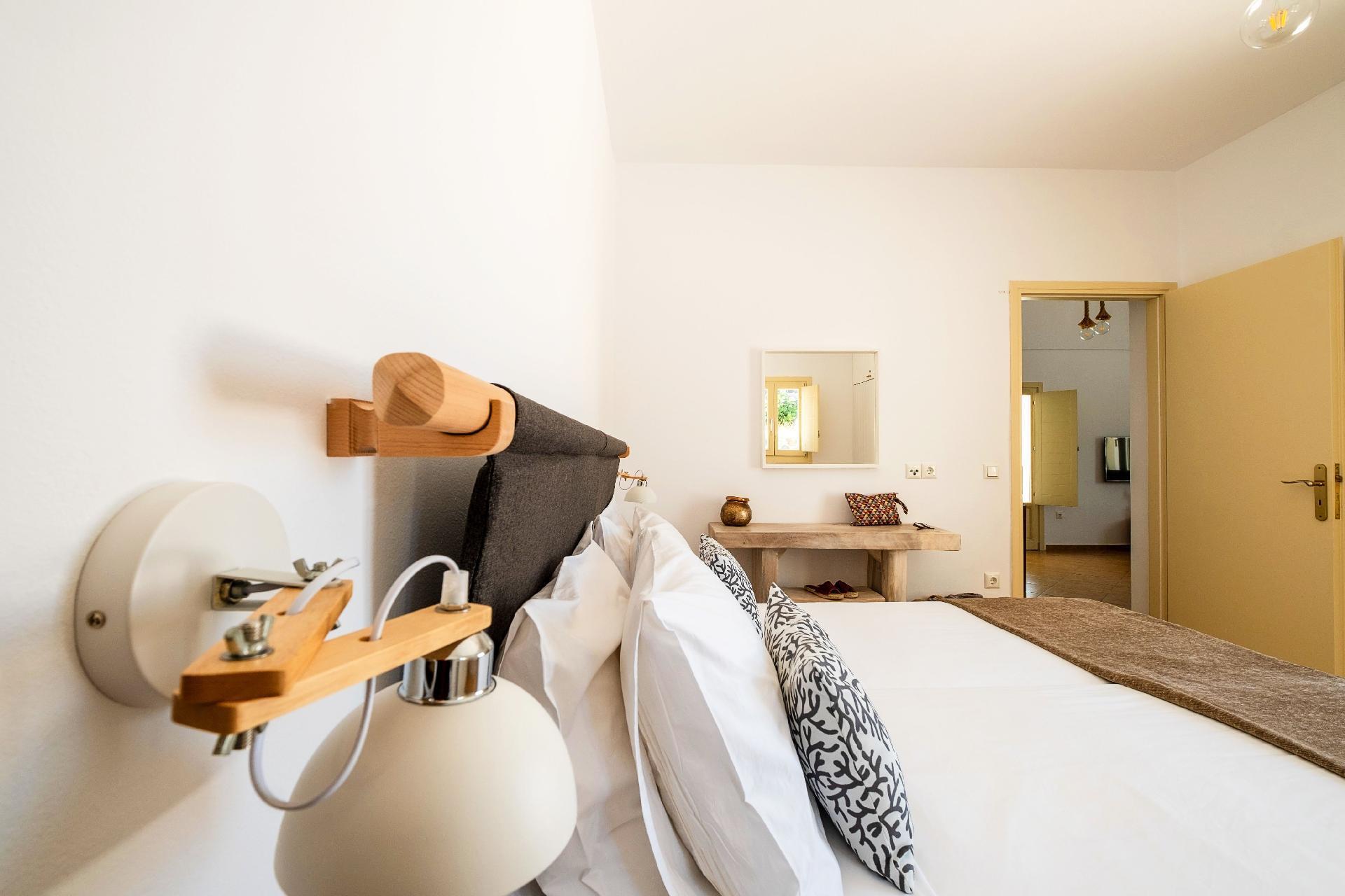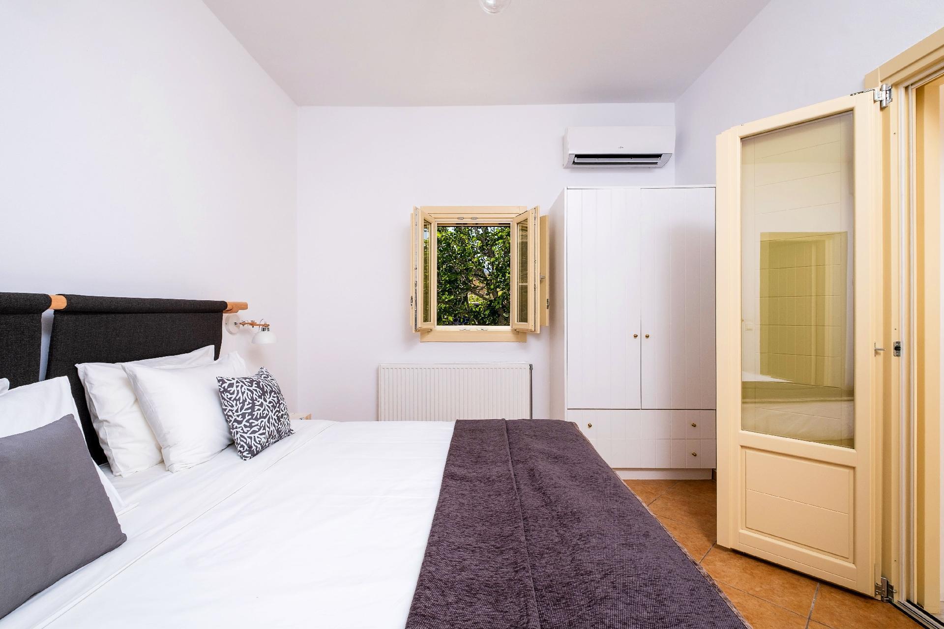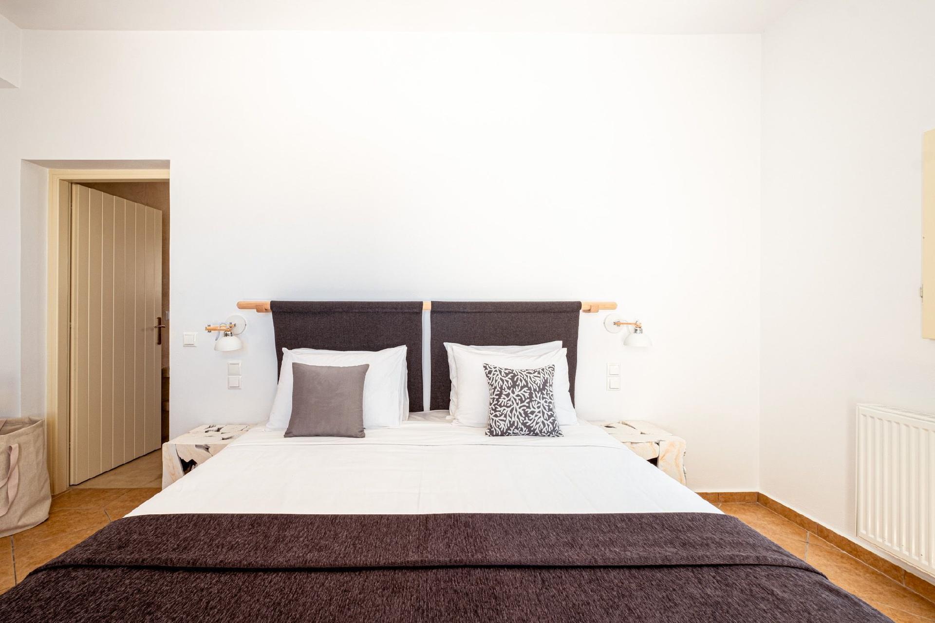 Das zweite Schlafzimmer mit eigenem Bad und Dusche verfügt über zwei Einzelbetten, die zu einem Kingsize-Bett zusammengestellt werden können. Es ist mit modernen hellen Holzmöbeln ausgestattet und bietet die gleichen Annehmlichkeiten wie das Hauptschlafzimmer sowie einen herrlichen Blick auf das Ägäische Meer und das historische mittelalterliche Dorf Pyrgos.