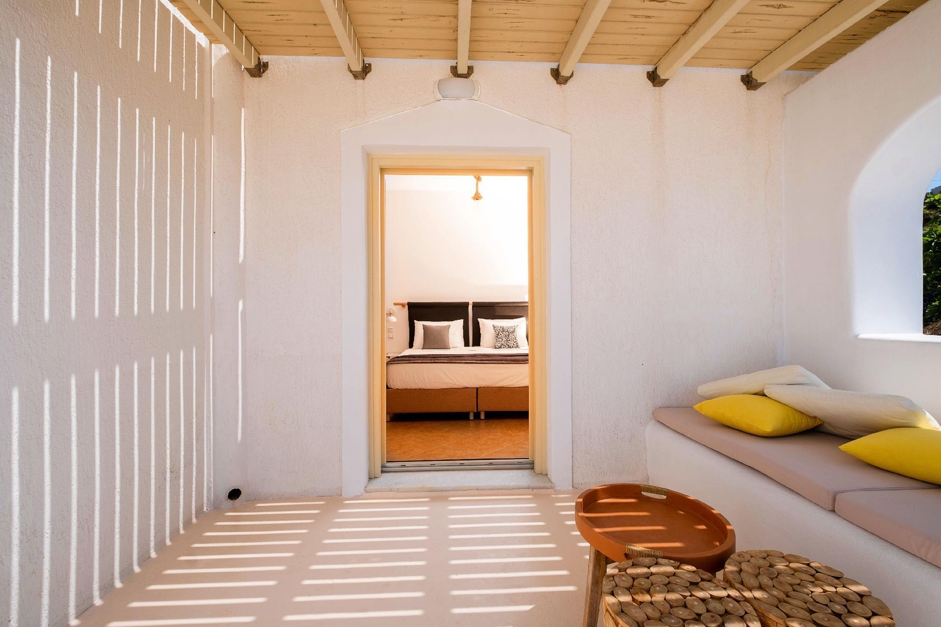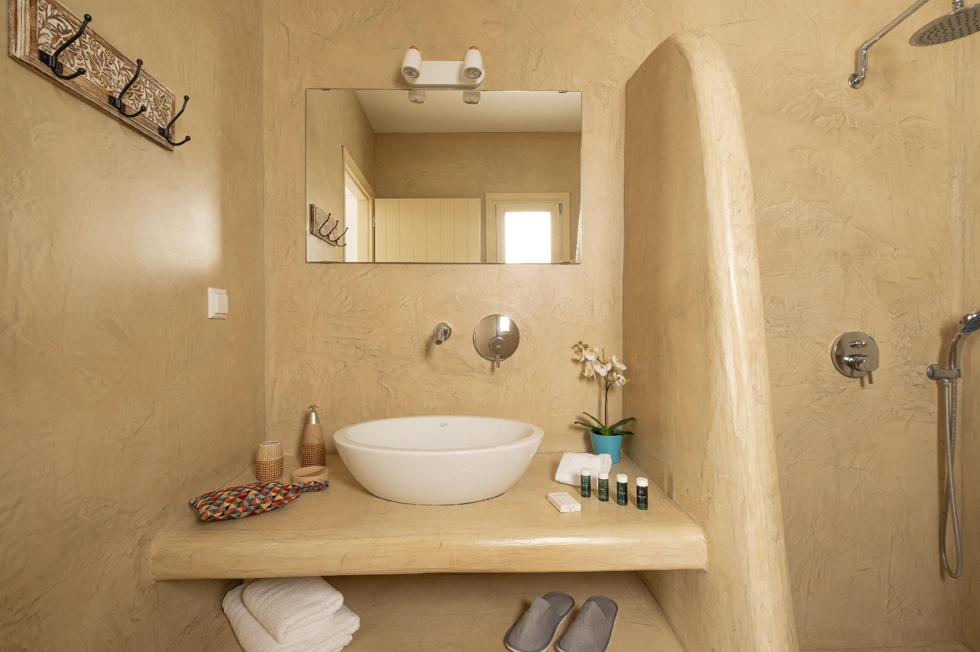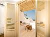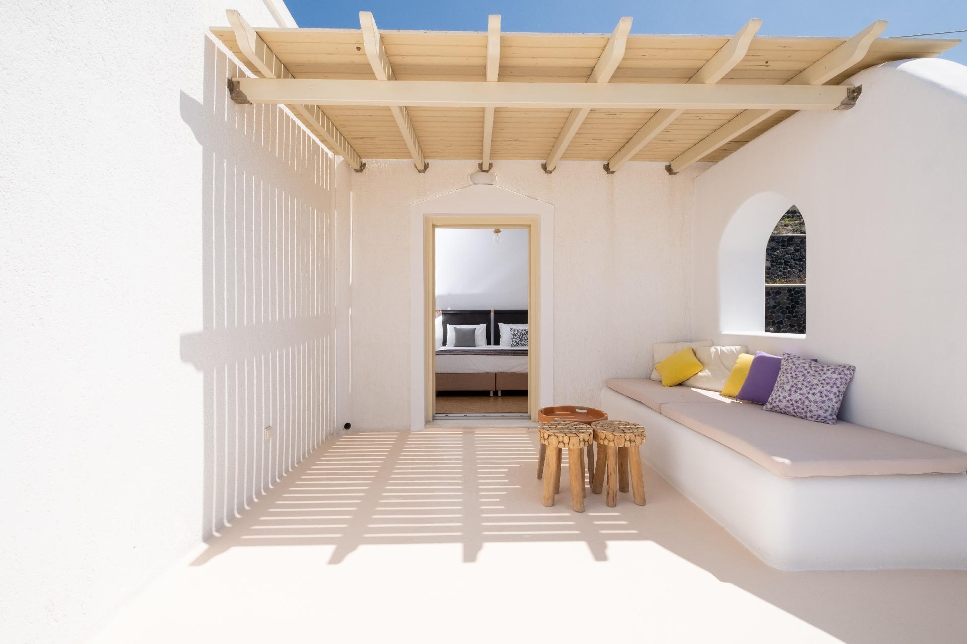 Das dritte Schlafzimmer hat ebenfalls ein eigenes Bad und ist mit zwei Einzelbetten ausgestattet (die zu einem Kingsize-Bett zusammengestellt werden können). Dieses Zimmer ist mit eleganten hellen Holzmöbeln ausgestattet, hat direkten Zugang zum Pool und bietet eine eigene private Veranda mit Sitzgelegenheiten im Freien, die einen spektakulären Blick auf die Caldera und das Ägäische Meer bietet.