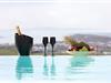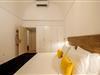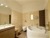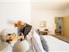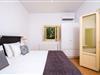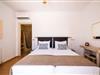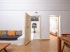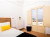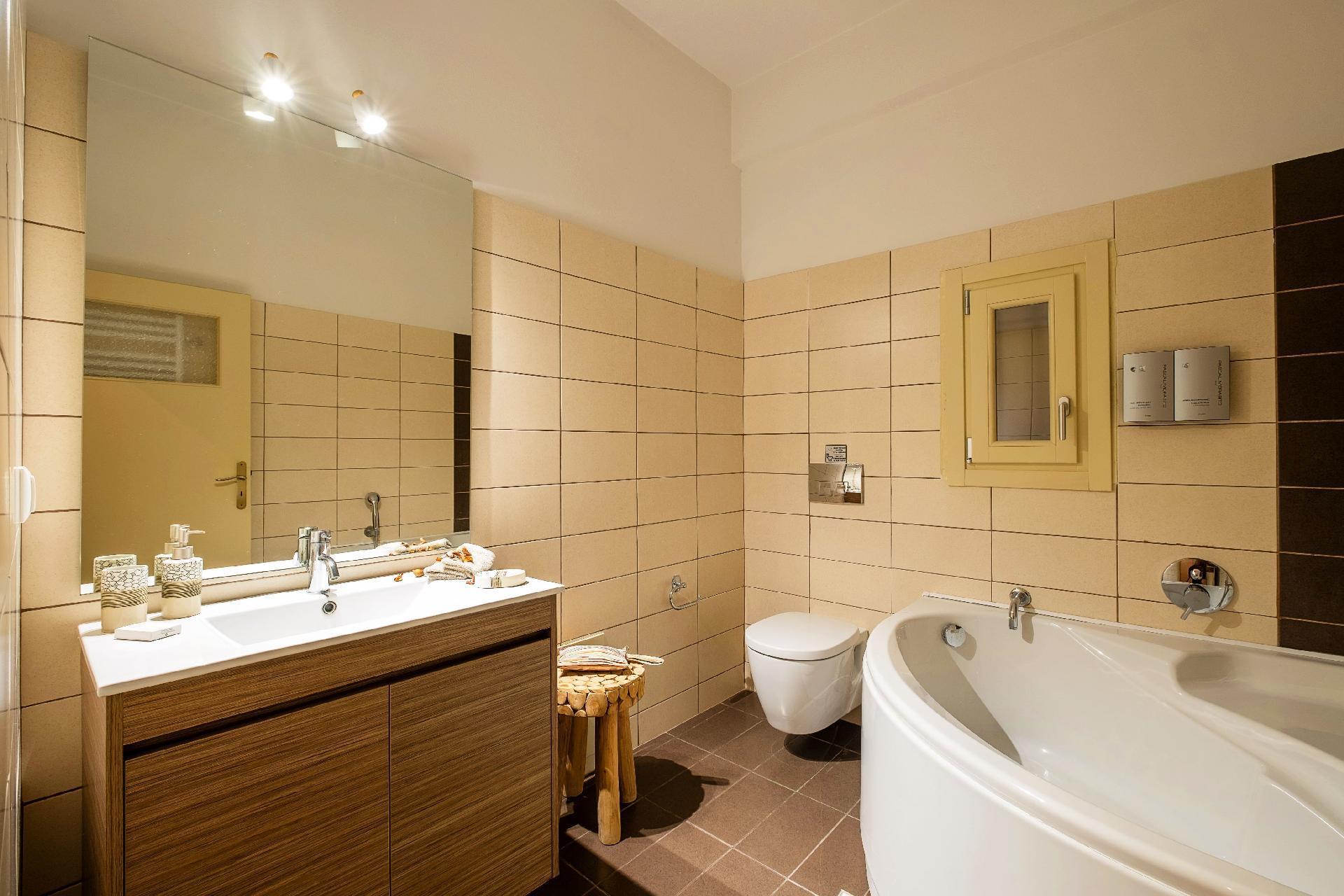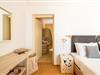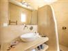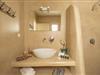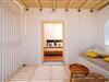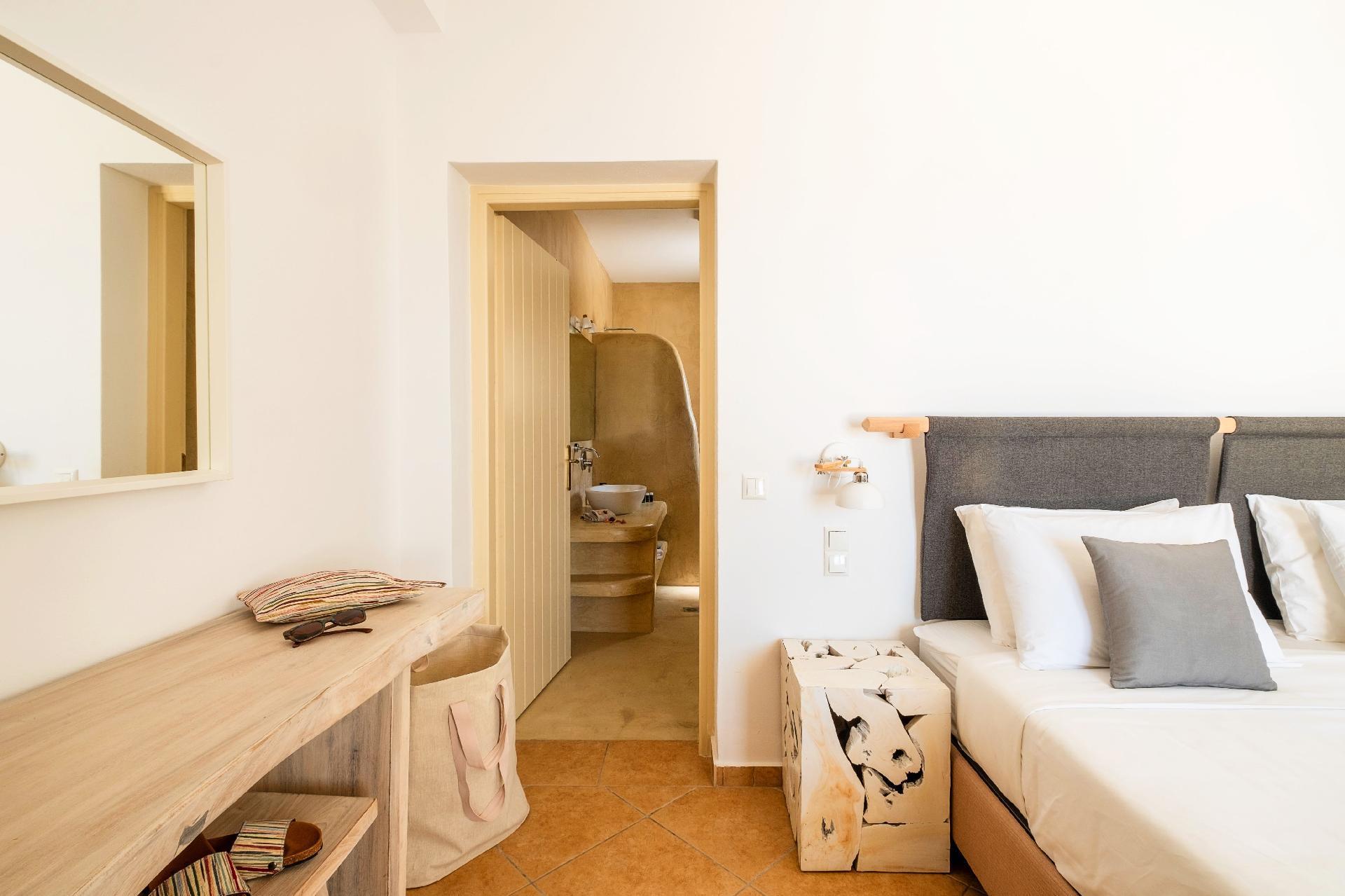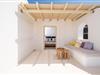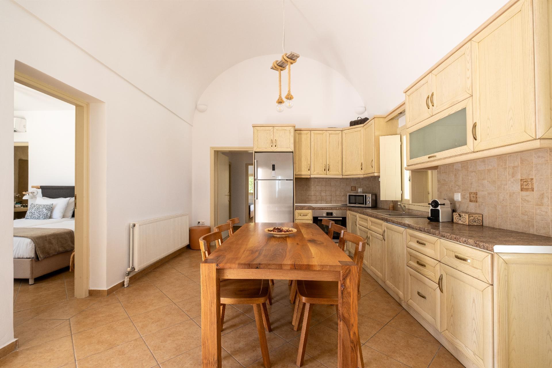 Das dritte Schlafzimmer hat ebenfalls ein eigenes Bad und ist mit zwei Einzelbetten ausgestattet (die zu einem Kingsize-Bett zusammengestellt werden können). Dieses Zimmer ist mit eleganten hellen Holzmöbeln ausgestattet, hat direkten Zugang zum Pool und bietet eine eigene private Veranda mit Sitzgelegenheiten im Freien, die einen spektakulären Blick auf die Caldera und das Ägäische Meer bietet.