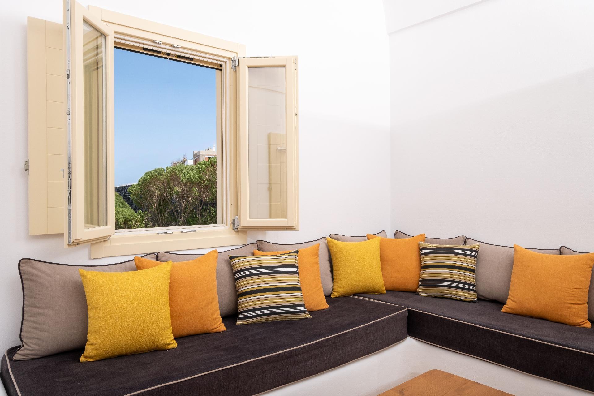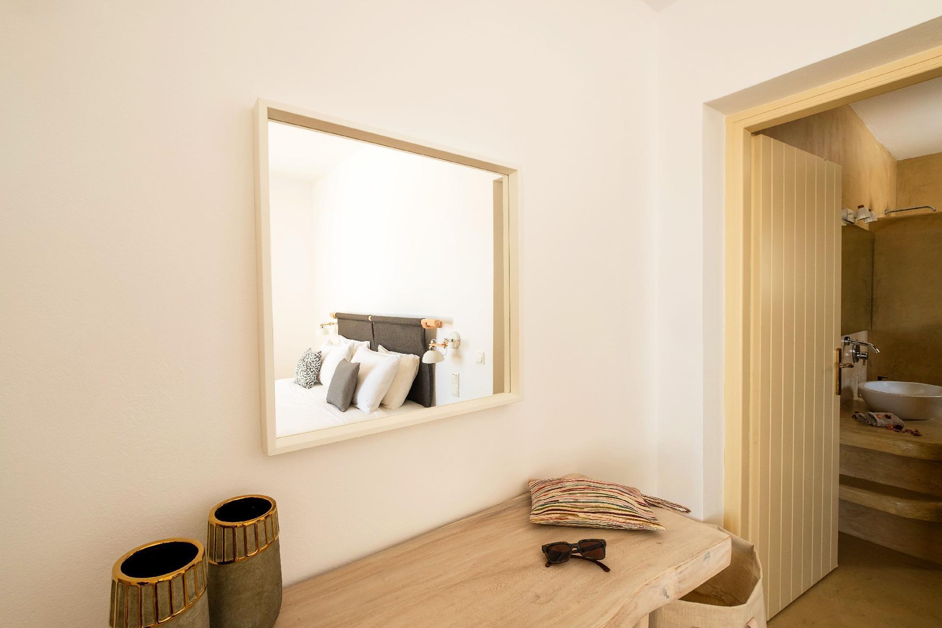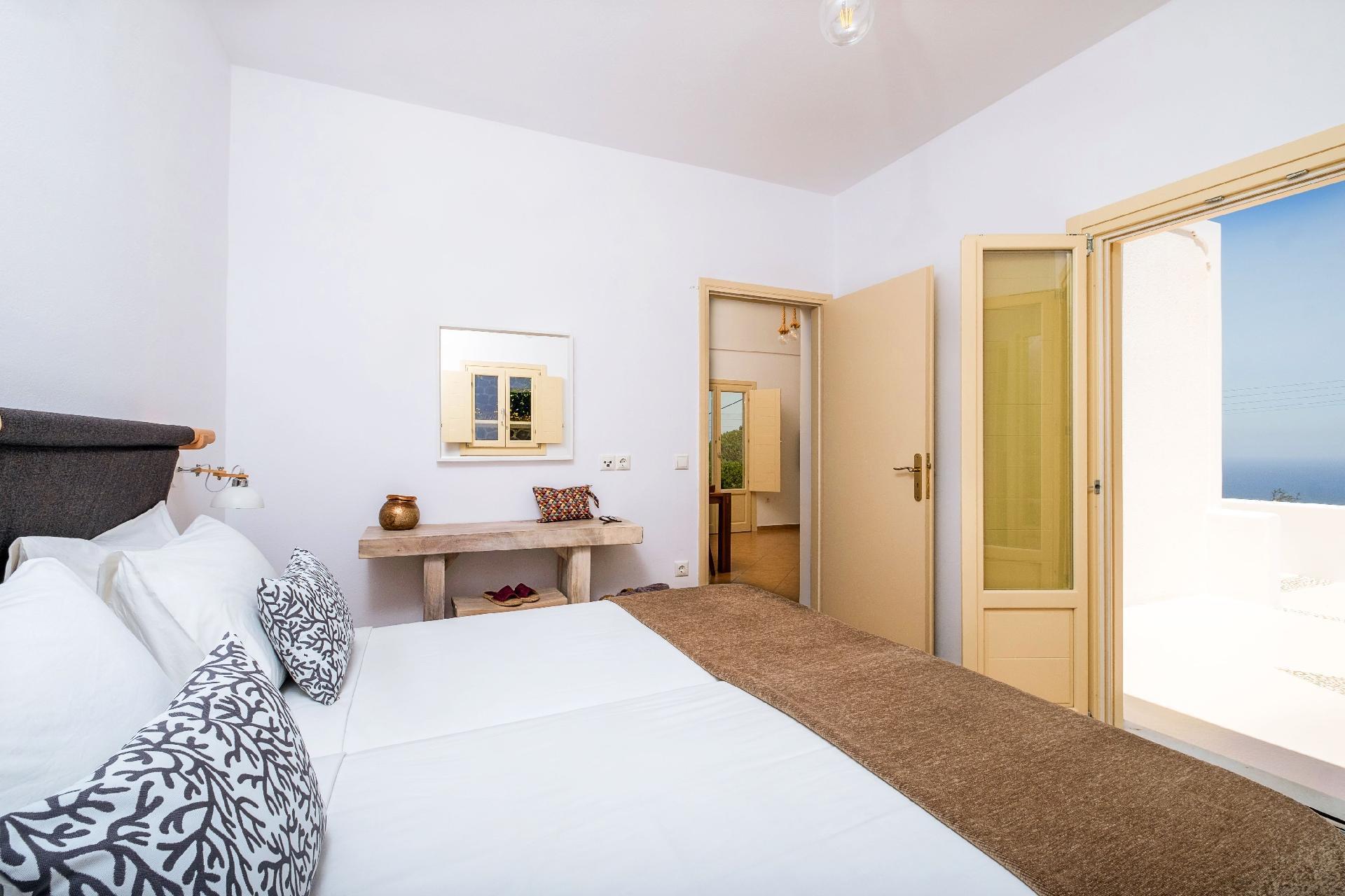 Das Hauptschlafzimmer verfügt über ein Kingsize-Bett, elegante Möbel, eine Kommode mit passendem Spiegel, eine Klimaanlage, einen geräumigen Kleiderschrank und einen direkten Zugang zum Pool. Von diesem Zimmer aus haben Sie außerdem einen atemberaubenden Blick auf die Caldera und das Ägäische Meer.