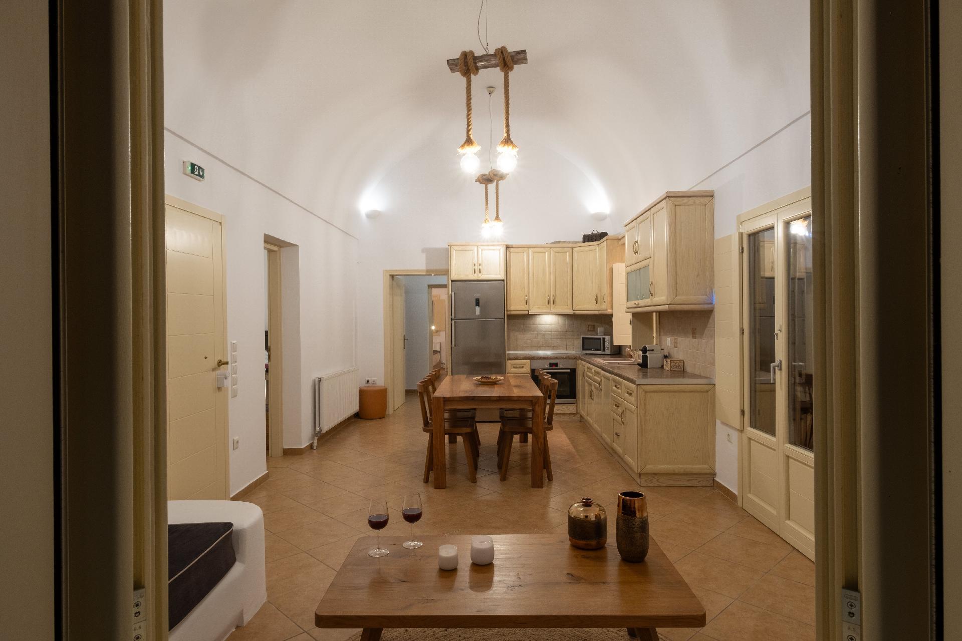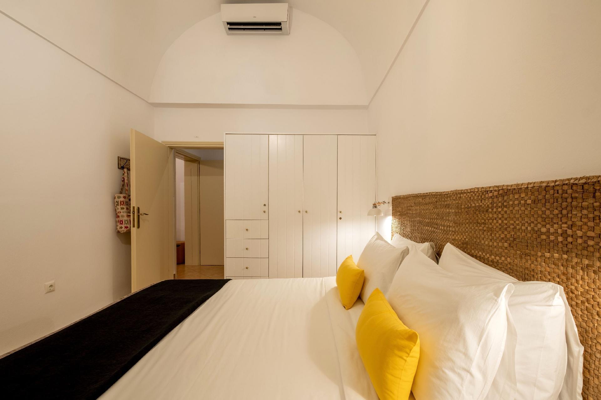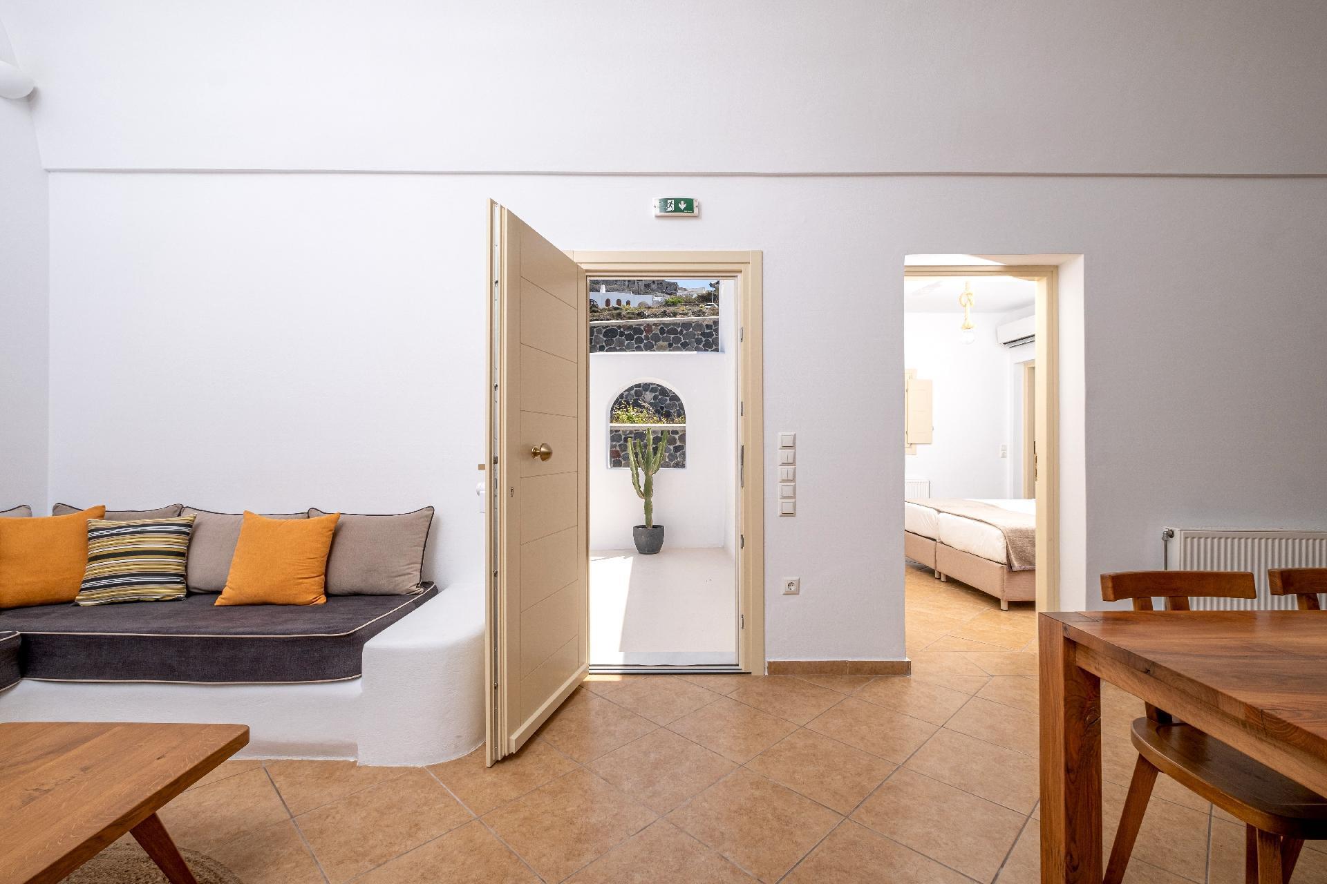 Das Hauptschlafzimmer verfügt über ein Kingsize-Bett, elegante Möbel, eine Kommode mit passendem Spiegel, eine Klimaanlage, einen geräumigen Kleiderschrank und einen direkten Zugang zum Pool. Von diesem Zimmer aus haben Sie außerdem einen atemberaubenden Blick auf die Caldera und das Ägäische Meer.