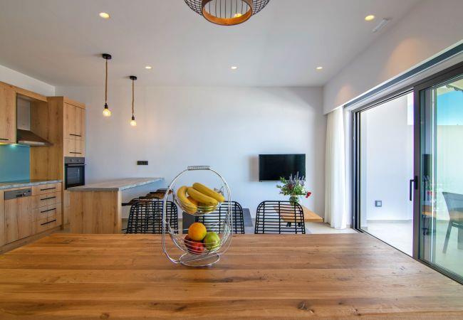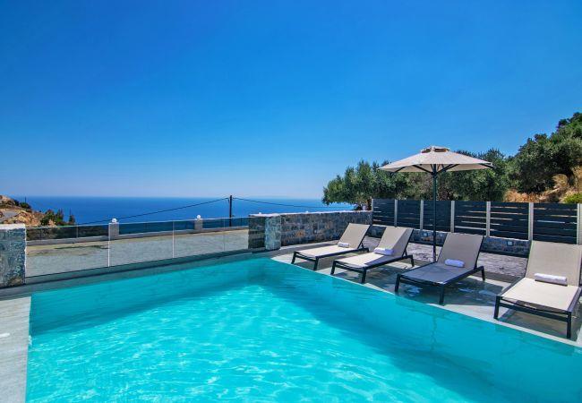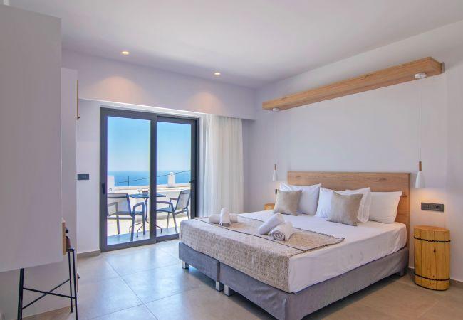 Petasos Villa hat eine Gesamtfläche von 80 qm und verfügt über 2 Schlafzimmer und 2 Badezimmer. Im Erdgeschoss befindet sich ein Schlafzimmer mit zwei Einzelbetten, die zu einem Doppelbett umgewandelt werden können, sowie ein eigenes Bad mit einer geräumigen Dusche und WC. Darüber hinaus finden Sie einen wunderschönen offenen Wohn- und Essbereich, der an eine voll ausgestattete moderne Küche angeschlossen ist. Diese Ebene verfügt über große französische Fenster, die zu einer geräumigen Veranda mit Terrassenmöbeln führen und einen herrlichen Blick auf das Libysche Meer und die Umgebung bieten. Eine interne Treppe führt in das Obergeschoss, wo Sie das zweite Schlafzimmer und ein geräumiges Duschbad finden.