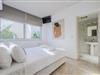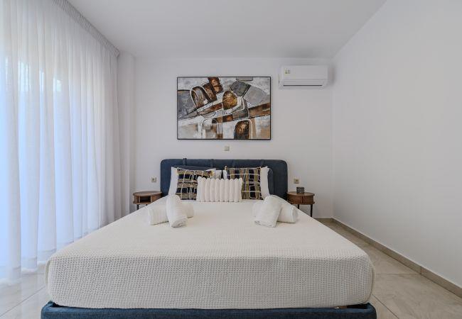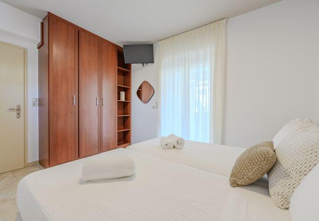 Das Obergeschoss bietet eine Vielzahl von Schlafmöglichkeiten, um allen Gästen gerecht zu werden. Das Hauptschlafzimmer ist ein Highlight und verfügt über ein Doppelbett, ein eigenes Badezimmer mit Dusche und Zugang zu einem gemeinsamen Balkon mit atemberaubendem Meerblick und Bergblick. Ein zweites Schlafzimmer hat zwei Einzelbetten, die zu einem Doppelbett umgewandelt werden können, und teilt sich ebenfalls den Balkon mit dem Hauptschlafzimmer. Das dritte Schlafzimmer in diesem Stockwerk hat ein Doppelbett und einen privaten Balkon mit Meerblick, der einen ruhigen Rückzugsort bietet. Ein gemeinsames Badezimmer mit Badewanne dient dem zweiten und dritten Schlafzimmer und bietet einen luxuriösen und funktionalen Entspannungsraum.