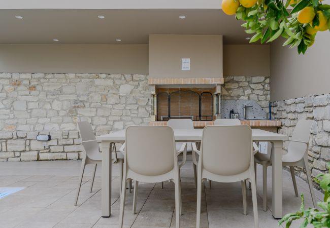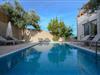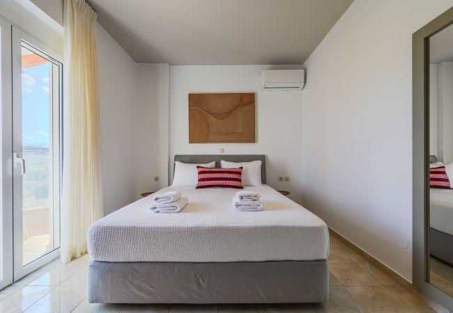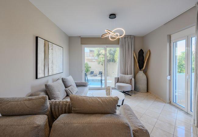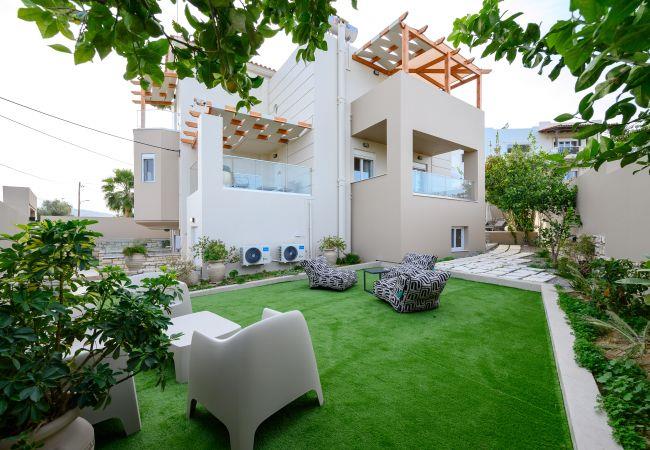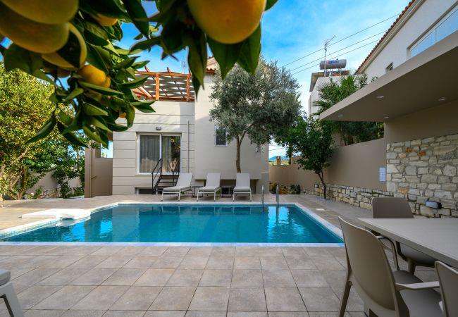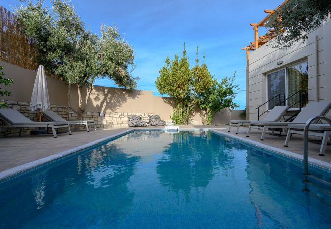 Die Außenbereiche der Villa sind so gestaltet, dass sie die natürliche Schönheit Kretas optimal nutzen. Im Zentrum befindet sich ein privater Pool, umgeben von Sonnenliegen und Sonnenschirmen, perfekt zum Sonnen in der mediterranen Sonne. Der Poolbereich ist nachts wunderschön beleuchtet und schafft eine bezaubernde Atmosphäre für Abendchwimmen oder entspannte Zusammenkünfte. Balkone und Terrassen im gesamten Anwesen bieten Sitzgelegenheiten mit Panoramablick auf Meer und Berge. Der bepflanzte Garten verleiht der Umgebung zusätzlichen Charme, während ein eigener Außenessbereich die Gäste einlädt, unter den Sternen Mahlzeiten im Freien zu genießen.