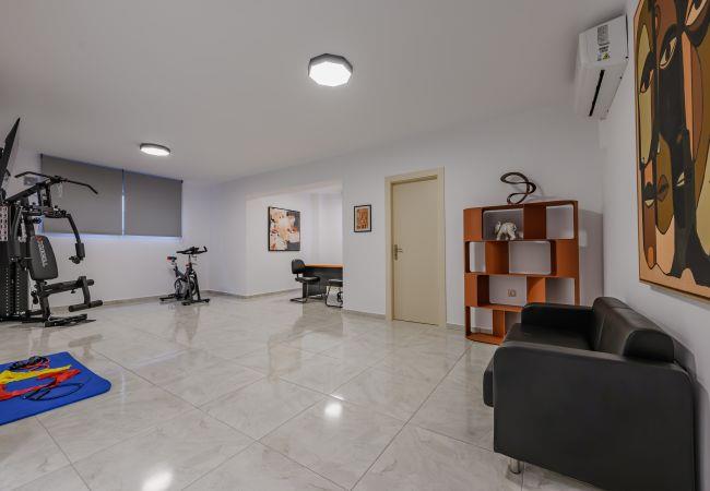 Die Villa hat einen dreigeschossigen Grundriss, der über eine interne Treppe miteinander verbunden ist. Das Untergeschoss der Villa ist sorgfältig für Aktivität und Entspannung gestaltet. Es verfügt über ein voll ausgestattetes Fitnessstudio mit einer Vielzahl von Fitnessgeräten und einen privaten Bürobereich mit Schreibtisch, ergonomischem Stuhl, Drucker und einem 55-Zoll-Smart-TV, so dass Sie nach Bedarf arbeiten oder entspannen können. In diesem Stockwerk befinden sich zwei Schlafzimmer: eines mit zwei Einzelbetten, die zu einem Doppelbett umgewandelt werden können, und das andere mit einem Doppelbett. Diese Räume sind wunderschön gestaltet und bieten viel Stauraum. Auf dieser Ebene befindet sich auch ein gemeinsames Badezimmer mit einer luxuriösen Badewanne, das Komfort und Bequemlichkeit bietet.