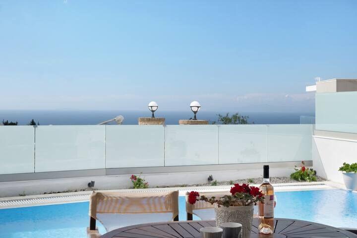 Der Außenbereich ist perfekt für entspannende Momente und bietet einen privaten Swimmingpool, eine bequeme Sitzecke, einen Grill und einen atemberaubenden Blick auf das Ionische Meer und den Sonnenuntergang.