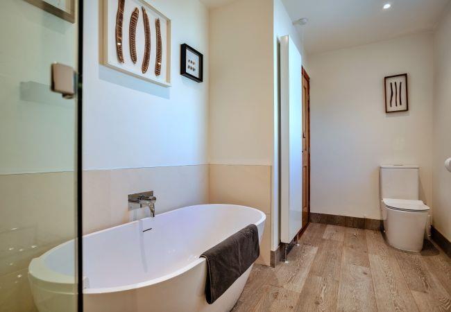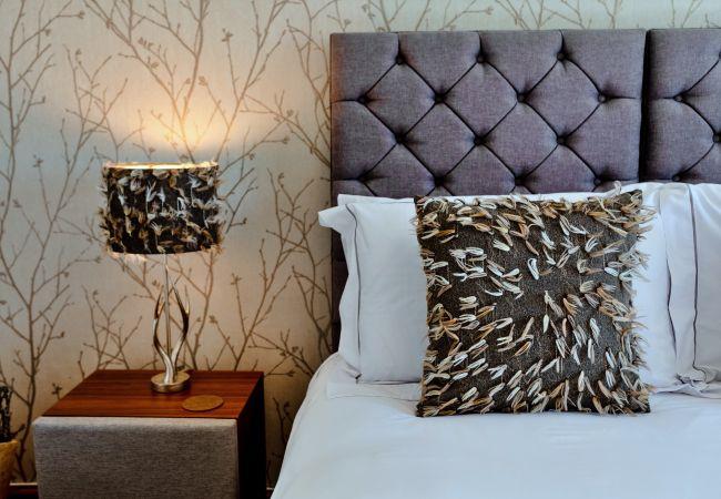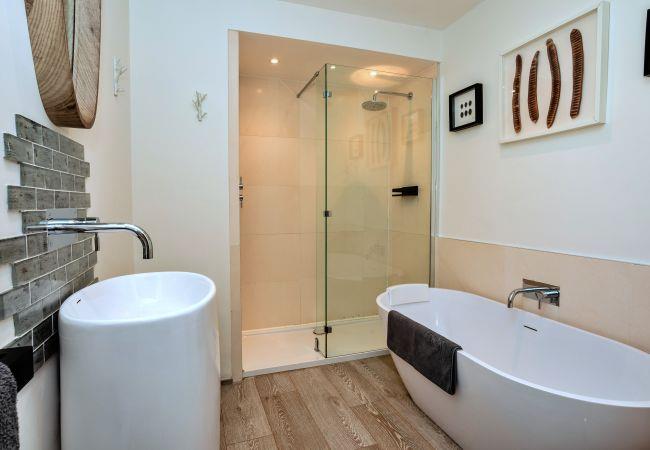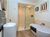 The first bedroom features a luxurious 6' super king-size bed, along with hooks for hanging space and a stylish chest of drawers. The second bedroom offers versatile sleeping arrangements with zip-and-link beds, which can be configured as a king-size or two 2'6" twin beds to suit your needs, also complemented by hanging space and a chest of drawers. The elegant bathroom boasts a bespoke bathtub, a spacious walk-in shower with a rainforest showerhead, a sleek basin, and a WC.