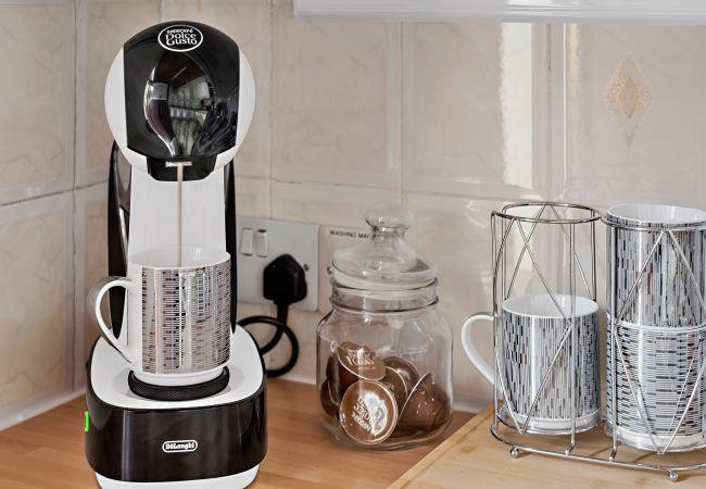 Die Küche ist ausgestattet mit Kühlschrank, Mikrowelle, Backofen, Gefrierschrank, Geschirr/Besteck, Kochutensilien, Toaster und Wasserkocher.