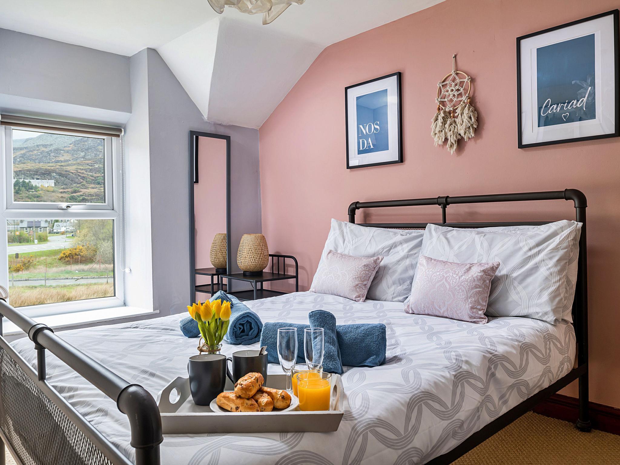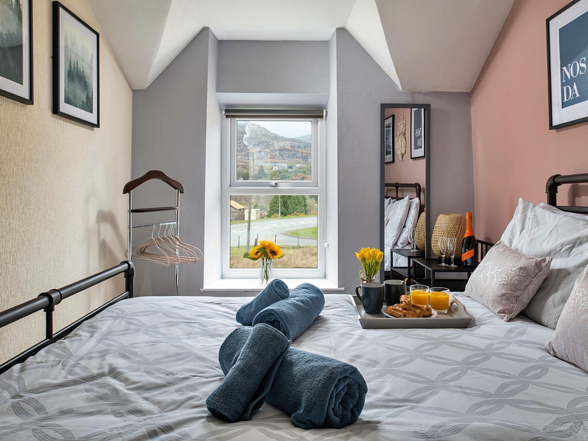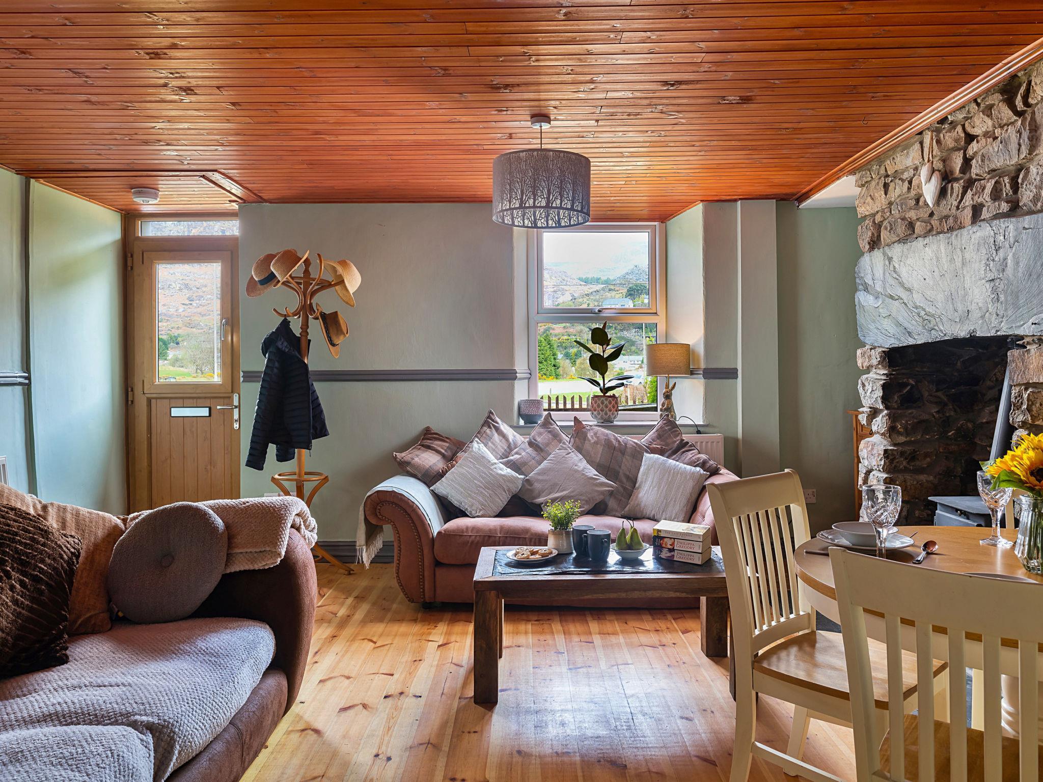 "Maes Neuadd", 3-Zimmer-Haus 120 m2. Objekt geeignet für 4 Erwachsene. Wohnzimmer mit offenem Kamin. 1 Zimmer mit 1 Doppelbett. 1 Zimmer mit 1 x 2 Etagenbetten. Küche (Backofen, Geschirrspüler, Toaster, Wasserkocher, Mikrowelle, Tiefkühler). Dusche/WC. Sicht auf die Berge und den Garten. Zur Verfügung: Waschmaschine, Bügeleisen. Internet (WLAN, gratis). Parkplatz (2 Autos). Bitte beachten: Nichtraucher-Unterkunft.