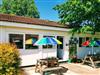 Außerhalb des Beaches Chalet gibt es eine private Terrasse mit Holzbank und Sitzgelegenheiten. Diese führt zu einer großen gemeinschaftlichen Rasenfläche.