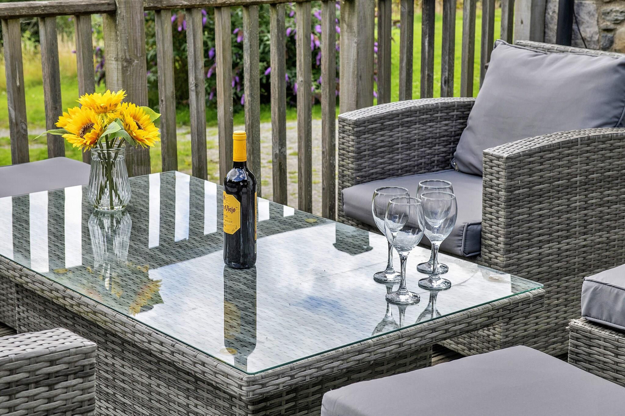 Erleben Sie einen ruhigen Zufluchtsort im Herzen des atemberaubenden Conwy Valley, wo Ruhe und atemberaubende Ausblicke aufeinander treffen und den ultimativen Kurzurlaub schaffen. Dieses charmante Ferienhaus liegt hoch über dem Dorf Eglwysbach und bietet eine einzigartige Gelegenheit, in die natürliche Schönheit Nordwales und den majestätischen Snowdonia-Nationalpark einzutauchen. Mit fantastischen Ausblicken um Sie herum fühlt sich jeder hier verbrachte Moment wie ein Rückzug in ein friedliches Paradies an. Nachdem Sie einen Tag voller Erkundungen der nahegelegenen Wanderwege oder einer Radtour durch malerische Landschaften verbracht haben, entspannen Sie sich im luxuriösen Whirlpool, der perfekt positioniert ist und spektakuläre Ausblicke auf das nach Südwesten ausgerichtete Tal und die majestätischen Bergketten Carneddau und Snowdonia bietet. Das wohltuende Wasser des Whirlpools lädt zum Entspannen unter den Sternen oder zum Sonnenbaden im Schein eines Sonnenuntergangs ein und schafft so eine unvergleichliche Atmosphäre für Momente der Entspannung und der Verbundenheit mit der Natur. Im Inneren vereint diese wunderschön umgebaute Scheune modernen Komfort mit charmanten Charakterelementen, von hochwertigen Eichentüren bis hin zu maßgeschneiderten Tiffany-Leuchten und Natursteinböden, die durch Fußbodenheizung erwärmt werden. Genießen Sie ein gemütliches Frühstück in der stilvollen Küche, üppige Bäder in den eleganten Marmorbädern und gemütliche Abende in der einladenden Lounge, während Sie von den sanften Geräuschen der Natur umhüllt werden. Mit zwei sorgfältig gestalteten Schlafzimmern und umweltfreundlichen Einrichtungen sorgt dieser Rückzugsort dafür, dass jeder Aspekt Ihres Aufenthalts so angenehm und erholsamer ist wie die atemberaubende Landschaft, die Sie umgibt.