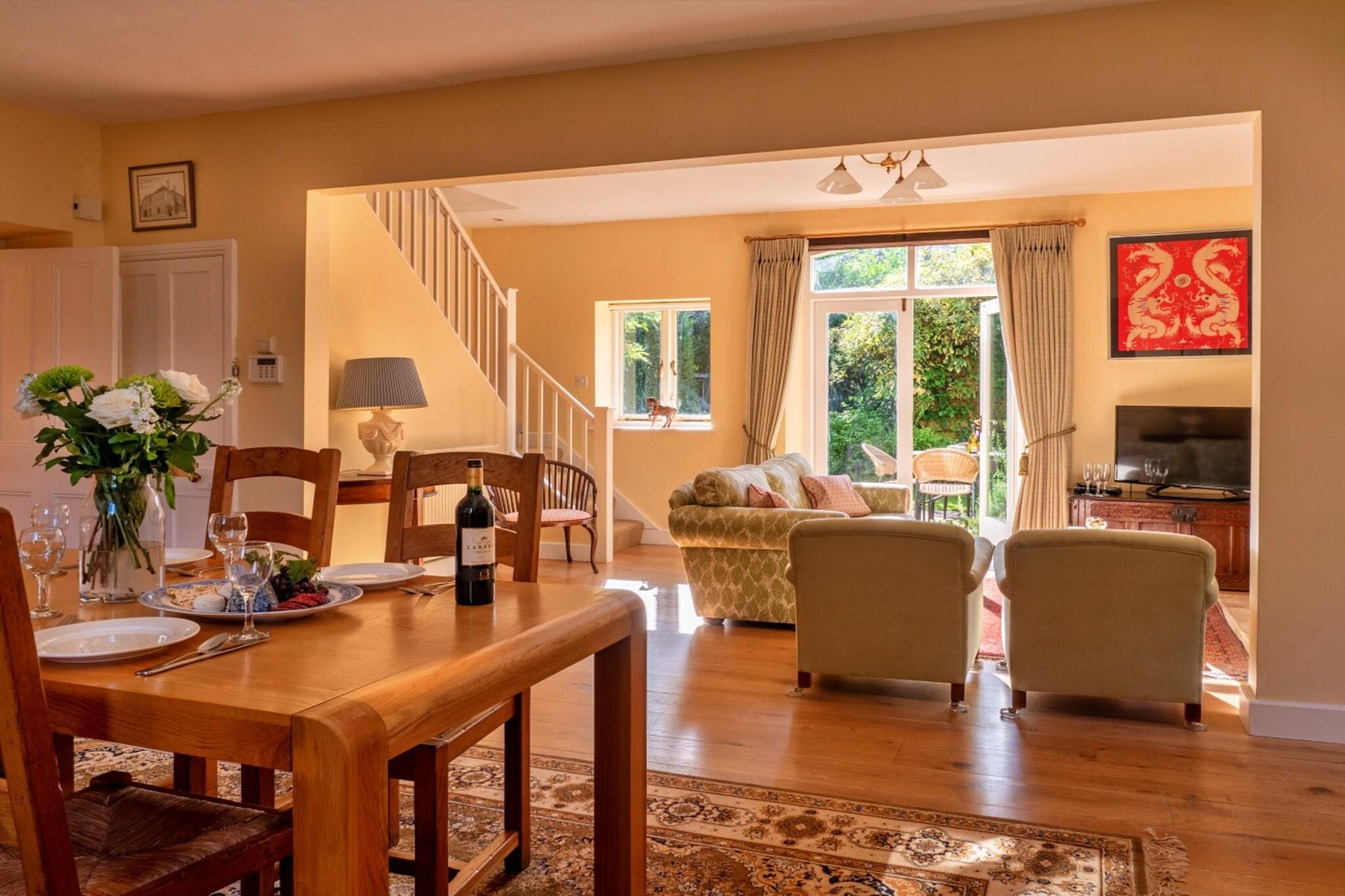 Dieses charmante, traditionelle Cotswold-Cottage ist der perfekte Rückzugsort für kleine Familien oder Paare und bietet eine Mischung aus historischem Charakter und modernem Komfort. Das Lodge Cottage bietet Platz für bis zu vier Gäste und verfügt über ein geräumiges Kingsize-Schlafzimmer mit Himmelbett und ein Zweibettzimmer, das zu einem Doppelbett verbunden werden kann. Die Unterkunft ist haustierfreundlich und heißt einen gut erzogenen Hund willkommen. Im Inneren finden Sie einen warmen Eichenboden, bequeme Sofas und einen einladenden offenen Kamin im offenen Wohnbereich. Französische Fenster führen in einen privaten, nach Süden ausgerichteten, ummauerten Garten mit Schaukel und Essbereich im Freien. Für zusätzlichen Komfort verfügt das Cottage über eine durchgehende Zentralheizung, die für Komfort während Ihres Aufenthalts sorgt. Das Lodge Cottage liegt ideal im malerischen Dorf Kingham, nur wenige Gehminuten vom Kingham Lodge House entfernt. Die Gegend eignet sich perfekt für die Erkundung der wunderschönen Cotswolds und bietet einfachen Zugang zur umliegenden Landschaft, zu charmanten Dörfern und zu nahe gelegenen Sehenswürdigkeiten. Gäste haben Zugang zu einem 5 Hektar großen Landschaftsgarten, der mit den anderen Cottages vor Ort geteilt wird. Für diejenigen, die Entspannung suchen, bietet das Anwesen private „Schwimmzeiten“ im Innenpool und sorgt so für exklusive Zeit mit der Familie. Darüber hinaus ist das Dorf Kingham für seine schönen lokalen Pubs, Geschäfte und malerischen Wanderwege bekannt. Die Unterkunft verfügt über eine gut ausgestattete Küche mit Geschirrspüler, Doppelbackofen, Mikrowelle und geräumigem Kühlschrank mit Gefrierfach, ideal für die Zubereitung von Mahlzeiten zu Hause. Der gemütliche Wintergarten bietet einen ruhigen Ort zum Frühstück oder Nachmittagstee, während der geräumige Essbereich Platz für 6–8 Gäste bietet.