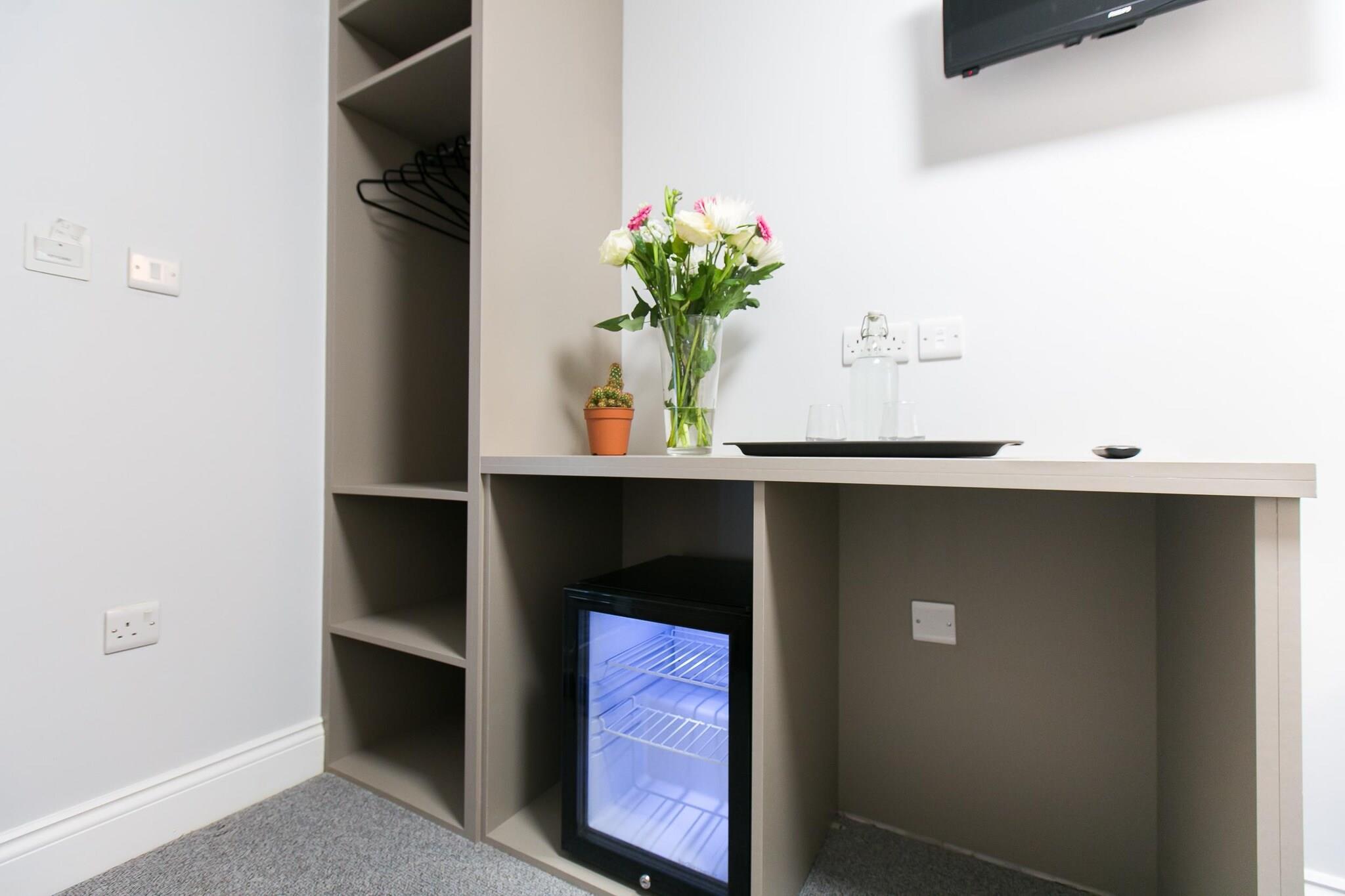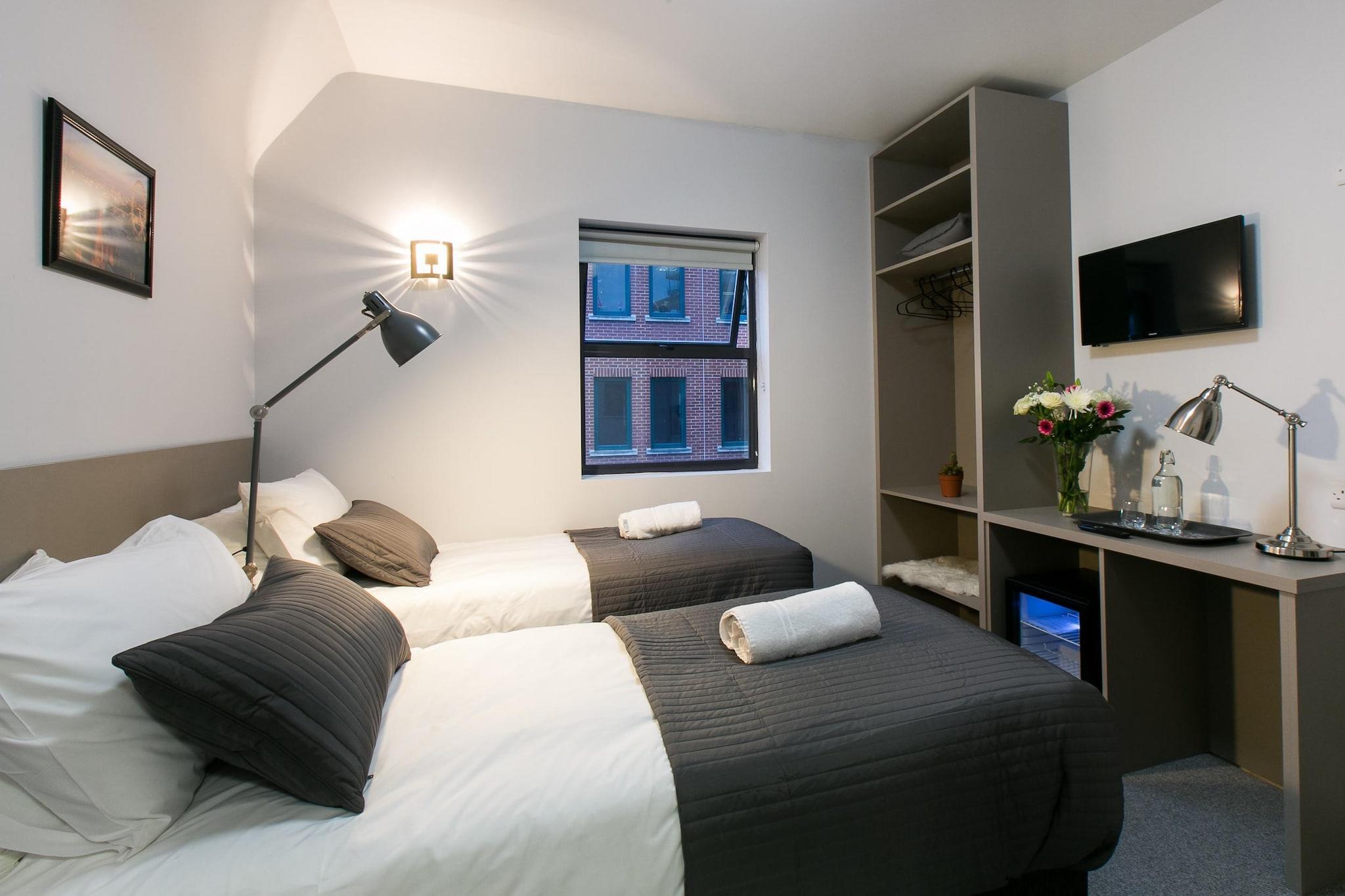Offene Küche(Wasserkocher), Schlafzimmer mit Badezimmer(Einzelbett, Einzelbett, Waschbecken, Toilette, Bügelbrett, Bügeleisen, Föhn, Handtücher inklusive, Bettwäsche inklusive, Handtücher/Bettwäsche (inklusive), ), Rezeption, Erste-Hilfe-Station, TV, Dusche, Bügelbrett, Alarmanlage, , , , , Carbon monoxide detector, Emergency exit, Long term stays allowed